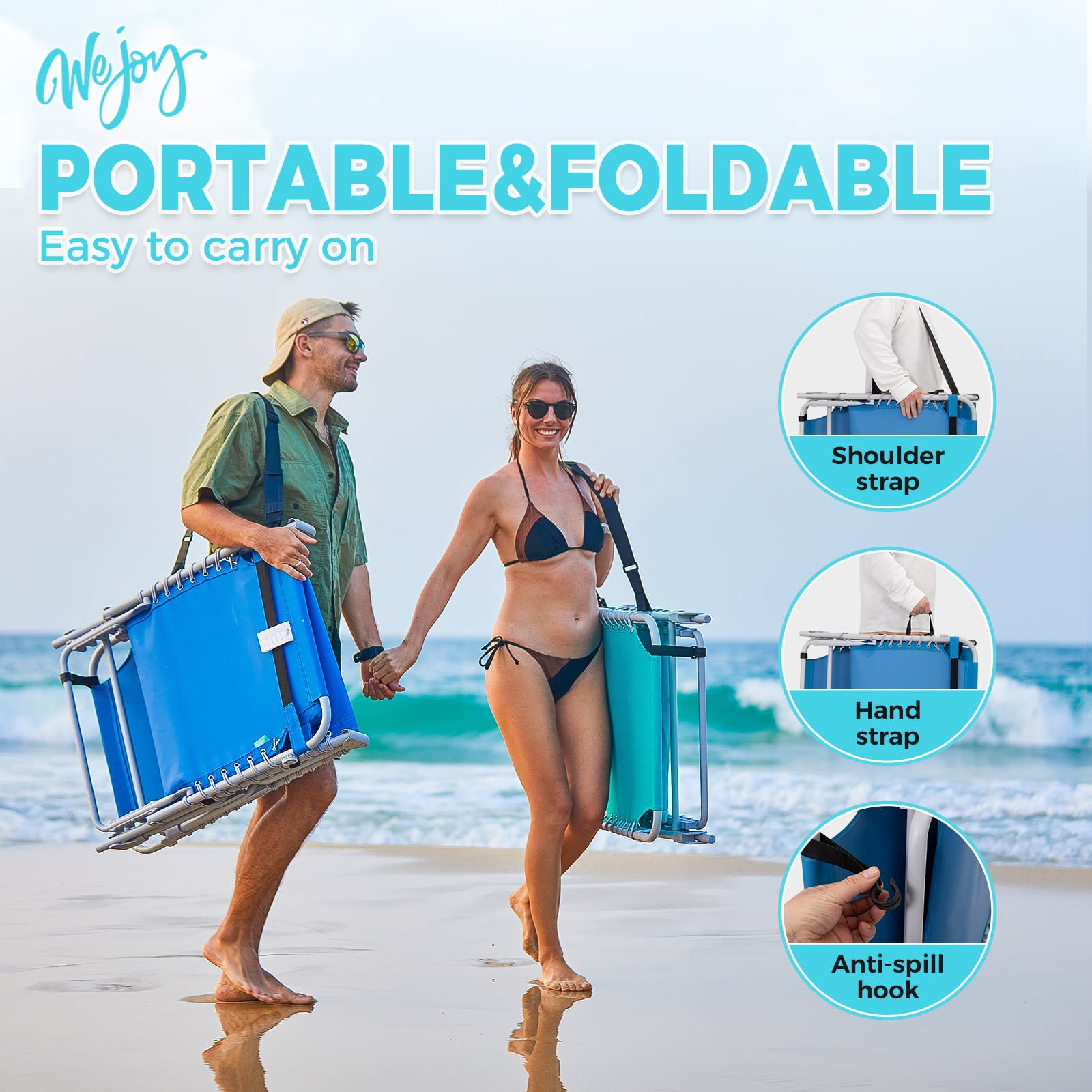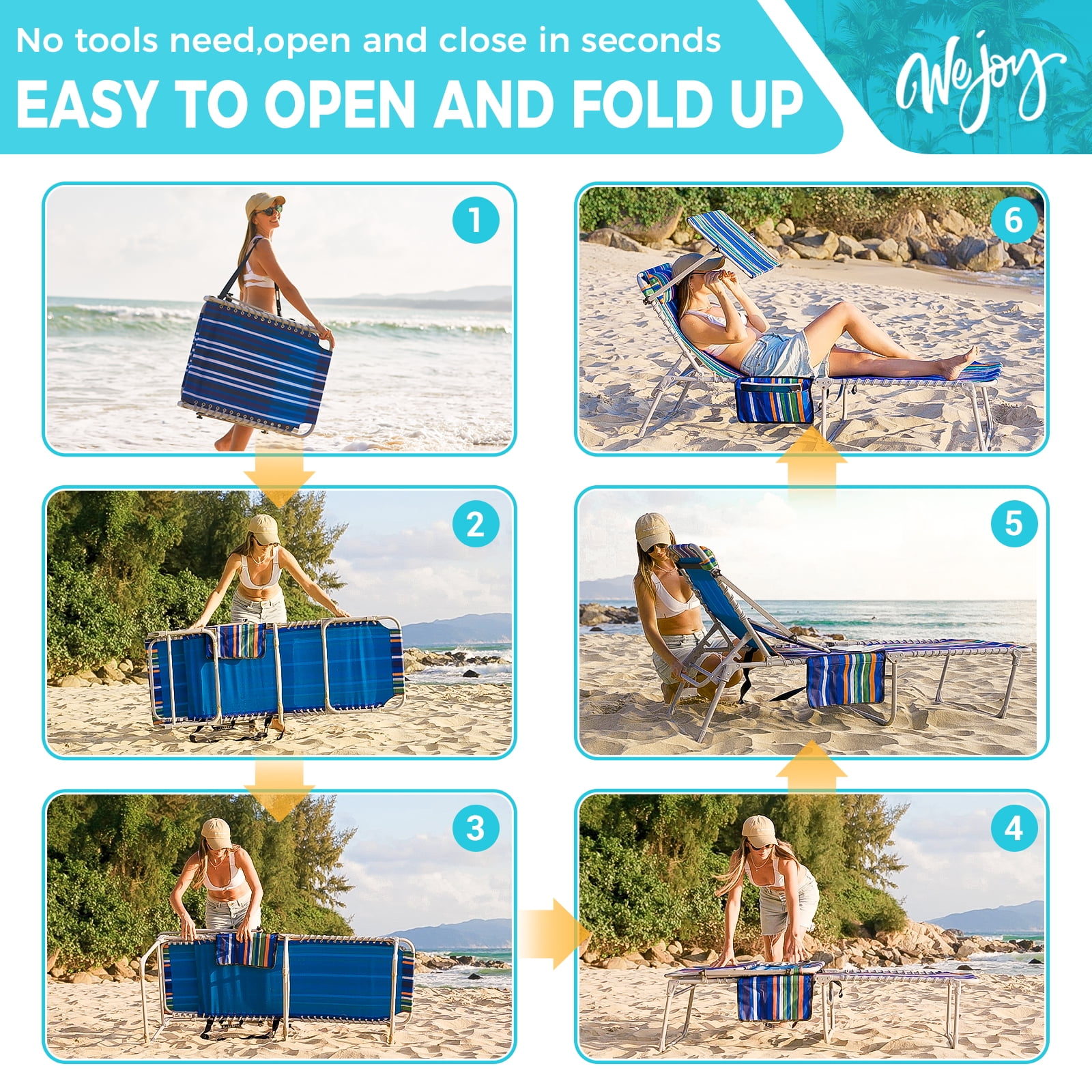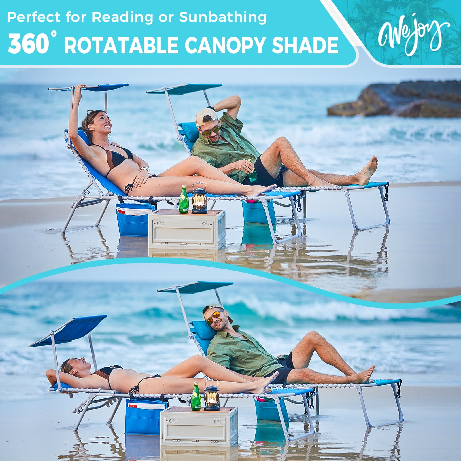 【5-Position Adjustable Chaise Lounge】The back of this beach lounge chair can be adjusted to 5 fixed positions. The chaise lounge chair leg supports can be placed in two different ways. Whether you are sunbathing, sleeping, eating and drinking, or just chatting with friends, this sun lounge chair can meet your leisure needs easily. 【Comfortable Design】The 360°canopy sunshade provides shade over your head, protecting your eyes and allowing you to read while enjoying sunbathing. This WEJOY foldable chaise recliner for adults is equipped with a removable pillow and the 3-in-1 pocket is more convenient for you. 【Portable & Foldable】No tools are required, the patio lounge chair is ready to use with just one step: open and lock the backrest at the angle you like. The unfolded size of this lawn chair is 74.8×23.2×13.3/14.5 inches, and the packed size is 29.92×5.9×23.62 inches. This 14.9 lbs lightweight outdoor lawn chair is effortless to take outside. 【Durable & Stable】The cloth is made of wear-resistant and durable fabric, which can bear weight up to 264 lbs. The durable, rust-resistant lightweight Q195 Steel pipe frame ensures durability over a long period. 【Customer Guarantee】This lounge chair comes with a 12-month warranty and a 100% satisfaction guarantee. If you have any questions, please contact us directly.
