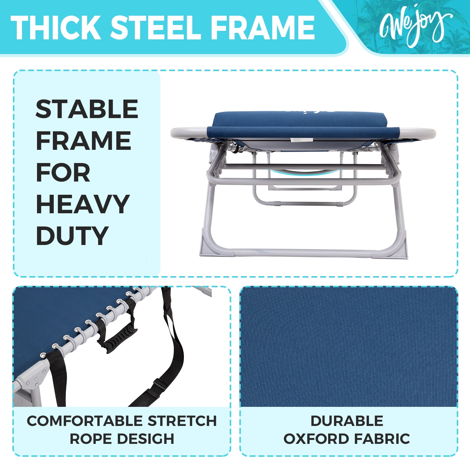 #WEJOY lawn chair for adult Color:Black;Blue Unfold size: 74.8inx 23.2inx 13.5in /14.5in Packed size: 29.9inx 5.9inx 23.6in Weight: 14.1lbs Maximum load: 264lbs Frame: Q195 steel pipe Fabric: 100% polyester 600D oxford All-round Support: Elastic ropes secure the bed surface in a suspended structure, providing comfortable support for the whole body. Multi-functional Design: The backrest can be adjusted to 5 angles, easily converting it into a recliner or bed to meet various scene needs.