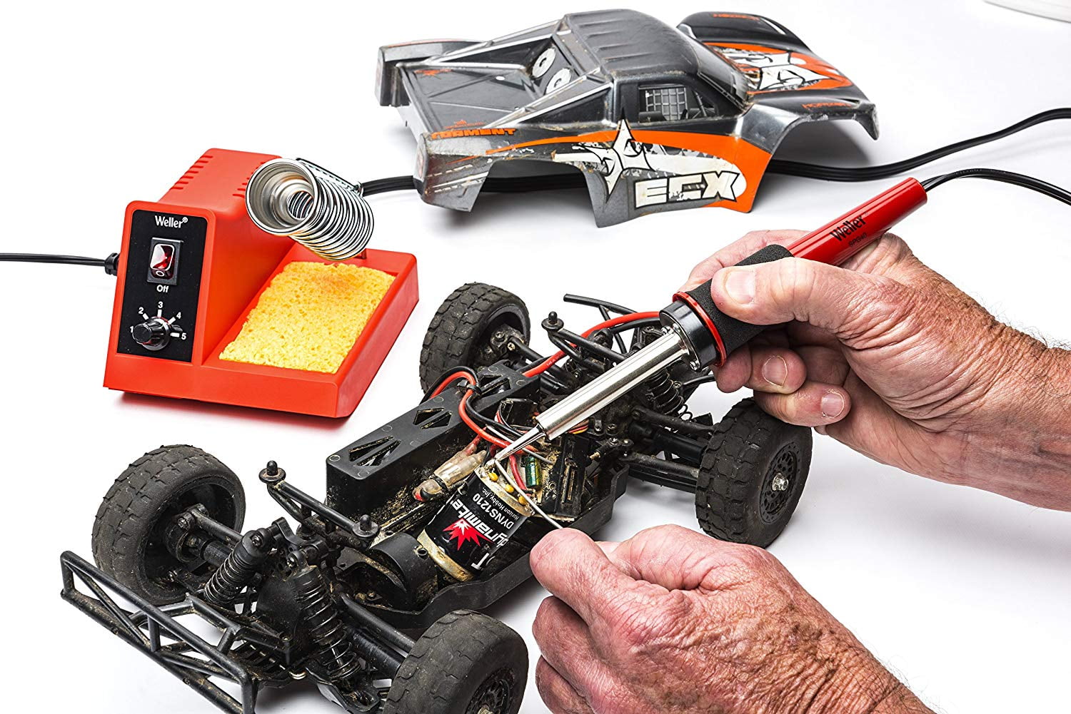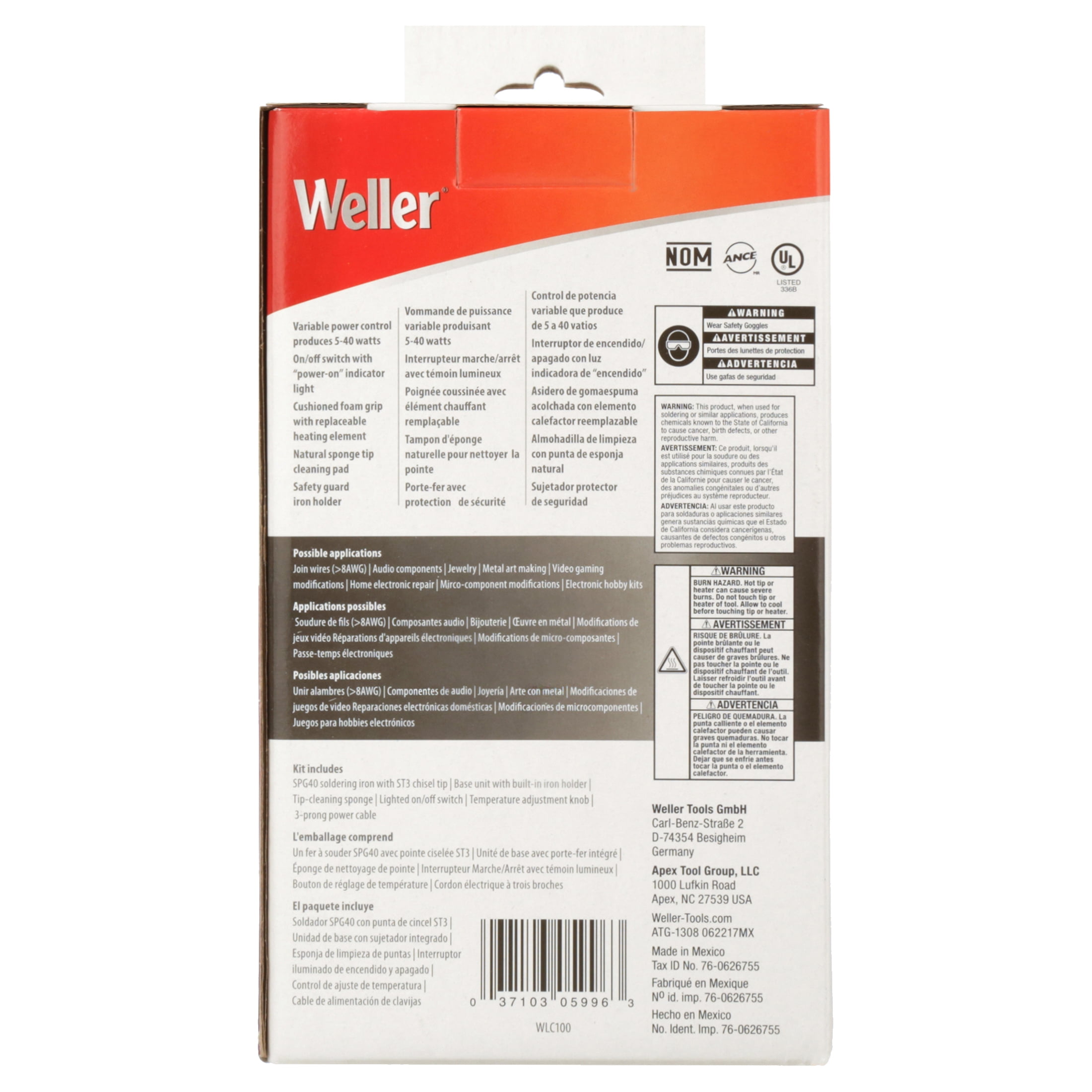 The Weller WLC100 Soldering Station includes everything you need to start using solder to join metals and create efficient, electrical connections. Designed with the hobbyist and the do-it-yourself enthusiast in mind, this kit features a high-quality, lightweight pencil iron with variable power control, a cushioned foam grip with a replaceable heating element, and a safety guard iron holder. And it’s from Weller, the world leader in soldering since 1945. At the heart of the WLC100 Soldering Station is a high-quality lightweight pencil iron with an ST3 iron-plated copper tip. To ensure that you can work comfortably for long stretches of time, the iron has a cushioned foam grip that sits comfortably in your hand as you work. It has a replaceable heating element, so you can continue using the same iron for a long time to come. Unlike many basic soldering kits, which can be difficult to adjust, the WLC100 features a variable power control that lets you adjust the power level from five to 40 watts with a simple turn of the knob on the base unit. This lets you choose the precise setting for each unique job that you tackle. The base also includes a “power-on” indicator light and on/off switch to help keep you from leaving a hot iron on accidentally. The workstation also provides a built-in iron stand to keep your workspace organized and a natural sponge tip cleaning pad to keep your tip ready to go at all times. The WLC100 includes an ST3 iron-plated 1/8-inch screwdriver tip. Weller also offers a wide array of compatible ST series tips to perform a variety of applications (additional tips are sold separately). All Weller tips are constructed of solid copper and plated with iron, as well as nickel and chromium to protect against corrosion and solder creep, helping to ensure that your tools perform reliably over time. Additionally, Weller tips are pre-tinned with tin/lead solder. This WLC100 Soldering Station is UL-listed, which means it has been tested and meets independent safety standards. It is backed by a one year warranty against manufacturer’s defects in material and workmanship.