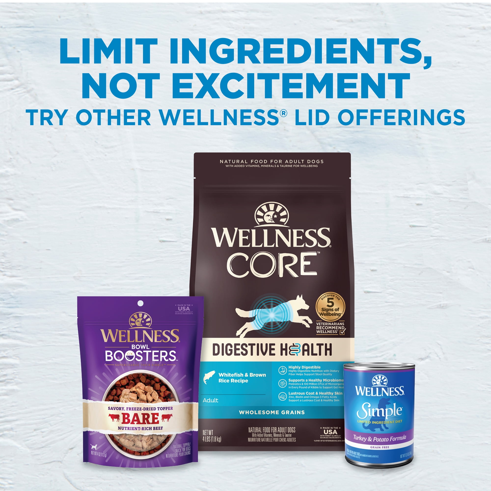LIMITED INGREDIENT DOG FOOD: Natural, limited ingredient recipe crafted with a single source of animal protein, expertly balanced with easily digestible carbohydrates and no fillers A LIFETIME OF WELLBEING: Natural prebiotics support a healthy digestive system, antioxidants support a strong immune system and Omega fatty Acids support a healthy coat and skin WHOLE BODY HEALTH: Supported by omega fatty acids, antioxidants, glucosamine, probiotics and taurine for a healthy heart FIND THE RIGHT FOOD: Wellness offers a full range of foods to support your dog’s specific needs, including grained and grain free options, high protein recipes and limited ingredient diets for dogs with food sensitivities PRODUCED WITH PRIDE: We prepare each dry kibble recipe in our own state of the art facility in Indiana using only the finest globally sourced ingredients, to craft delicious natural recipes with wholesome, non GMO ingredients chosen for their nutritional benefits