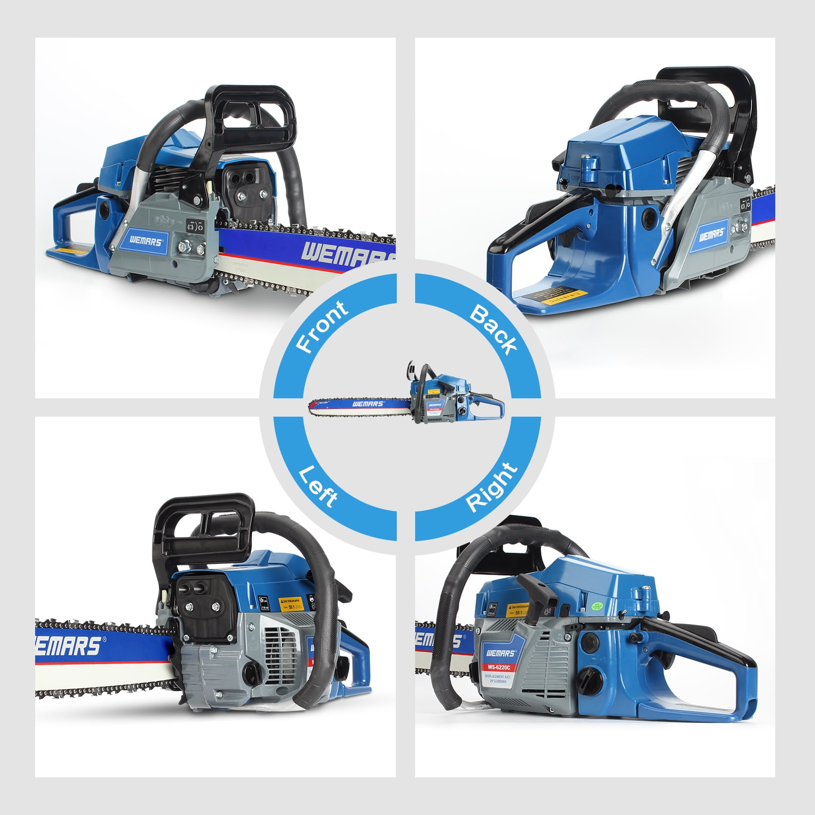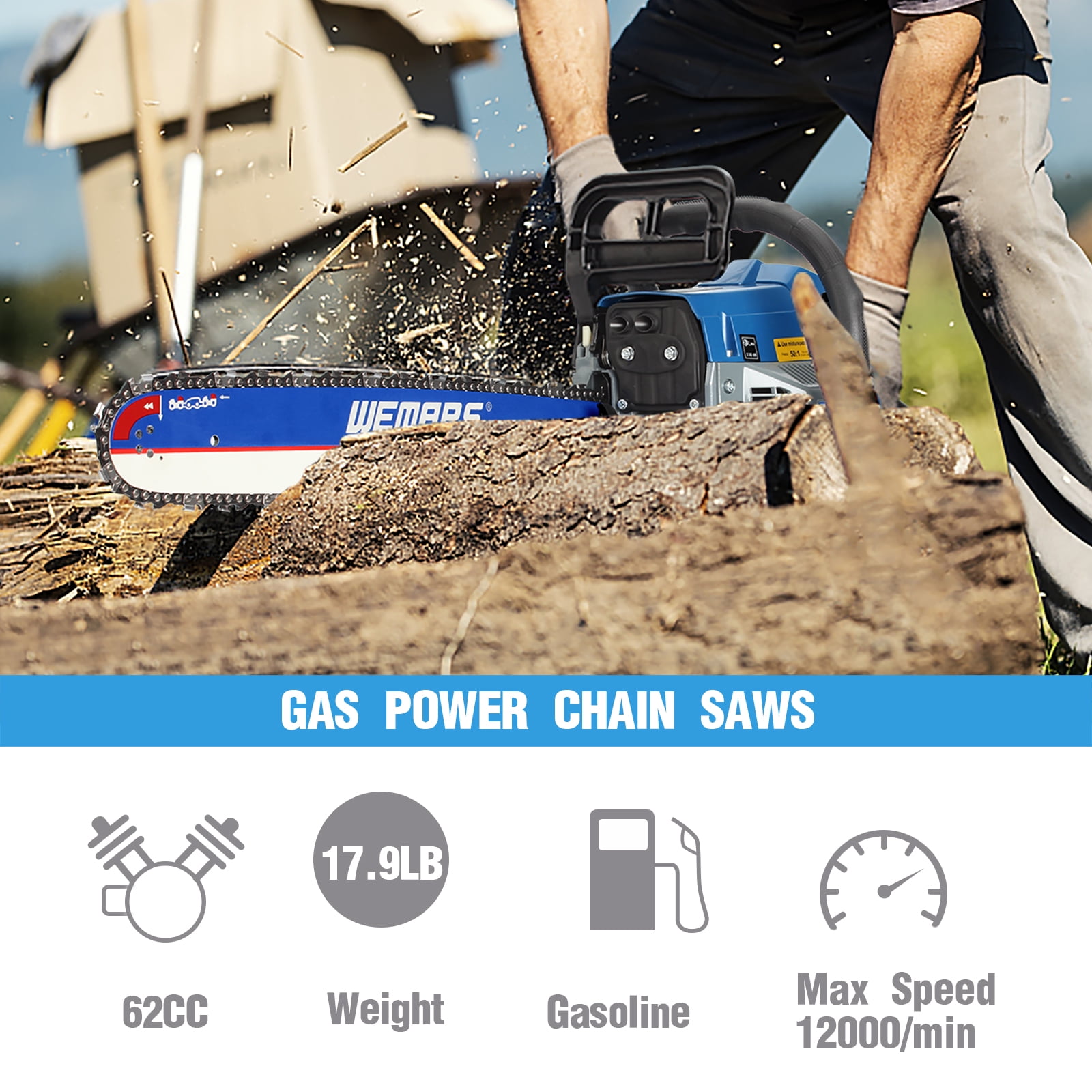 WEMARS 20” 62cc 2-Cycle Gas Powered Chainsaw, High Performance High performance 62cc gas chainsaw with a 20-inch guide bar and chain for efficient wood cutting Equipped with a 2-stroke motor and integrated chain brake for enhanced safety and stability during operation Features low kickback safety function and excellent electronic ignition system to minimize operational risks Automatic chain lubricator with adjustable oil feed for optimal chain performance Quick and easy chain tension adjustment with a side-adjustable chain for user convenience