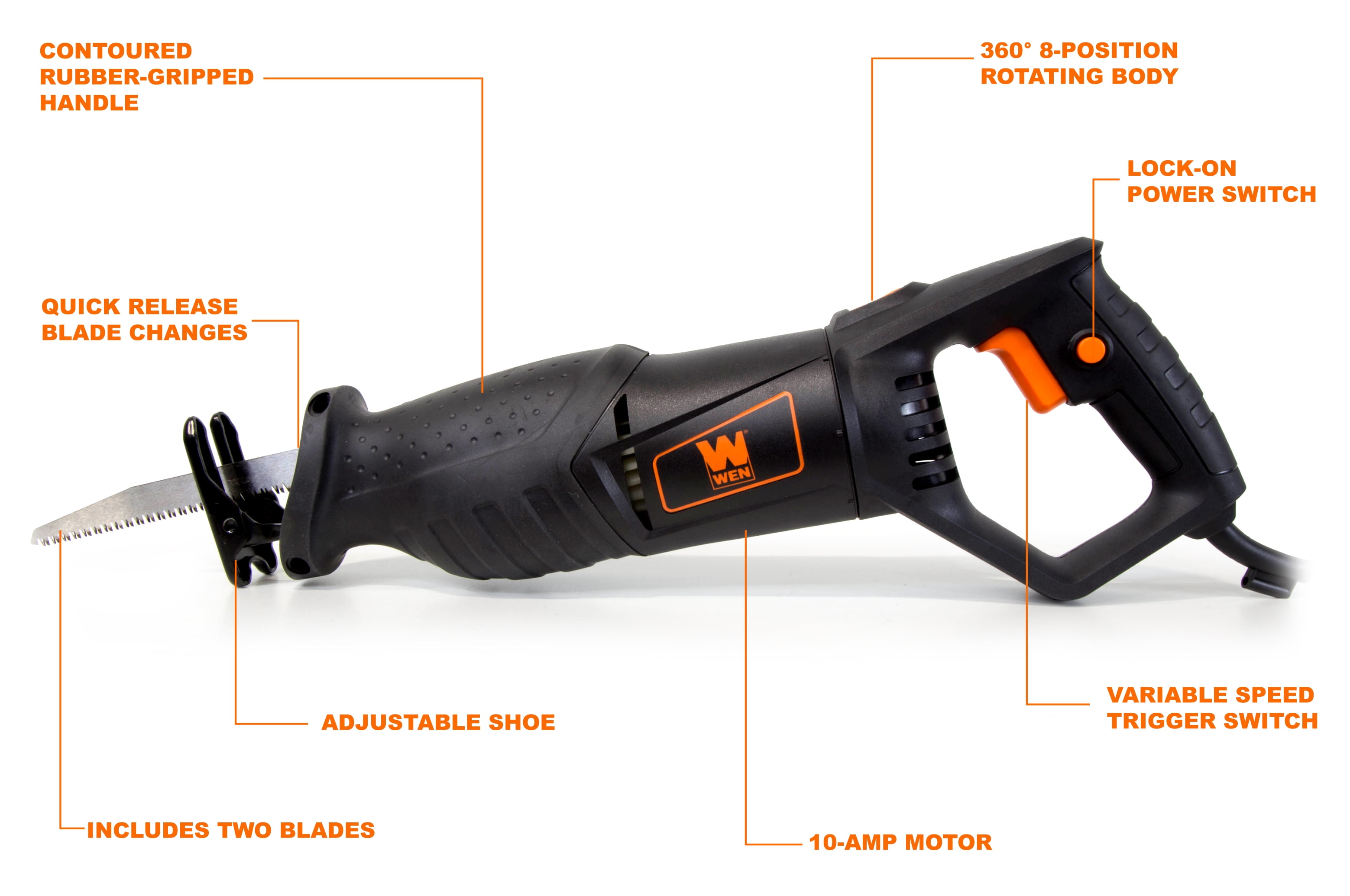 WEN 10-Amp 8-Position Variable Speed Reciprocating Saw: 10-amp motor handles up to 4-1/2 inches of wood and 3/5 inches of metal Pressure-sensitive trigger provides anywhere from 0 to 2800 strokes per minute Pivoting head features eight different stops for a variety of jobs: one every 45 degrees Twist-lock quick-release blade holder allows for simple tool-free blade changes Includes one metal blade, one wood blade, a soft rubber-grip front handle, and a two-year warranty