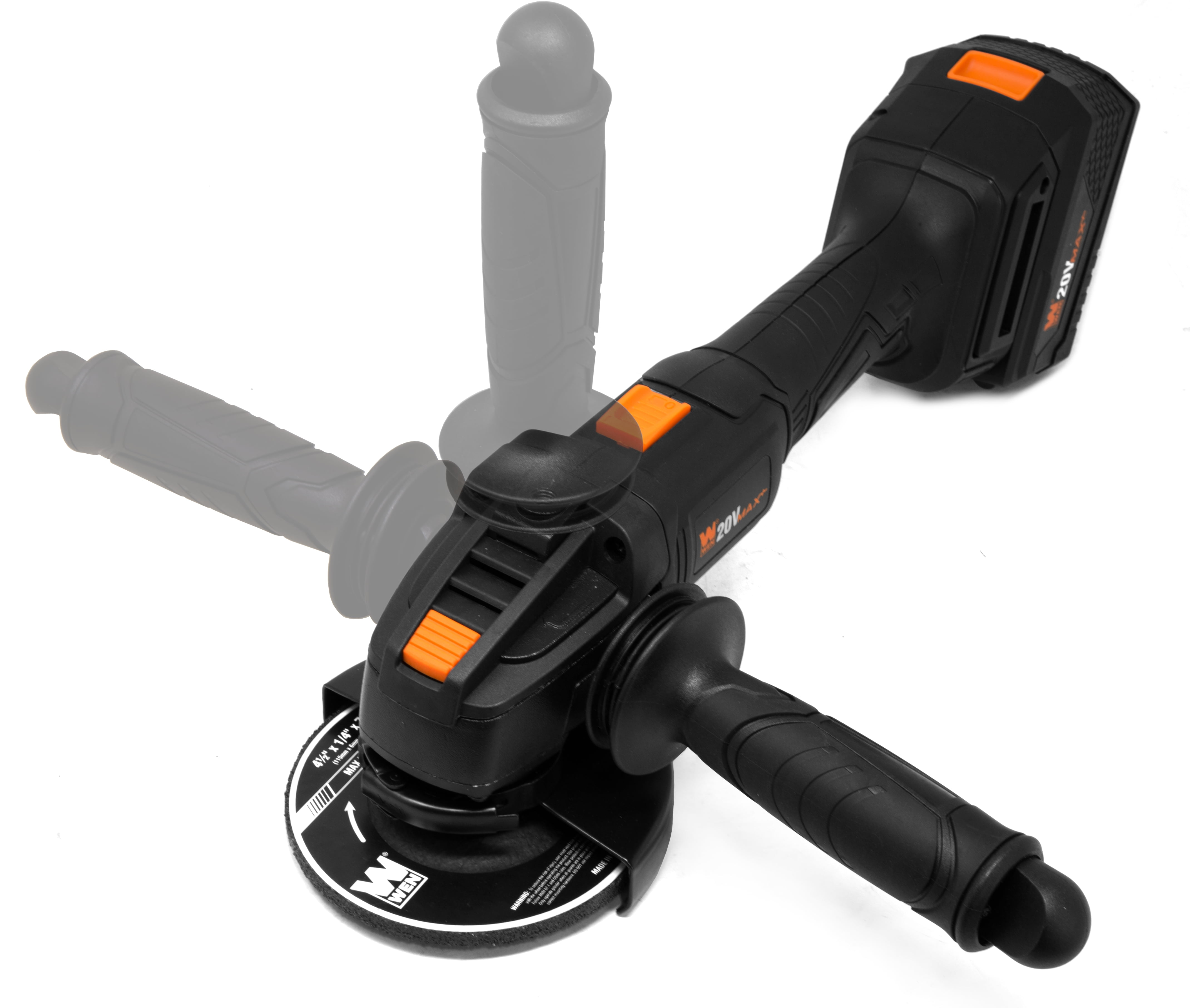 Longer lifespan 3-position detachable auxiliary handle can be installed on the right side, left side, or the top of the angle grinder 4.0 amp-hour lithium-ion battery with onboard LED charge gauge delivers consistent power at any charge level, and is compatible with the entire WEN 20V Max Cordless Power Tool series 5/8″-11 spindle accepts the majority of 4.5-inch grinding wheels on the market Includes a 4-1/2-inch 30-grit grinding wheel, a spindle lock, a lock-on power switch, a tool-free quick-adjust wheel guard, a 2-amp battery charger.