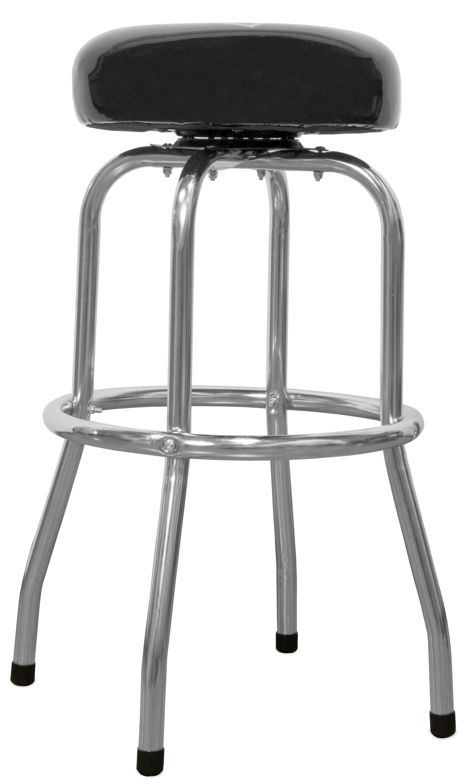Chrome-plated body helps fight rust and corrosion Perfect for either the Garage, The shop, or the bar Padded 14-1/2 inch vinyl cushion swivels a full 360 degrees Measures in at a height of 29 inches Backed by a two-year warranty