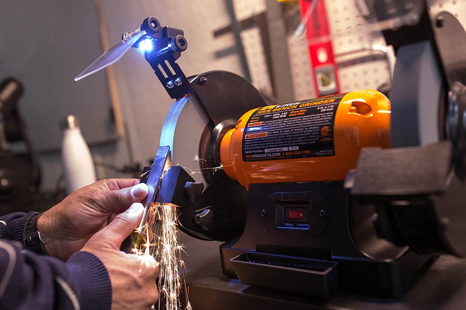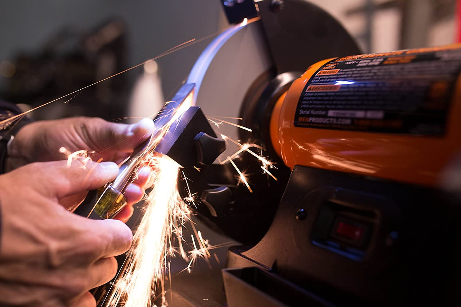 Remember when you spent all that money replacing dull rusty tools. From deburring ragged edges to cleaning objects to sharpening blades, the WEN 8-Inch Bench Grinder helps resuscitate old worn down knives, tools, and bits, saving you time and money. Our package includes two 8-inch by 1-inch wheels with 5/8-inch arbors: a 60-grit wheel for general purpose grinding and a coarse 36-grit wheel for faster material removal. The onboard coolant tray serves as a quenching pot for workpieces, making sure your tools and blades don’t warp due to excessive heat. With our quiet 4.8-amp motor, expect quick startups and smooth performance at speeds of up to 3450 rotations per minute. Built with you in mind, our design makes wheel guard removal as simple as possible for easy wheel changes. The included eye guards can adjust to prevent them from interfering with your project while their illuminate during operation. Adjustable work rests pivot to allow for angled grinding applications. And because its a WEN product, your 8-Inch Bench Grinder comes backed by a two year warranty, a stocked inventory of replacement parts, and a friendly customer phone line. No need to waste anymore money on new tools. The WEN 8-Inch Bench Grinder revives all of your tools back to their sharp original state. Remember when your blades could actually cut through something. Remember WEN.