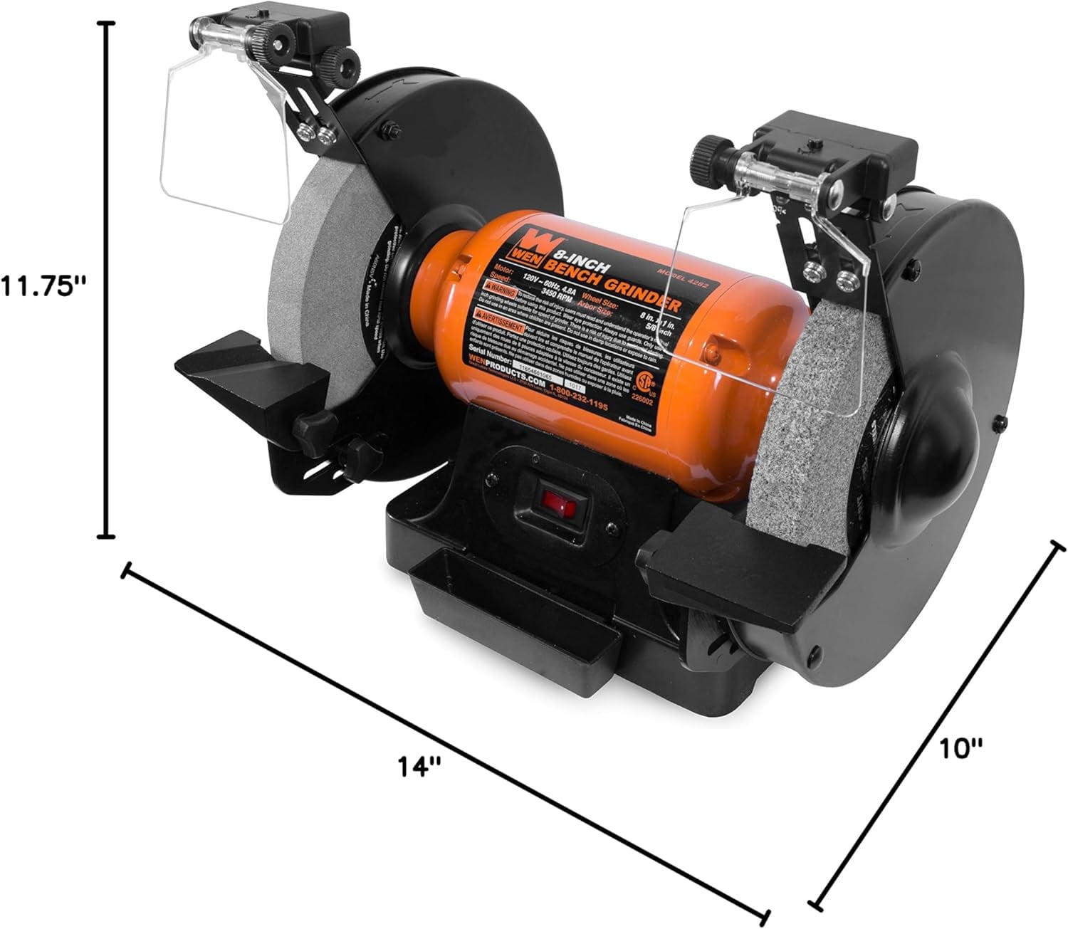 WEN 4282 4.8-Amp, 3450 RPM 8-Inch Bench Grinder Electric 48-amp motor turns the 8-by-1-inch grinding wheels at speeds of up to 3450 RPM Perfect for reviving old tools, knives, bits, and more Adjustable eye guards include built-in LED lights to keep your workpiece illuminated Includes two 8-inch by 1-inch wheels with 5/8-inch arbors: a 60-grit wheel for general purpose grinding and a coarse 36-grit wheel for faster material removal Onboard coolant tray serves as a quenching pot for workpieces, preventing warping due to excessive heat