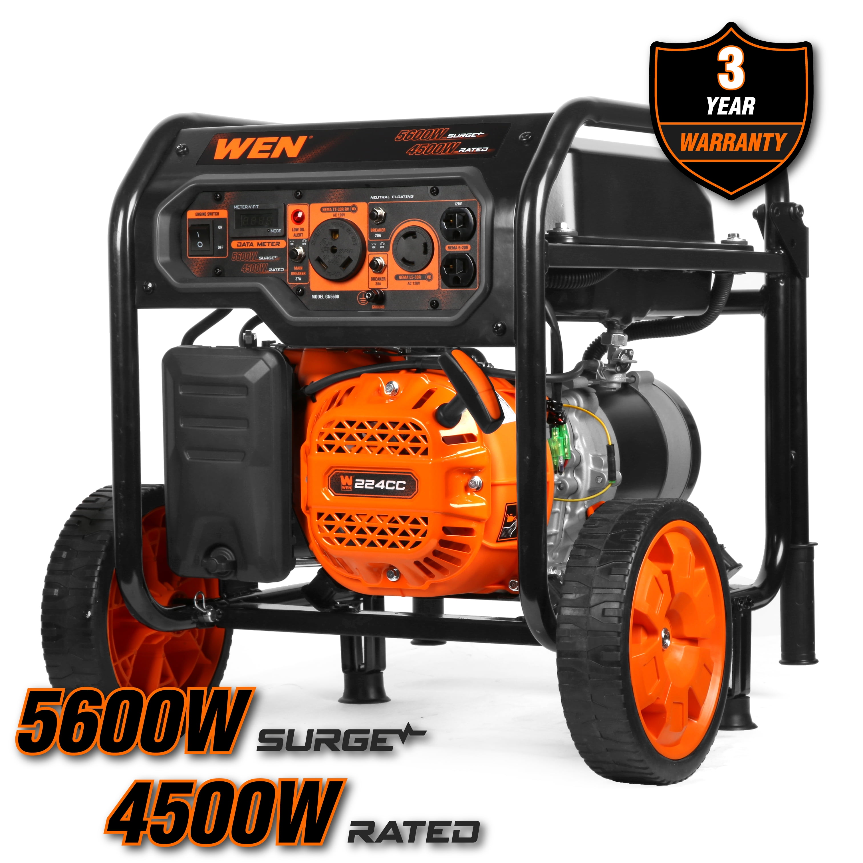 Keep your family safe with 5600 starting watts and 4500 running watts of power Wheel and handle kit makes for easy transport between uses 4.3-gallon gas tank provide up to 12.5 hours of half-load run time Packed panel includes two standard 120V 5-20R 20-amp outlets, one RV-ready 120V 30-amp TT-30R outlet, and one transfer-switch-ready 120V 30-amp NEMA L5-30R twist lock receptacle Features a 224cc engine and a three-year limited warranty