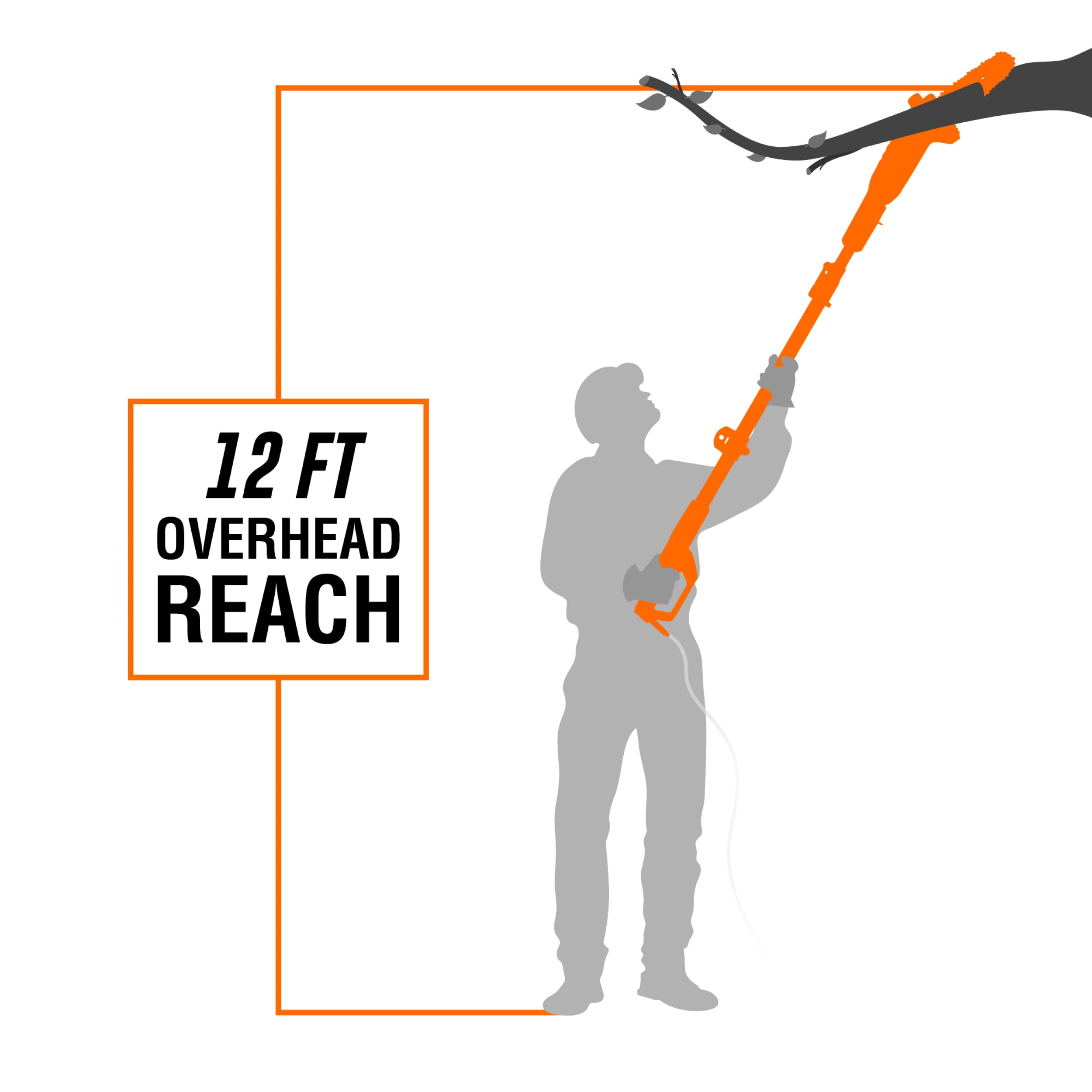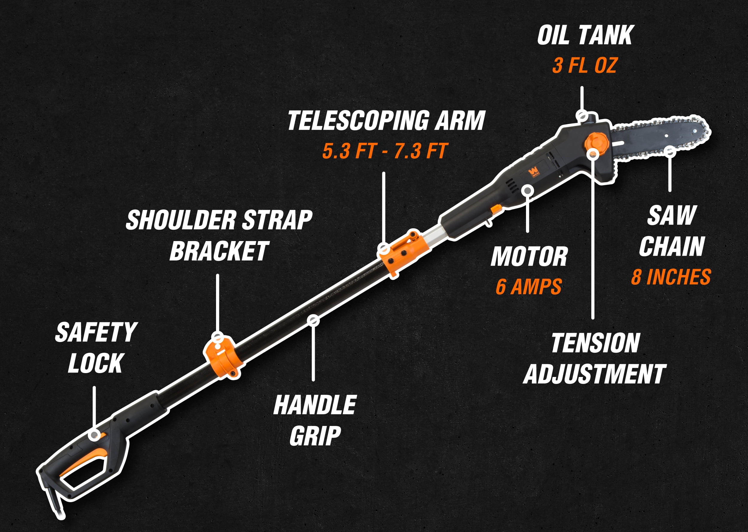 Telescoping pole adjusts anywhere from 5.3 feet to 7.3 feet for up to 12 feet of overhead reach 6-amp motor rotates the chain up to 36 feet per second Weighs in at a mere 6.7 pounds to limit user fatigue during operation Design allows for tool-free chain adjustments and emission-free operation Includes an 8-inch saw chain, a blade cover, a shoulder strap, and a two-year warranty