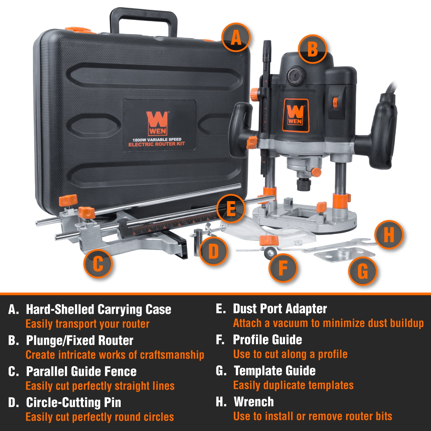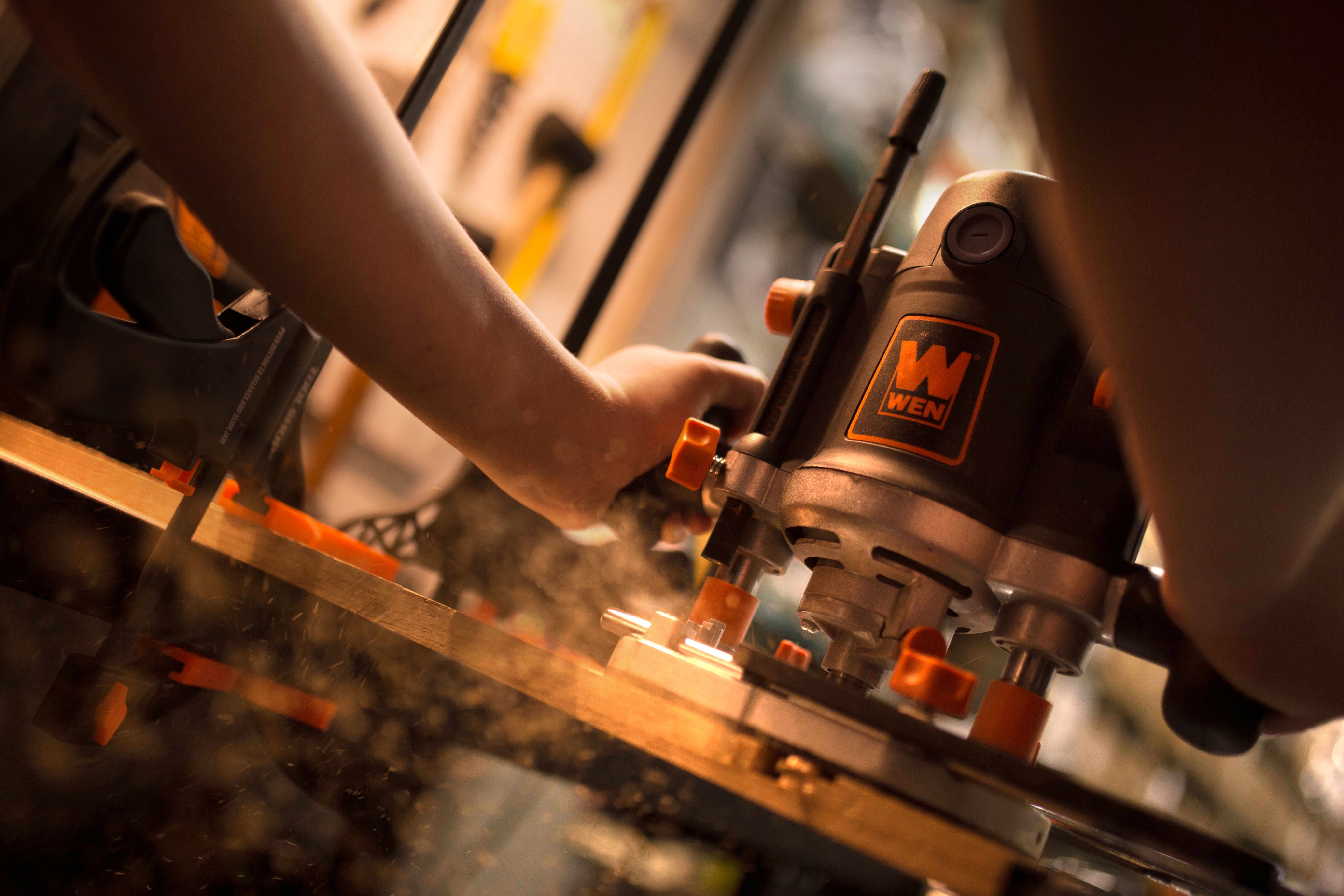 Remember when you had versatility and power all in the palm of your hand. Do you fancy chamfers and v-grooves or are you partial towards rabbets and dados. We won’t judge. That’ll just be between you and your router. Make intricate patterns in both the exterior and interior of your workpieces with the WEN 15-Amp Variable Speed Plunge Router. This versatile machine features a variable speed 15-amp motor, providing users speeds from 8,000 to 23,000 rotations per minute. The 1/2-inch collet includes an additional 1/4-inch adapter, allowing for compatibility with a wide variety of bits. Our soft start up design prevents damage to your workpiece and lengthens the tool’s lifespan. The spring-loaded base features a lock-down knob to turn your plunge router into a fixed router. The intricate depth stop system features a 7-stop turret, a depth adjustment dial that advances the depth stop 5/16 of an inch per quarter turn, and a fine-tune adjustment dial that advances it 1/128 of an inch per quarter turn. The included guide fence lets users rout perfectly straight lines, helping to create dadoes and grooves along the workpiece. This kit comes packed with accessories, including a hard-shelled blow mold carrying case, a 1-1/2-inch dust collection duct, a bit-changing wrench, a straight-edge guide fence, a fence scale, a centering pin for cutting circles, a profile guide for routing edges of curvy workpieces, and a template guide for creating more complex shapes. Remember when you stepped your carpentry up a notch. Remember WEN.