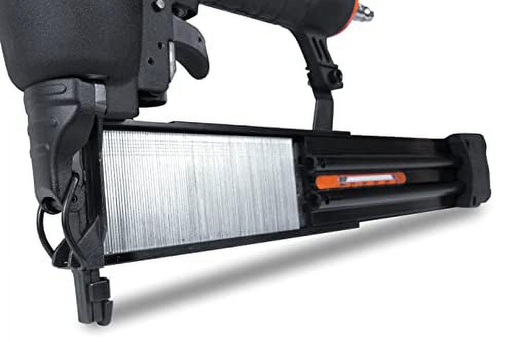 Features a depth adjustment wheel, a nail gauge, a rotatable exhaust, and a quick release 106-nail capacity magazine Hassle-free nose latch makes clearing jammed nails quick and easy This package also includes lubricating oil, hex keys, 500 3/8-inch nails, 500 3/4-inch nails, 500 1-inch nails, 500 2-inch nails, and a handy carrying case for easy transportation and storage.
