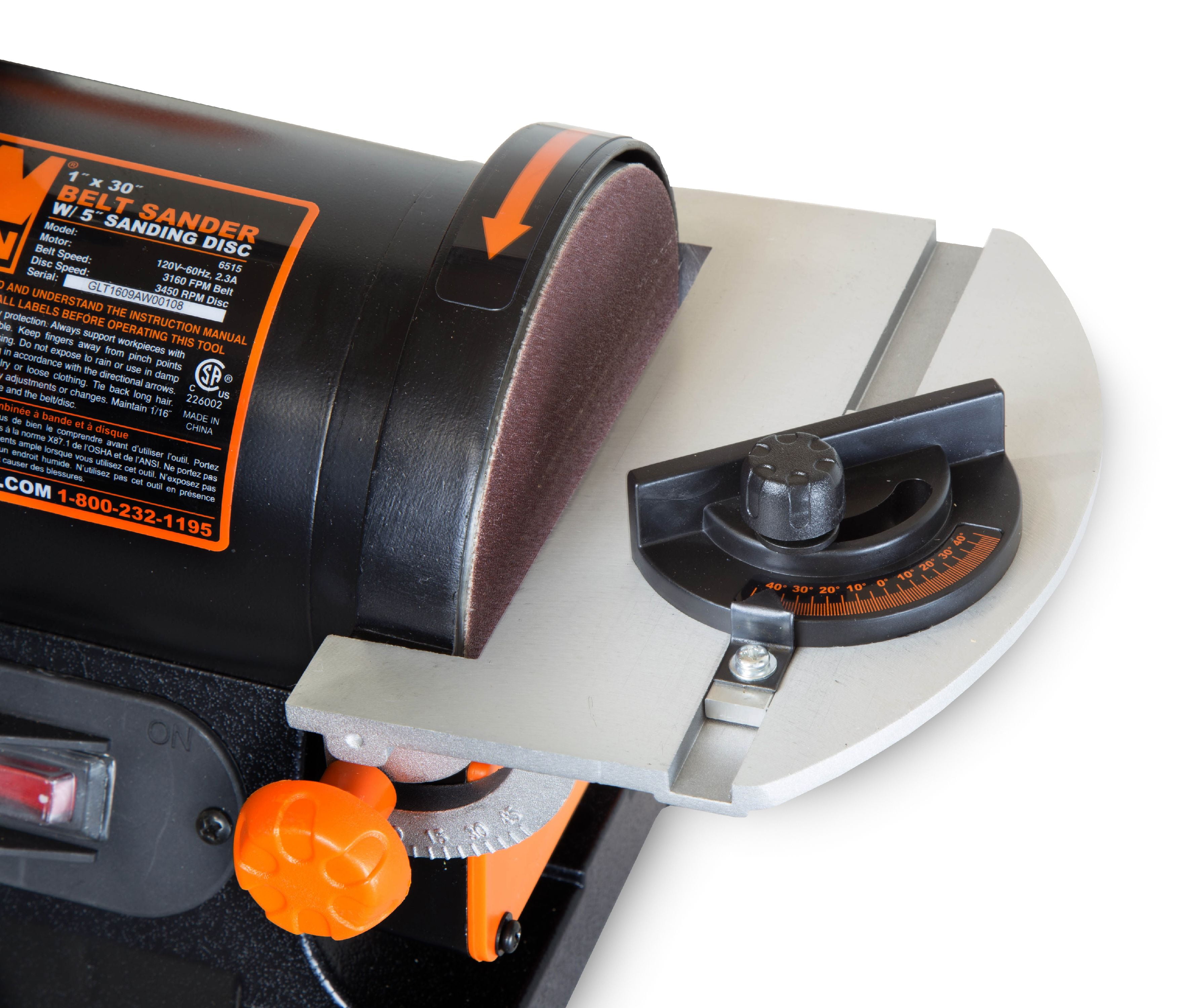 Two-in-one sanding machine includes both a 1-by-30-inch belt and a 5-inch disc 2.3A motor provides up to 3160 FPM for the belt and 3450 RPM for the disc Features two separate dust ports for maximum vacuuming efficiency