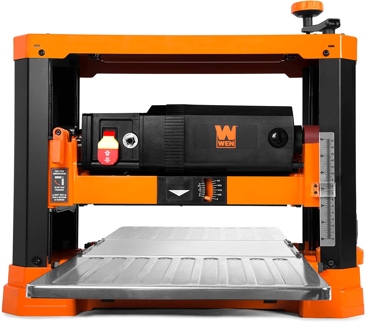 Remember when you brought those old jagged boards back to life? The WEN 13-Inch Benchtop Thickness Planer repurposes rough and worn wood to give it an exceptionally smooth finish. Our spiral cutterhead utilizes 26 staggered HSS blades to provide a perfect finish to hard and soft woods alike. The powerful 15-amp motor rotates the cutterhead at up to 10,000 RPM. Two-speed operation gives maximum control; choose the 26-feet-per-minute feed rate for quick dimensioning and 833 cuts per inch, or switch to the slower 16-feet-per-minute 1354 CPI option for perfect finishes every time. Plane boards up to 13 inches wide and 6 inches thick with ease. The onboard planing gauge helps inform users about the amount of material being removed during each pass. Combine that with the heavy-duty base for a sturdy planer that does not walk or wobble during operation. The handy depth adjustment knob makes it easy to take off anywhere from 0 to 1/8 of an inch per pass. The adjustable dust port removes chips and sawdust from the workpiece and blasts them out of the way. The onboard depth stop allows users to achieve an exact workpiece thickness with maximum precision. This package also includes height-adjustable infeed and outfeed tables to limit snipe while providing extra support to your workpiece during planing. Easily mount the planer to a work surface or stand (such as the WEN MSA658T Planer Stand) using the predrilled base holes. Compatible with the WEN BP510H Replacement Spiral Blades. And because it’s a WEN product, this planer comes backed by a nationwide network of skilled service technicians, a helpful customer support line and a two-year warranty. Remember when your planer could handle even the hardest of woods? Remember WEN.