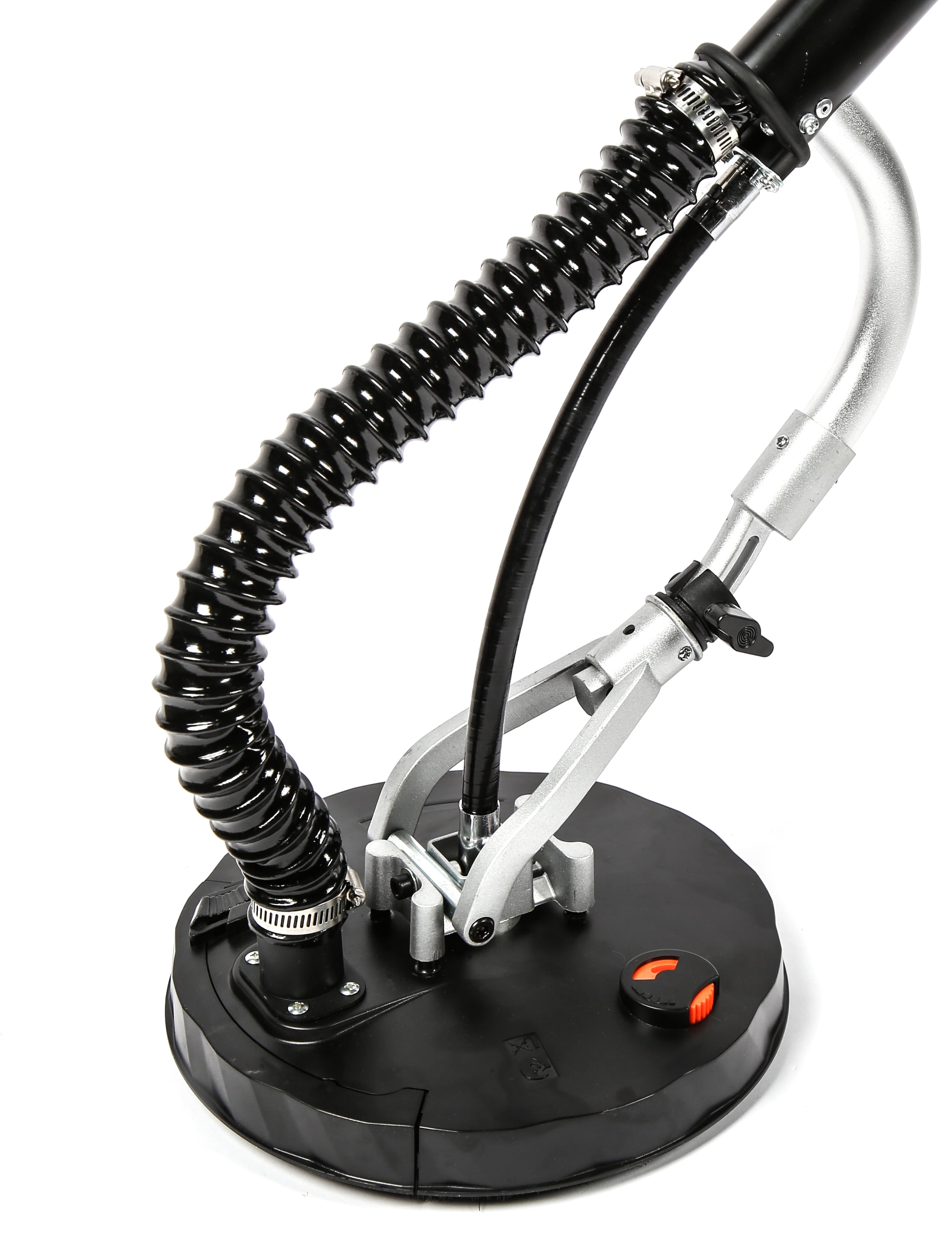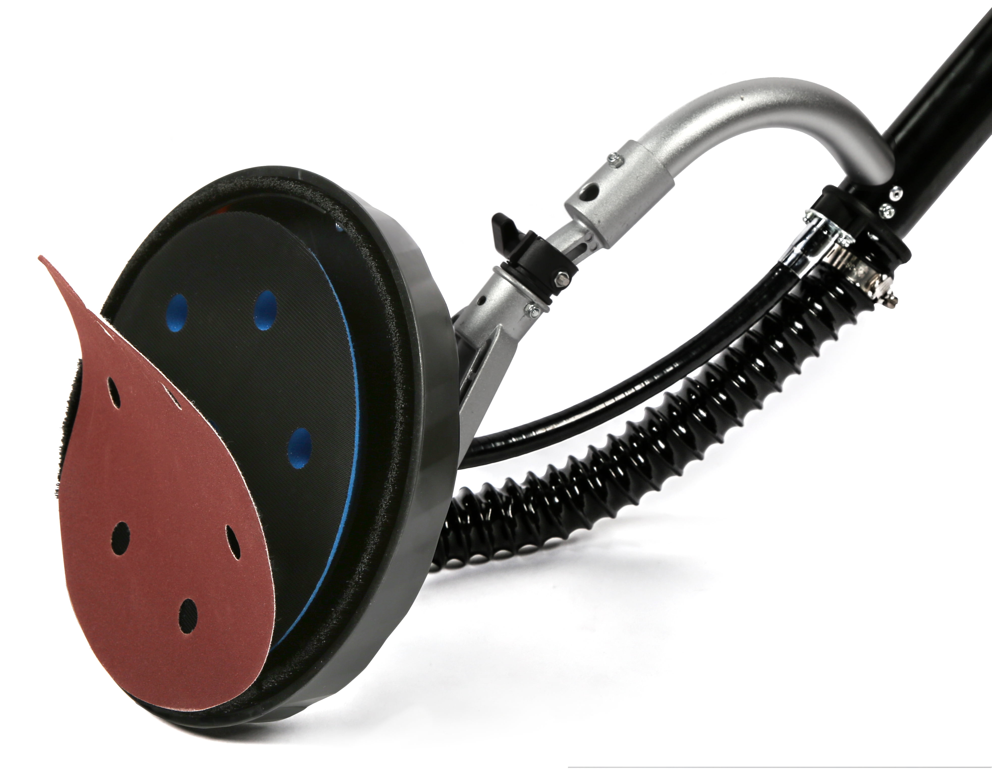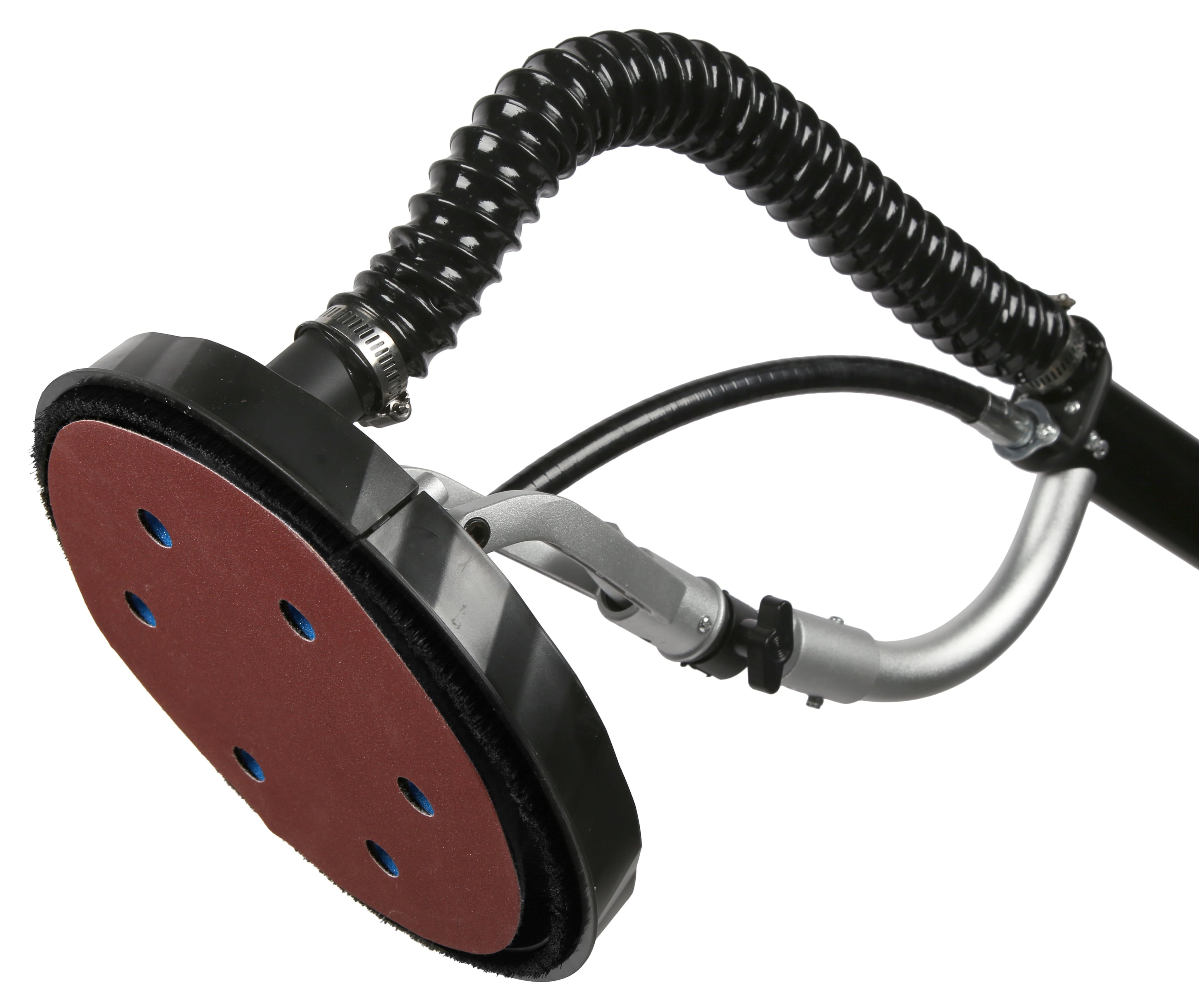 Mid-mounted 6.3-amp motor minimizes the weight of the sanding head, making the sander easier to maneuver Unique sanding head design suctions to your drywall, allowing users to sand ceilings and high places with limited fatigue Improved hole configuration maximizes dust collection for minimum cleanup (NOTE: only compatible with DW series replacement sandpaper, i.e., DW120SP) Hook-and-loop 8.5-inch base pad features a lockable head to maintain a single sanding angle Features a 15-foot dust hose, six 9-inch sanding discs of assorted grits, a collapsible body for easy transport and storage, variable speed operation, and a two-year warranty