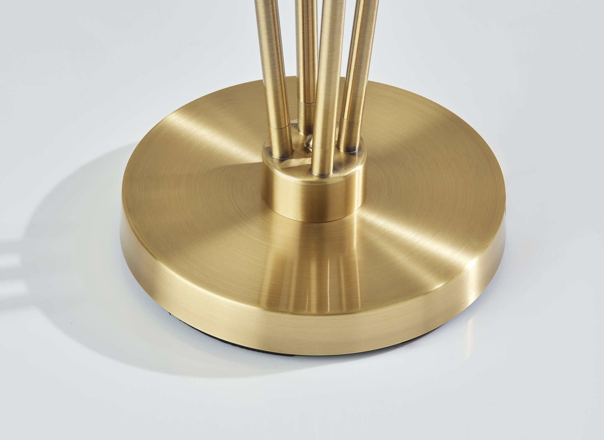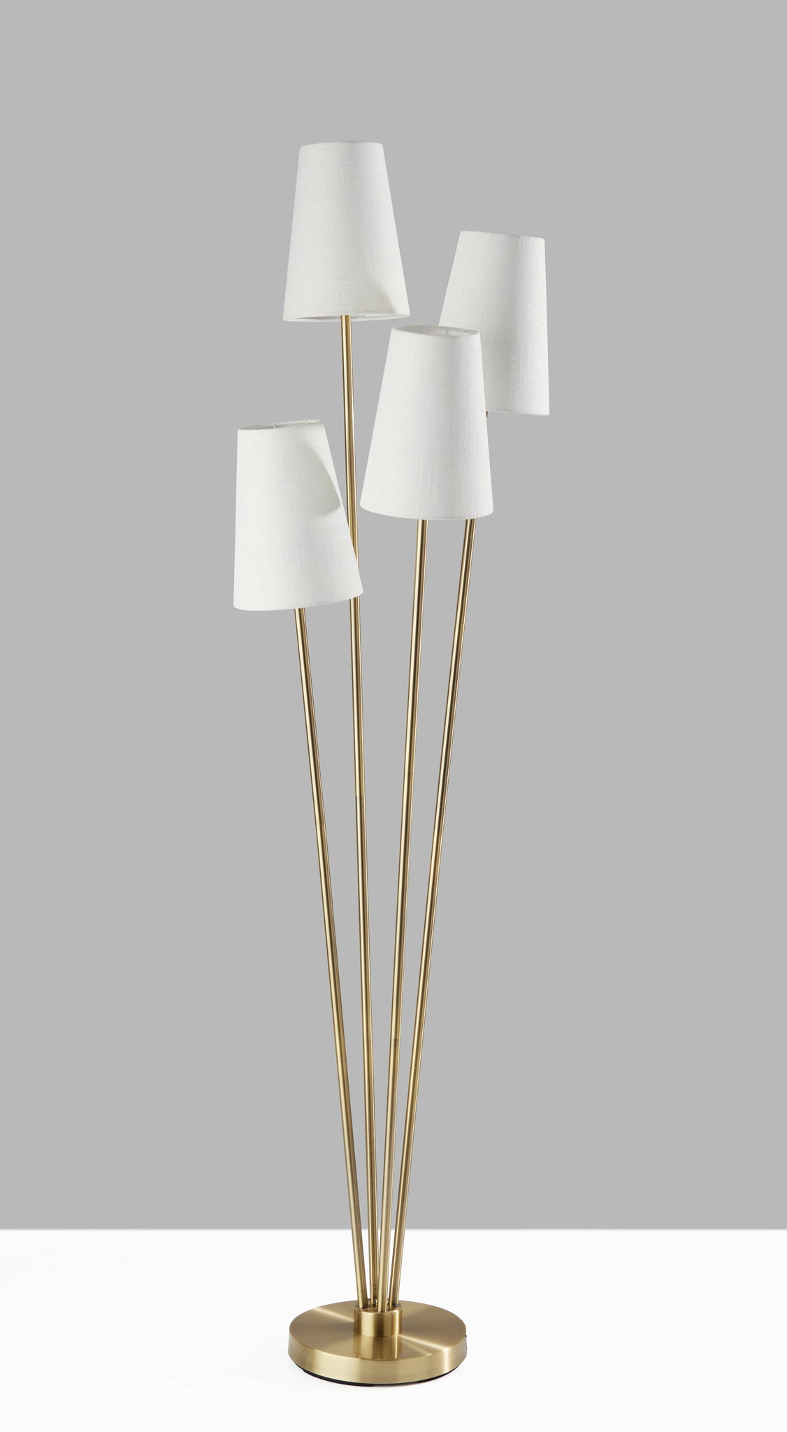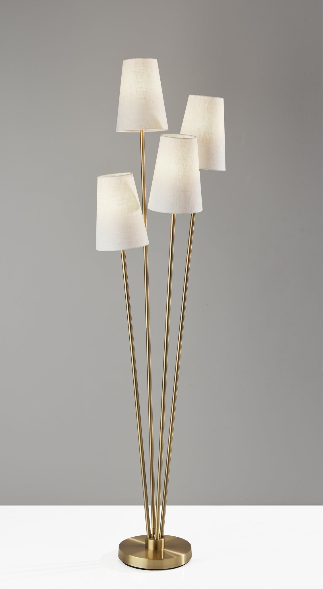 Four is better than one! The Wentworth floor lamp’s modern, asymmetrical four-arm silhouette blends contemporary design with mid-century modern materials to illuminate your space in style. The lamp features a simple, 10″ diameter round base in antique brass finish supporting four matching thin stems that gradually fan out from the base. Topping the stems at varying heights are four off-white textured fabric shades to throw a soft glow from 40W bulbs. Powered by a 5′ black cord, the lamp is easily turned on or off with a foot step switch. The Wentworth floor lamp is also available with a black metal finish and light brown textured linen lampshades to complement modern décor.