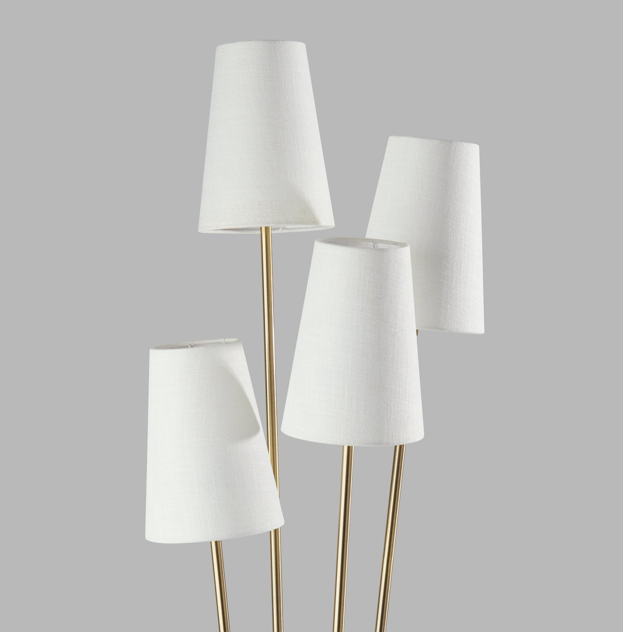 At 68″ tall and 18.25″ wide, this is a perfect addition in room corners or beside furniture. Distinctive four-stem design makes a bold statement. Antique brass construction complements mid-century modern décor. Tall drum shades in off-white textured fabric add soft light to any space.