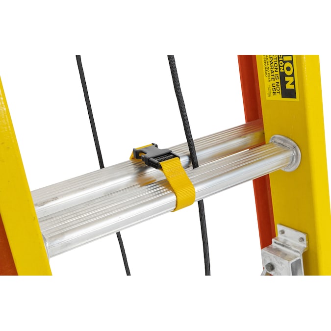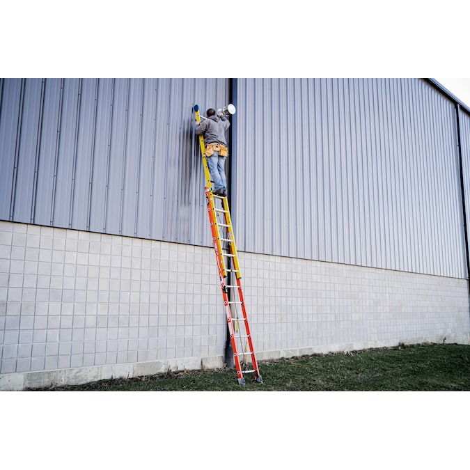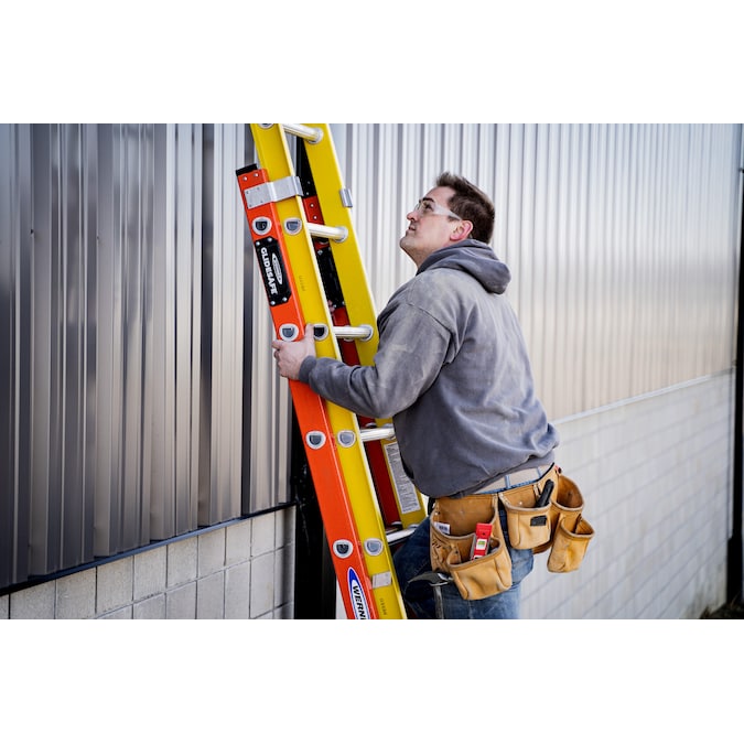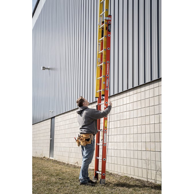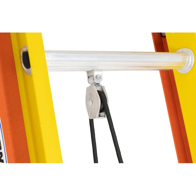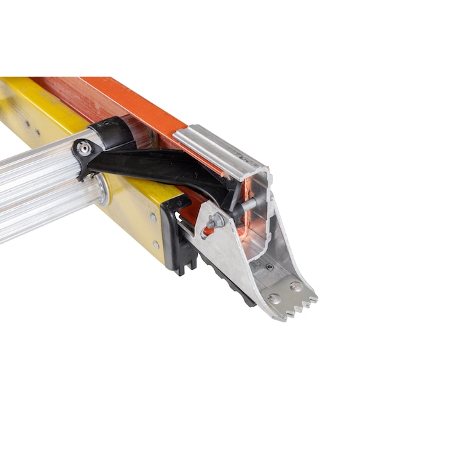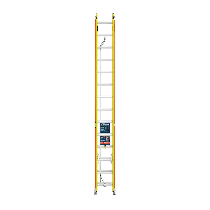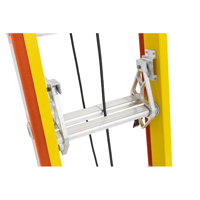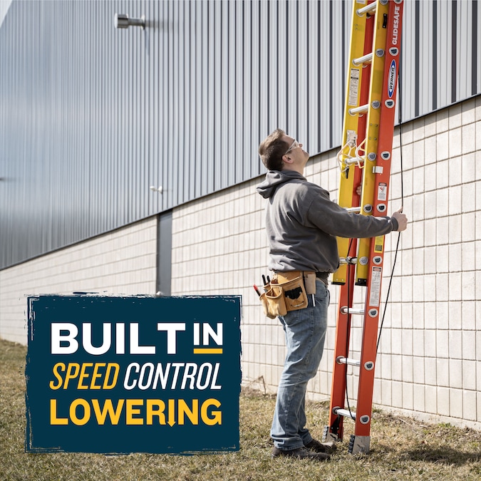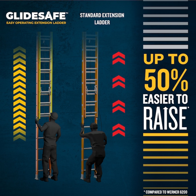 The T6200-2GS Series GLIDESAFE Fiberglass Extension Ladder was built with safety in mind. Featuring Lift Assist Technology which makes it up to 50% easier to extend versus a traditional extension ladder, eliminating back and arm strain. Built-in lowering assist helps to ensure a smooth, easy descent preventing slamming and rope burns. GLIDESAFE features a dual locking system to help prevent ladder extension during transport. Non-conductive rails makes this ladder ideal for working near electricity. With a duty rating of 300 lbs., the ladder is durable and long-lasting. The exclusive Alflo® rung joint means Twist-Proof performance on the job. The Traction-tread tri rungs are slip-resistant and the side rails are interlocking. The dual action feet are for use on hard or penetrable surfaces and swivel easily. The durable rail shield bracket and shoe help protect the bottom of the rail. The fly section rails are pre-pierced at the top for easy field installation of accessories.