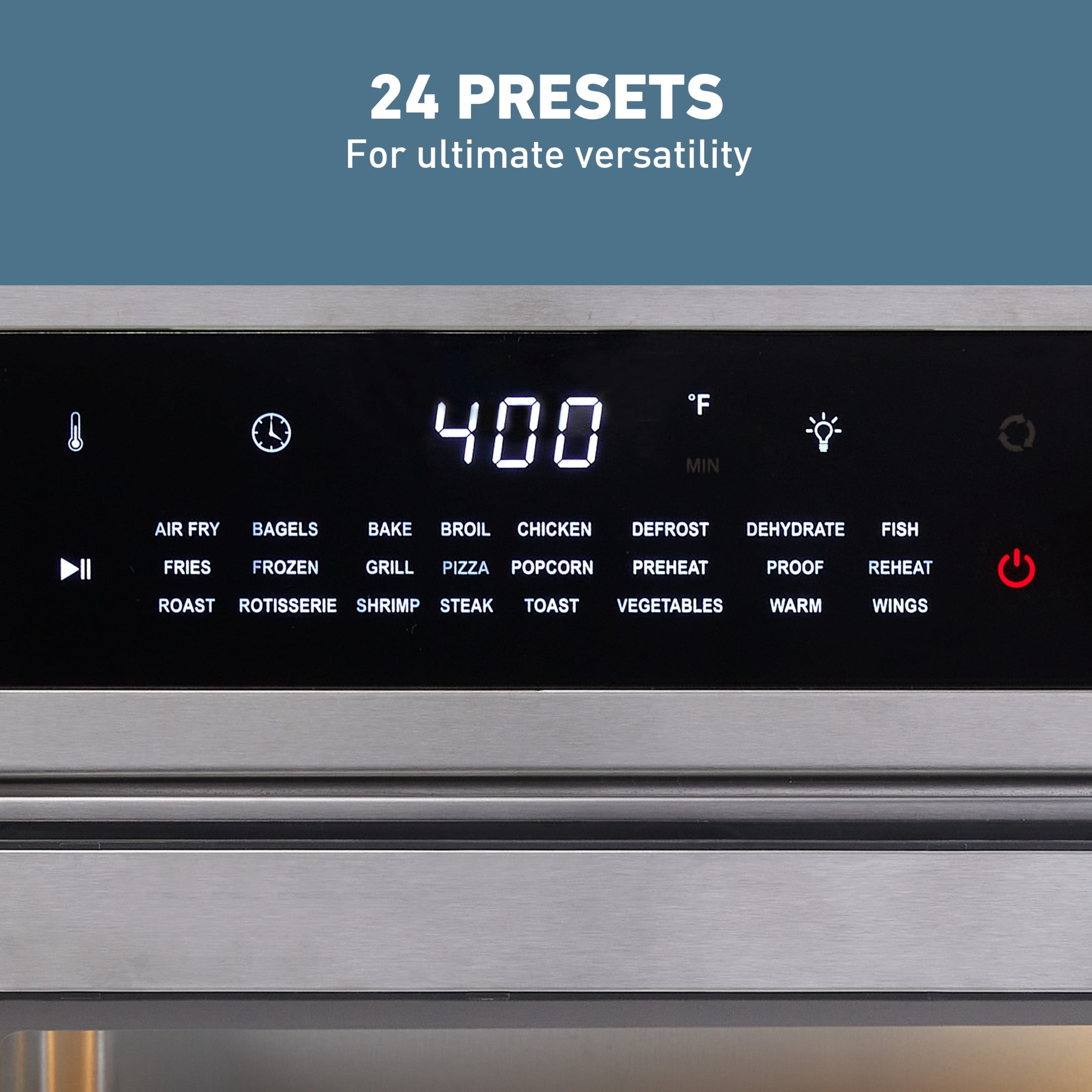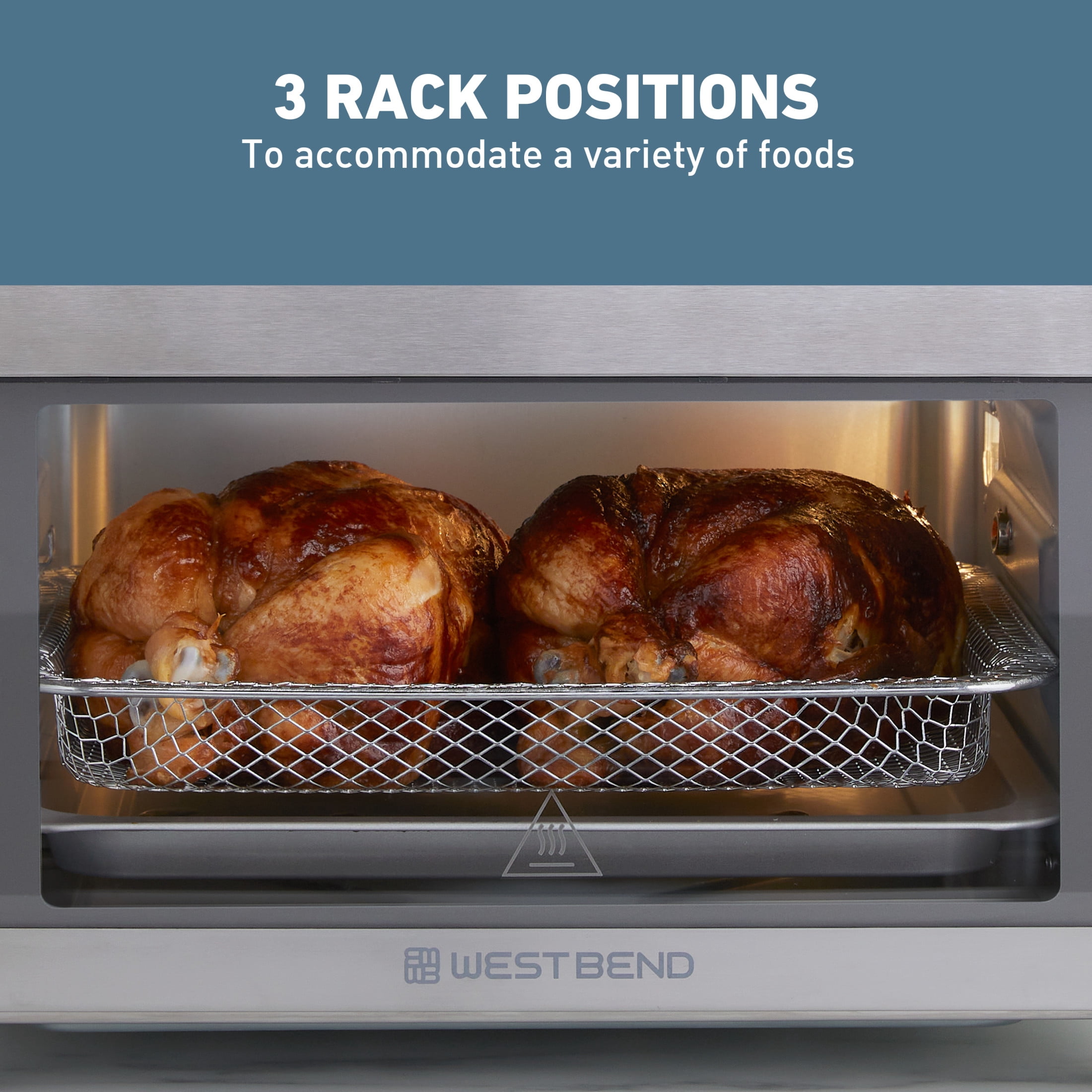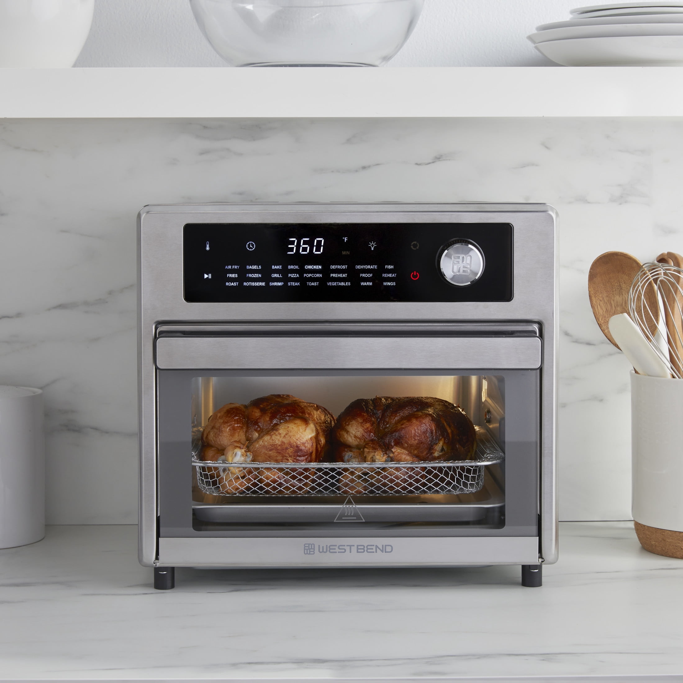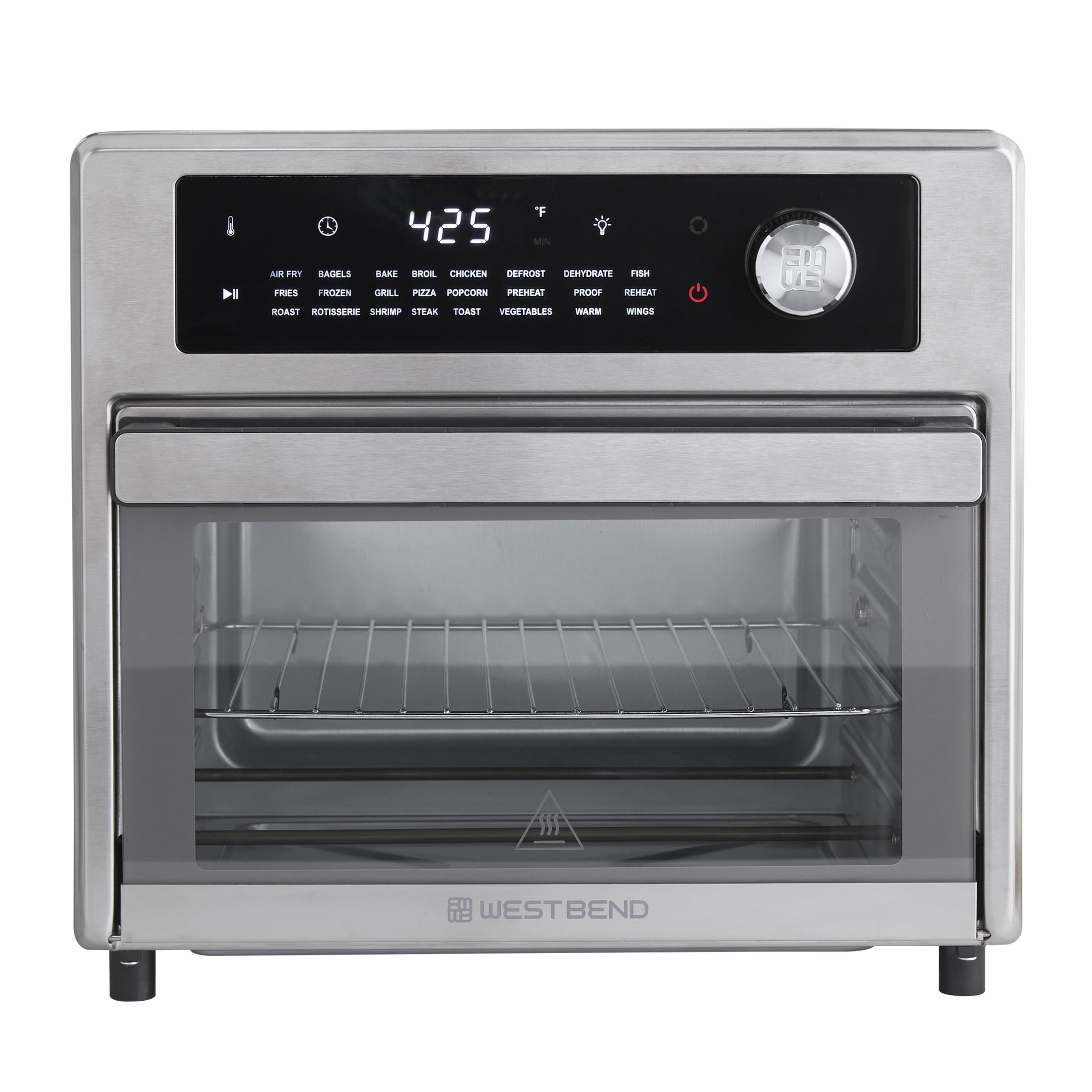 West Bend 26 qt Air Fryer Oven, Stainless Steel – 24 Presets Large 26-quart capacity, perfect for preparing family meals or entertaining a group of friends 24 convenient presets for maximum versatility: Air Fry, Bagel, Bake, Broil, Chicken, Defrost, Dehydrate, Fish, Fries, Frozen Foods, Grill, Keep Warm, Pizza, Popcorn, Preheat, Proof, Reheat, Roast, Rotisserie, Shrimp, Steak, Toast, Wings, and Vegetables 3 rack positionings for flexible cooking options Fits up to 2 12-inch pizzas or a whole chicken Adjustable temperature with a low range setting (80°-450°F)