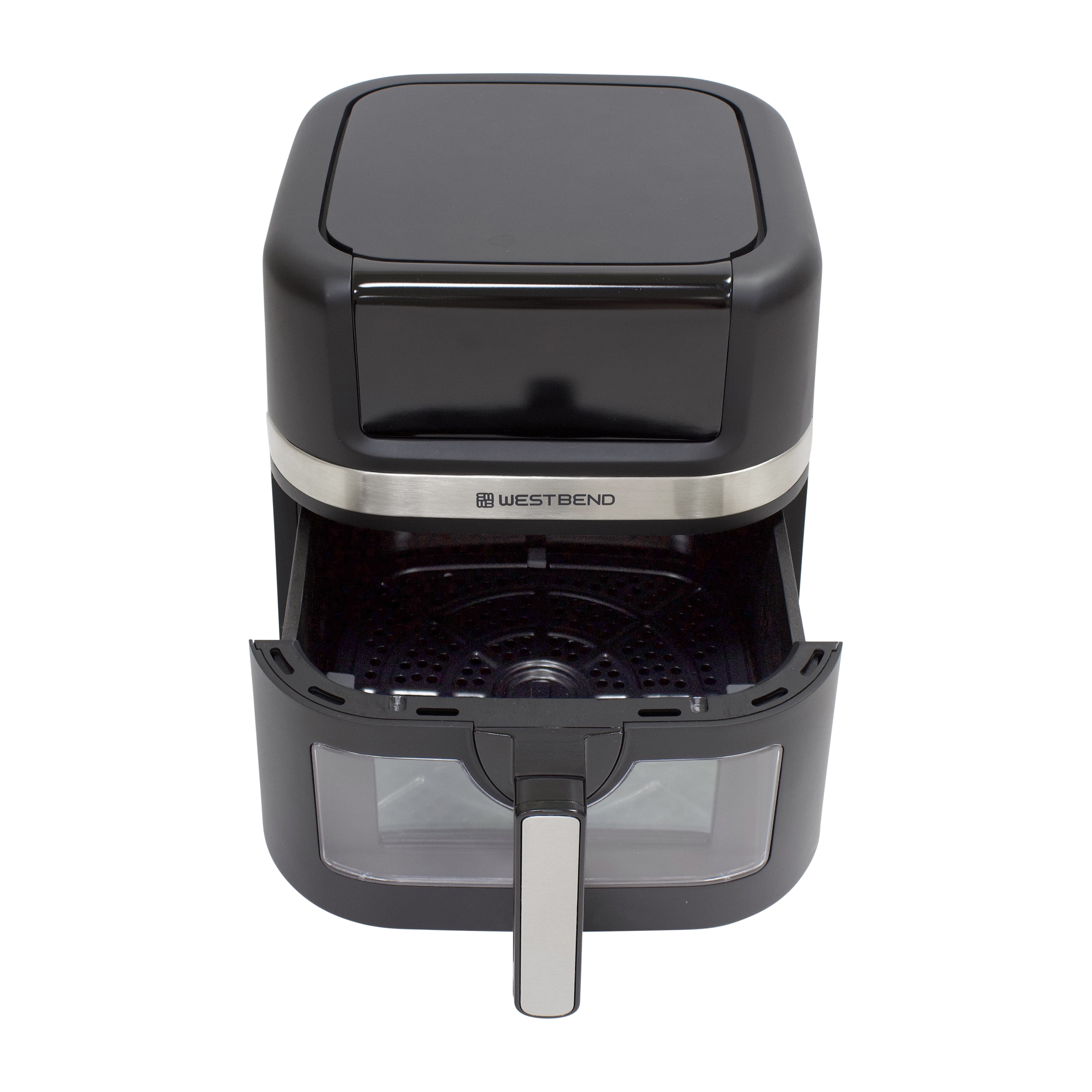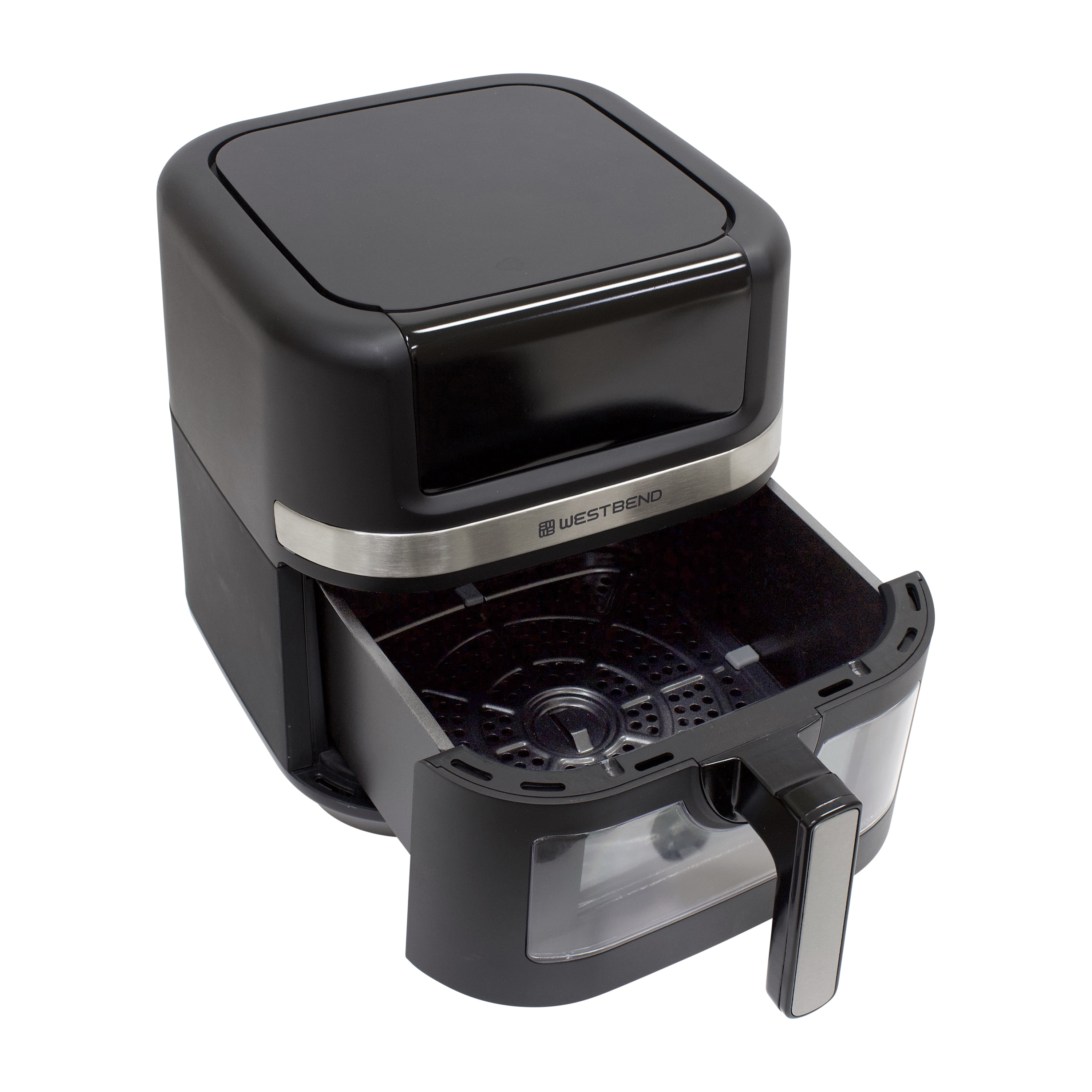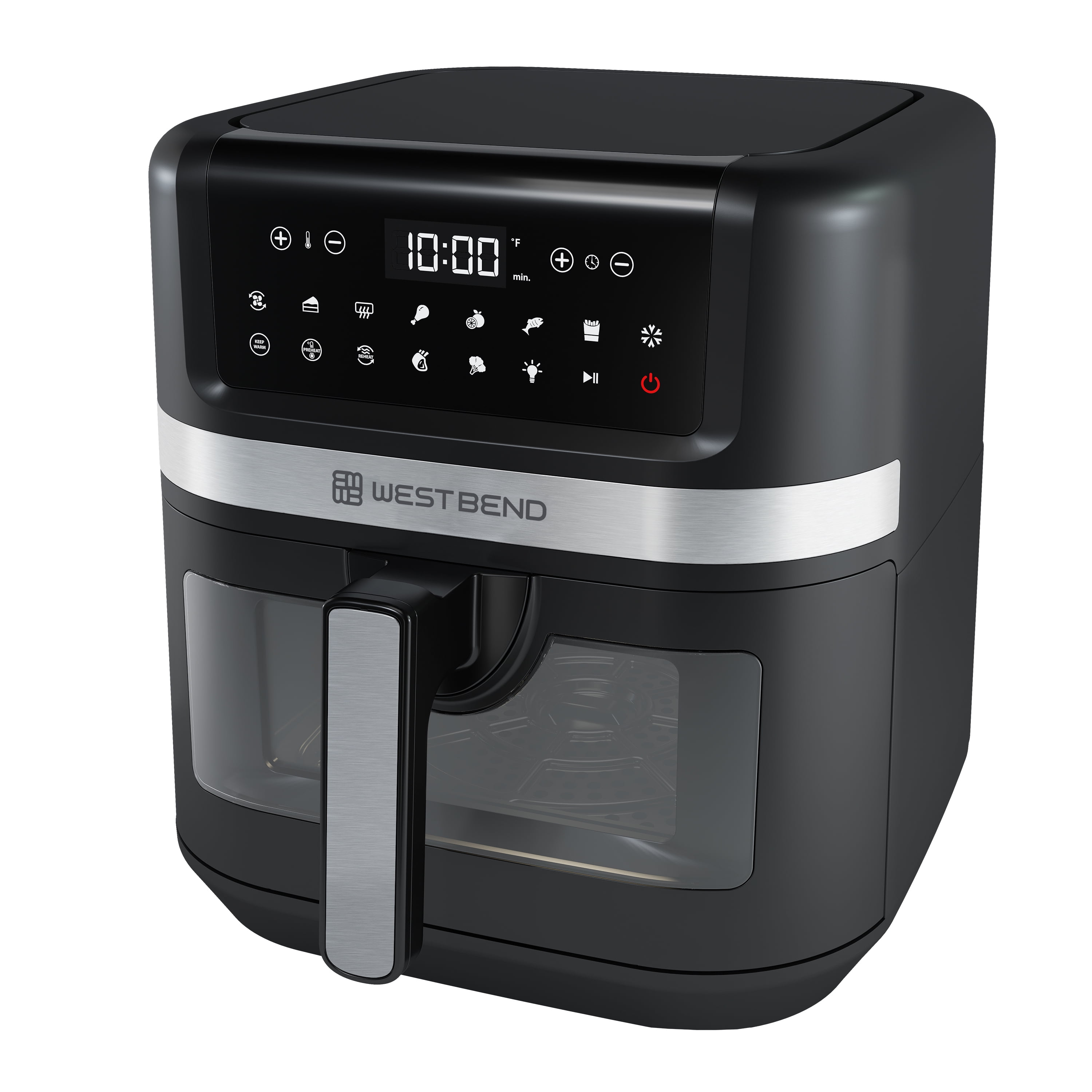 West Bend AFWB7QBK13 7 qt Air Fryer, Black with 13 One-Touch Presets Large 7-quart capacity, ideal for feeding a whole family 13 convenient presets allow you to cook your favorite recipes with the touch of a button: Air Fry, Bake, Broil, Chicken, Dehydrate, Fish, Fries, Frozen, Keep Warm, Preheat, Roast, Reheat, and Vegetables Enjoy guilt-free cooking with 75% less fat than traditional deep-frying The basket features an easy-view window so you can watch as your favorite recipe is cooked to perfection PTFE-free Diamond Shield™ infused non-stick coated basket for enhanced durability and easy cleanup Touchscreen LED digital interface provides easy access while in use on your countertop Easy-to-grip, ergonomic, cool-to-the-touch handle Dishwasher safe basket and tray for easy cleanup 1700 watts of power