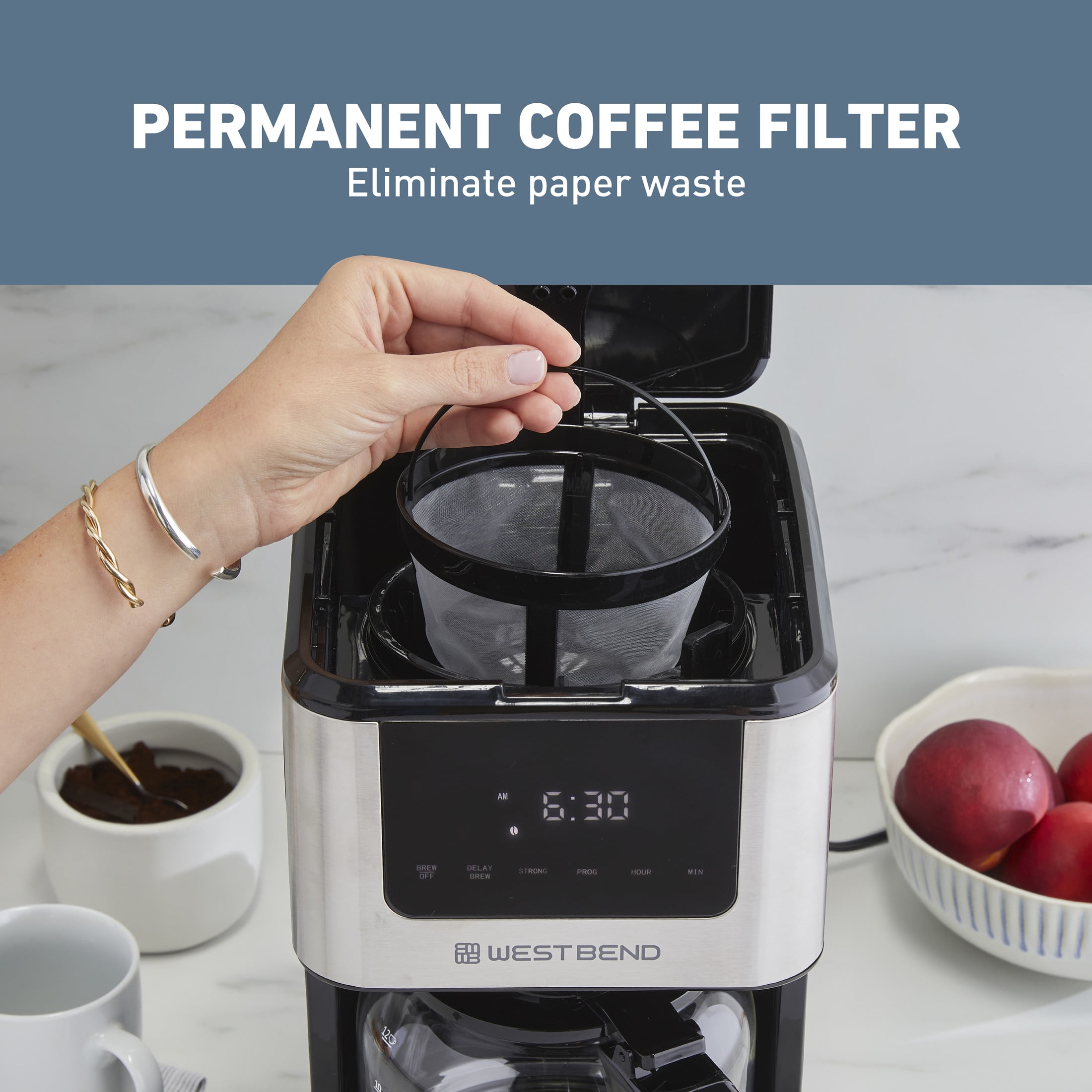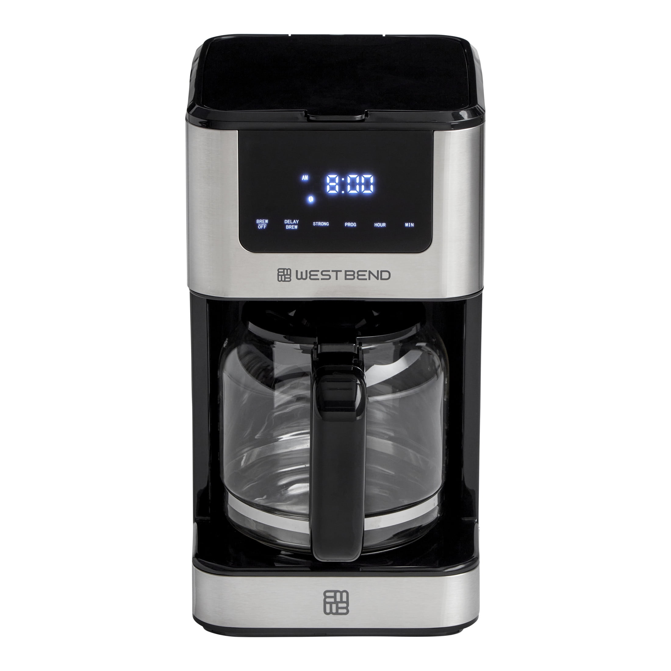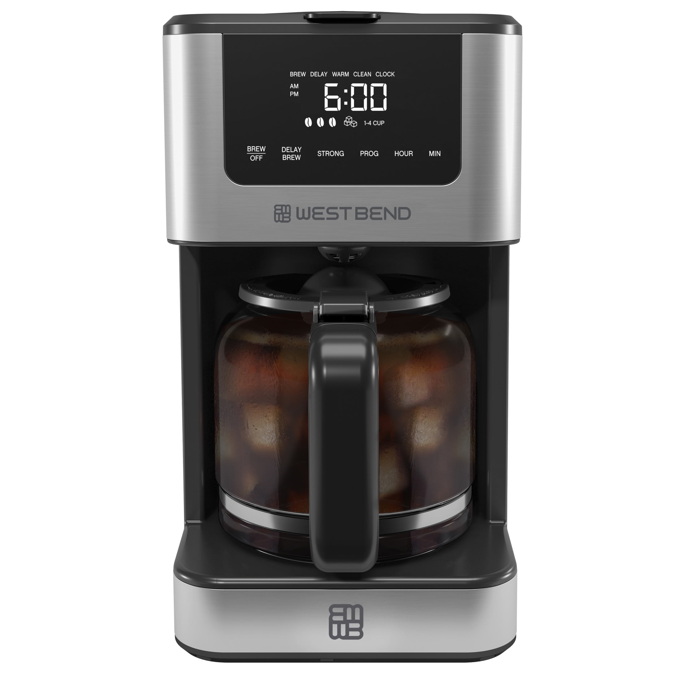 West Bend Stainless Steel 12-Cup Drip Coffee Maker Brews up to 12 cups of coffee for gatherings or personal use Customizable brew strength: choose from mild, medium, bold, or over ice 24-hour programmable feature with delayed brew option allows you to set the timer at night 1-4 cup selector for brewing smaller batches of coffee Anti-drip feature lets you grab a cup mid-brew without making a mess