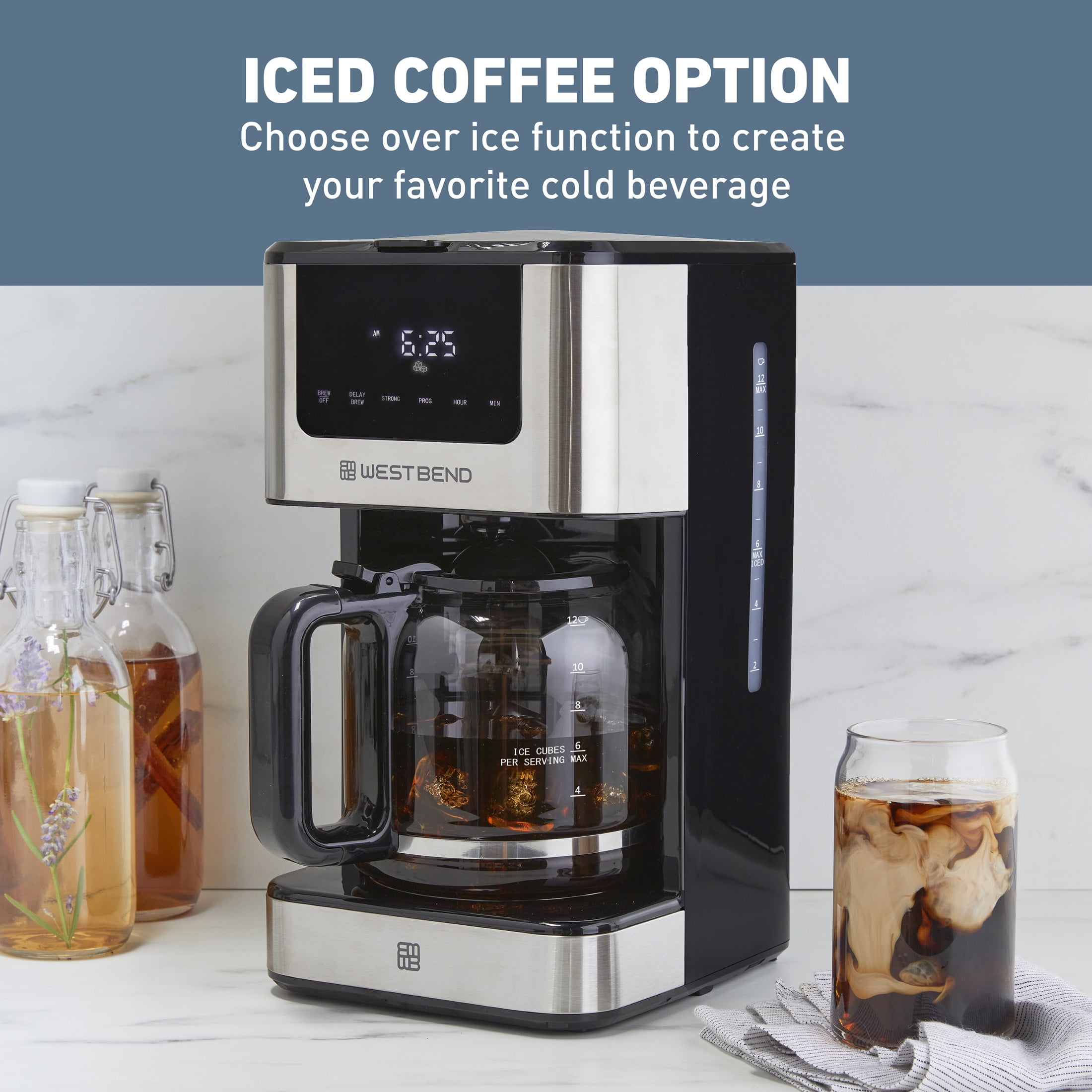 Brew your way in style with the West Bend 12 Cup Programmable Iced & Hot Coffee Maker. The 24-hour programmable feature with delayed brew option allows you to set the timer ahead and wake up to the aroma of freshly brewed coffee. Customize the brew strength to suit your taste–choose from mild, medium, bold or over ice. Brew as little as one cup or up to 12 cups of coffee and optimize your smaller batch brewing with the 1-4 cup option. Enjoy a cup mid brew without making a mess with the anti drip feature. This versatile coffee maker includes a trivet that can be placed on the heating plate to block heat transfer when brewing coffee over ice. Keep your coffee maker optimized for great performance and better tasting coffee with the cleaning reminder. Covered by the West Bend 12-Month Limited Warranty.