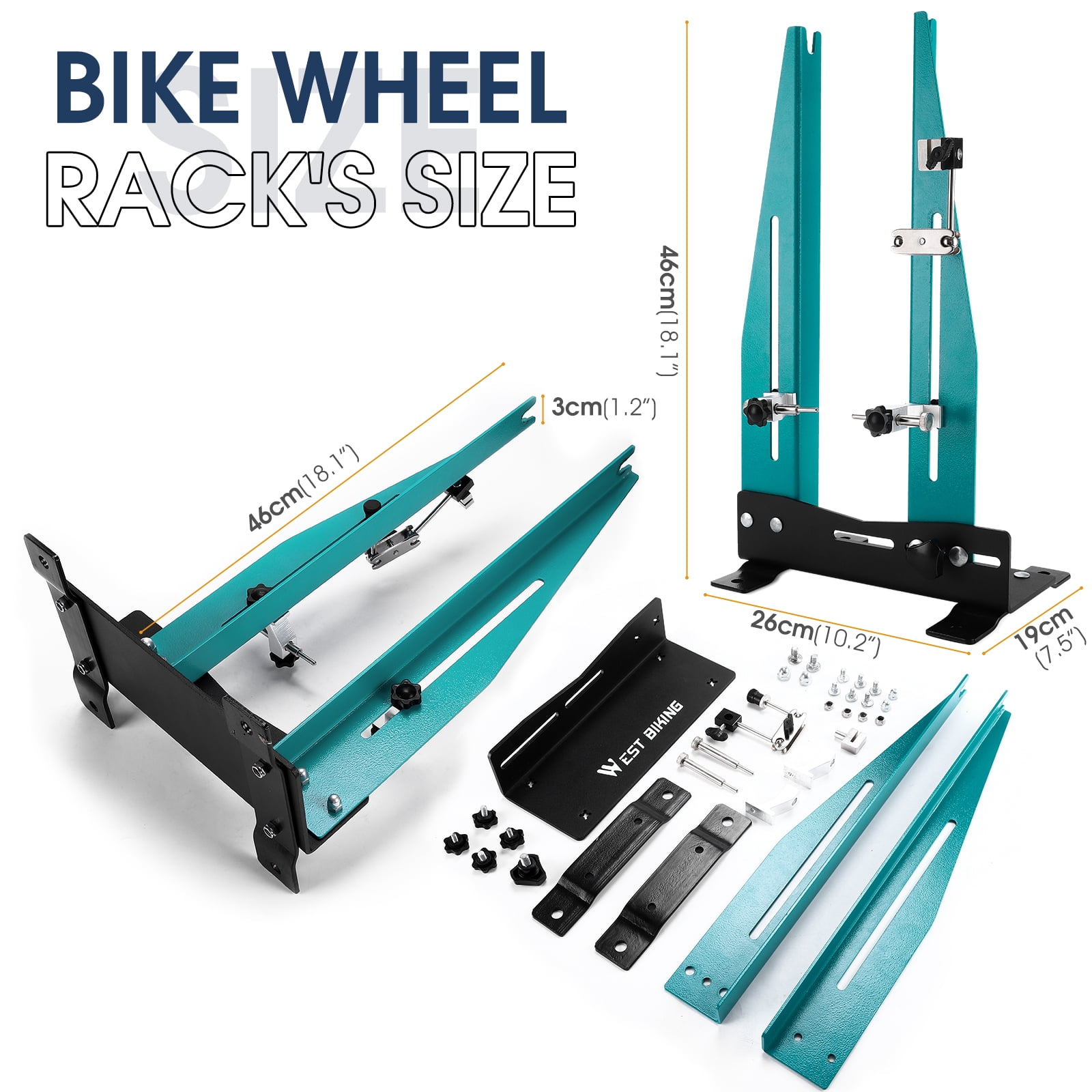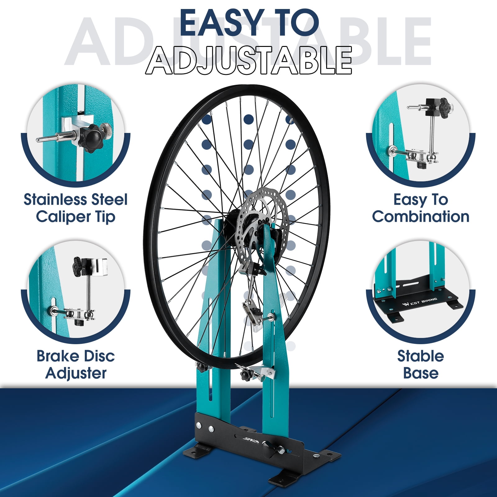 Specification: Brand: WEST BIKING Item Type: bicycle wheel truing stand Material: steel Size: about 46*26*19cm / 18.1*10.2*7.5inch Weight: about 3.46kg Brake Disc Compatible: 140-180mm disc Rim Compatible: 20-27.5 inch,700C quick release wheelset Adjustable Rim Width between 95mm and 130 mm Does not support thru-axle NOTE: The bike wheel truing stand doesn’t work w/thru axles. When debugging the hub, remove bicycle tires. Adjust the circular handle through the width at the bottom to adjust to a suitable position. Removable Metal Structure: The bicycle wheel truing stand is composed of high-strength corrosion-resistant steel, which adopts detachable and upgraded design with a lighter weight of 3.4kg. The volume is smaller after disassembly, which is convenient to carry and store. Adjustable Bearing: The bicycle truing stand is suitable for wheel width from 55mm to 170mm. It doesn’t work w/thru axles.This wheel truing stand can be moved up and down to the appropriate position to adjust the front or rear wheel of the bicycle. This bicycle wheel positioning tool uses metal material to avoid the problem of plastic wear. Brake Disc Adjustment Device: The bicycle wheel truing stand is equipped with a metal brake disc detection device. The deformation of the brake disc will cause potential safety risks to your safety. The bicycle brake disc detection device can find and correct the deformation of the brake disc that is not perceptible to the naked eye to ensure the safety of your riding. Simple Installation & Use: The bike wheel truing stand only takes a few minutes to be fastened by black knobs and nuts. The base is fixed by two support plates and four screws, which ensures the stability of the bike workstand in use and will not cause rollover accident. The included axle wrench helps you with better maintenance.