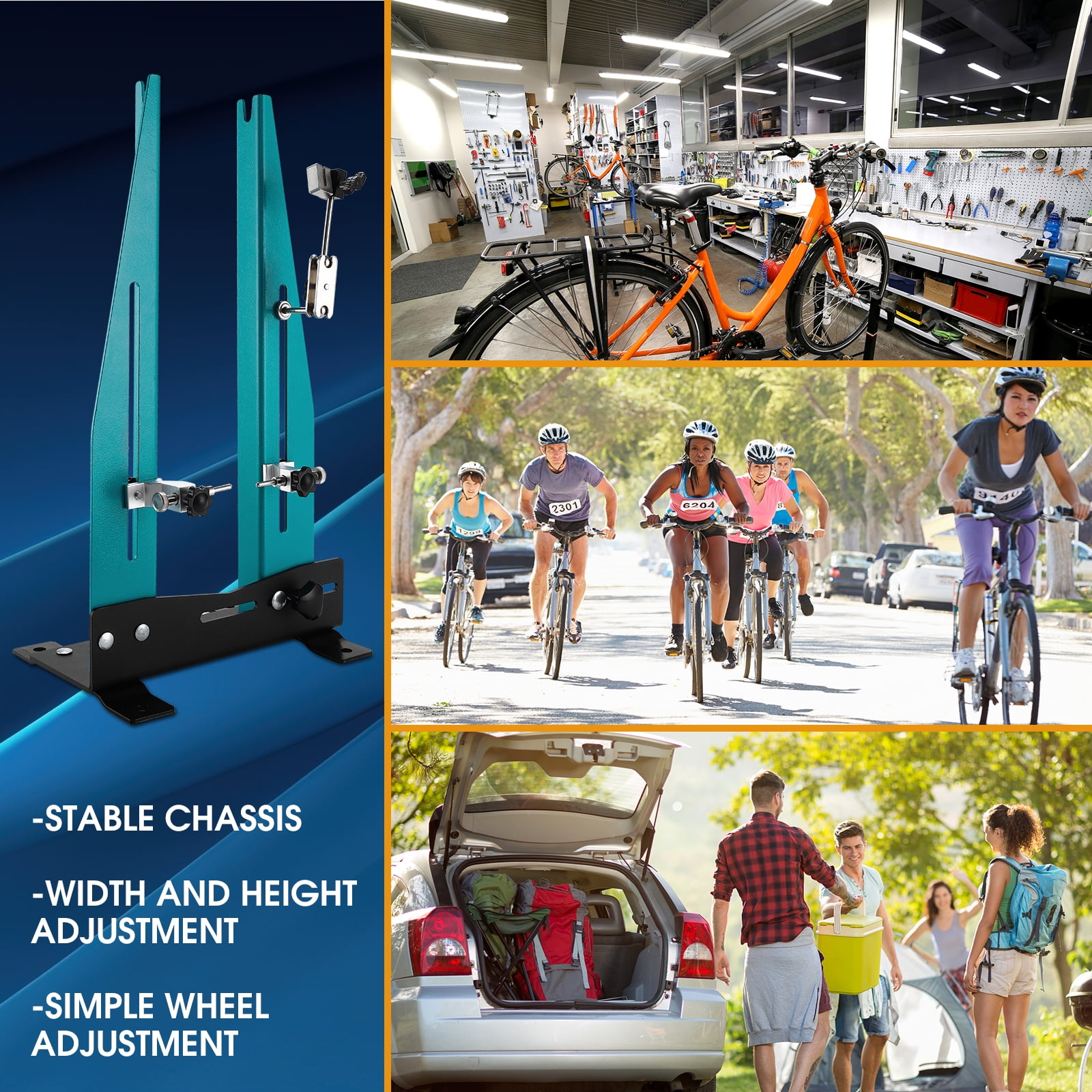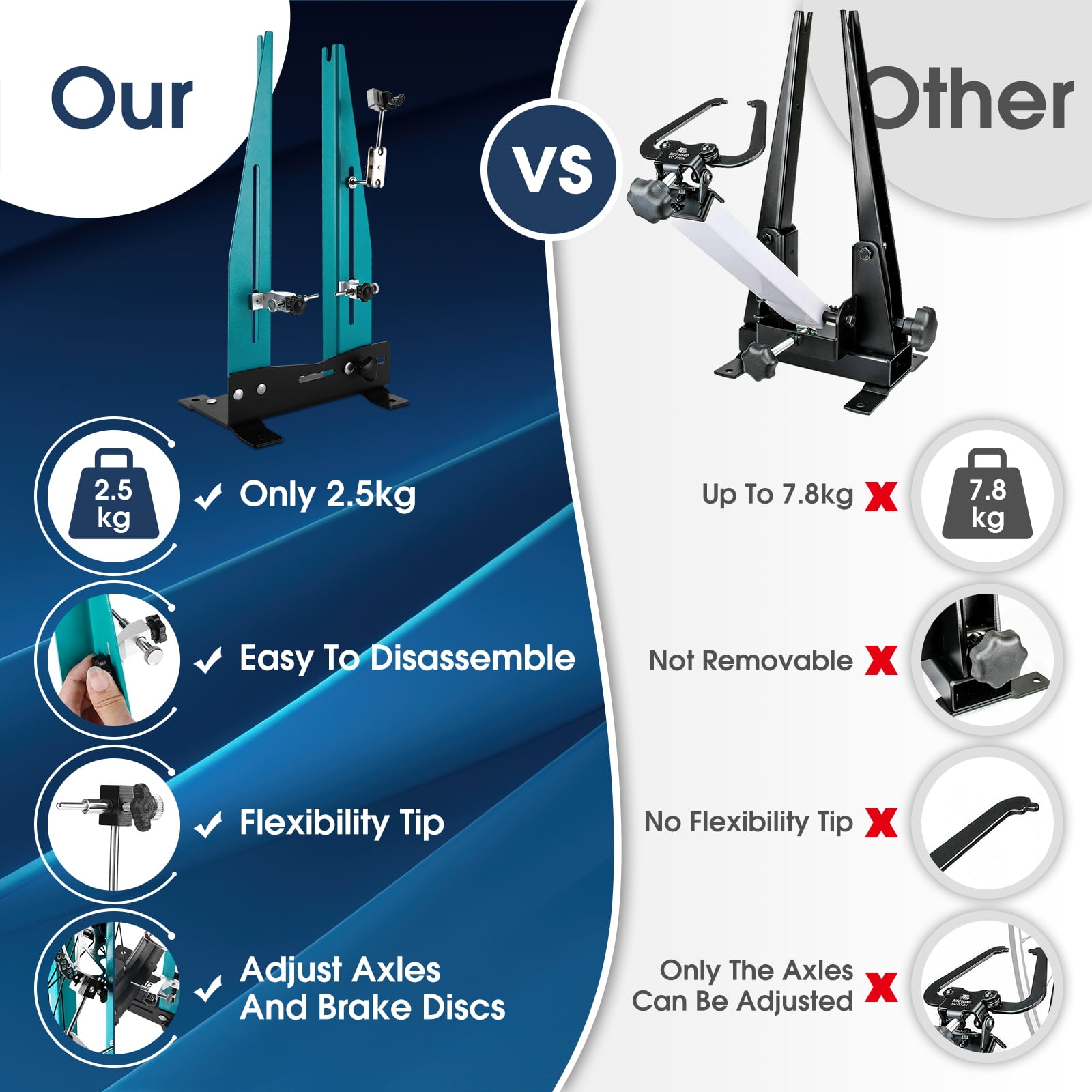 The bike wheel truing stand is made of high-strength corrosion-resistant steel, the 2.5 kg weight repair stand is removable for easy portability and storage. Designed for the home mechanic, this bike wheel tuner is the economical choice for precise adjustment of bicycle wheels by repairing tires and brake discs at the same time. It’s suitable for kids bike, folding bike, road bike, mtb, cx/gravel, fat bike,e-bike, city bike, etc.