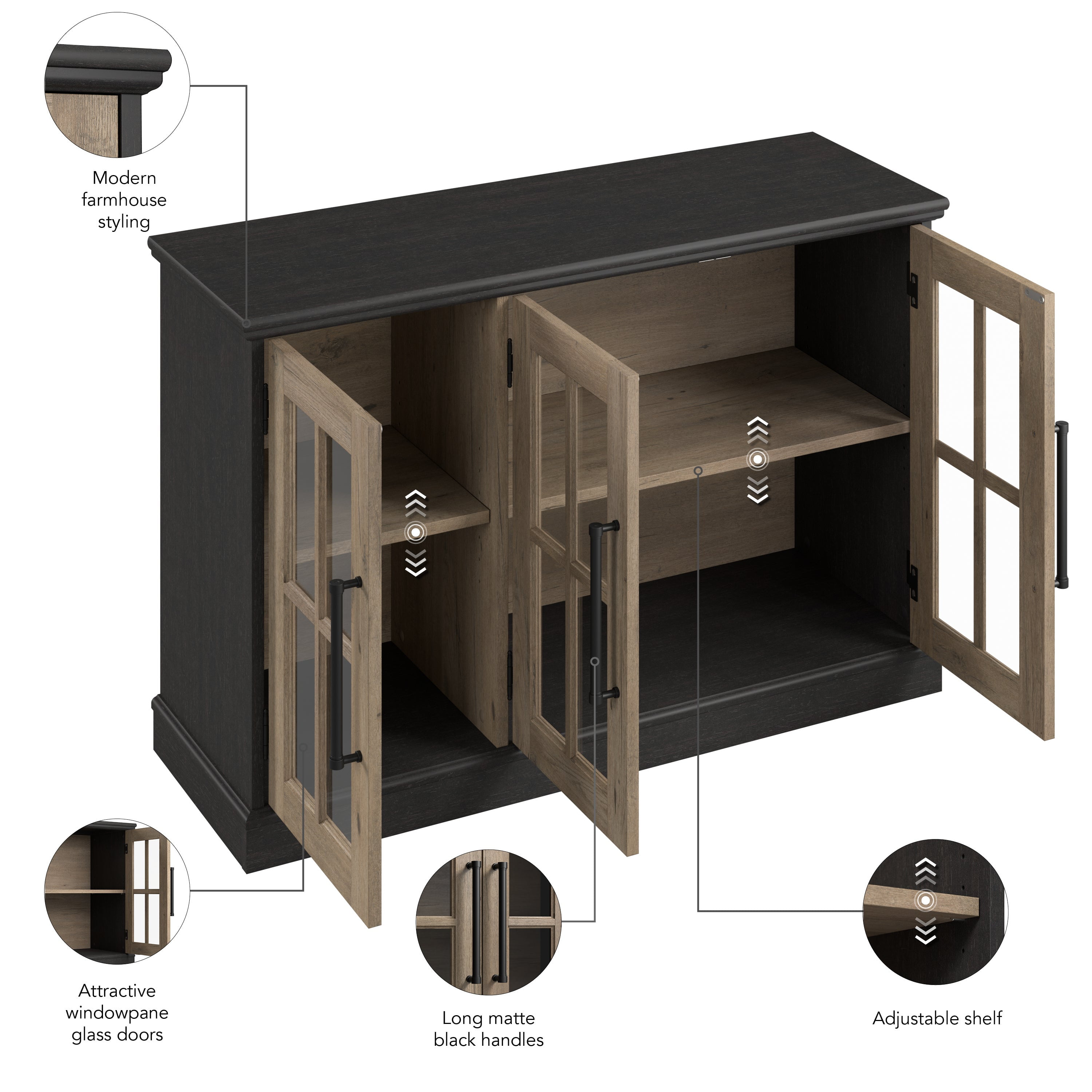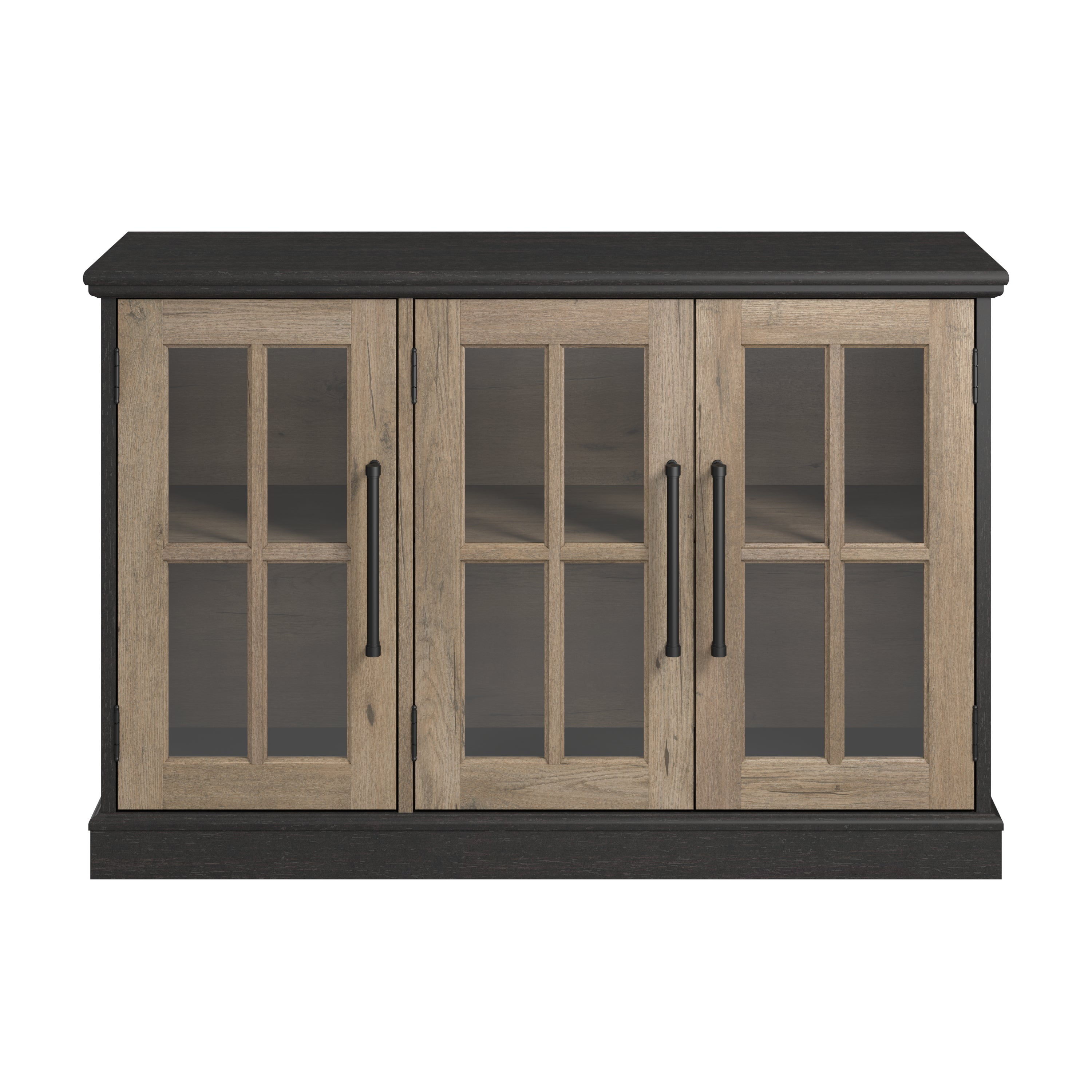 The Bush Furniture Westbrook 46W TV Stand for 65 Inch TV offers a beautiful living room solution that allows you to organize all your home media essentials. The entertainment center can support televisions up to 65 inches and/or 55 pounds. Lovely windowpane glass doors cover the cabinet’s adjustable shelves to keep your DVD and video game collection safely tucked away. The shelves can support up to 50 pounds, so you can store heavier items with confidence. The cabinet doors are adorned with long matte black handles and exposed barrel hinges that reflect the best elements of modern and farmhouse styling. The TV stand with storage features built-in wire management to keep cables in order. This farmhouse tv stand has been meticulously tested to meet or exceed industry standards for safety, durability, and performance and is backed by the Bush Furniture 1 Year Manufacturer’s Warranty. Features: This 46W TV stand offers a perfect home entertainment solution with space to organize media Media console’s durable surface accepts up to a 65 inch television and/or 55 pounds Entertainment center with windowpane glass doors contains one adjustable shelf on each side to showcase your DVD and video game collection while still keeping them safely tucked away Adjustable shelves have a weight capacity of 50 pounds, so you can organize your media essentials with confidence TV stand with storage includes built-in wire management to keep cords and cables in order Media cabinet adorned with long matte black handles and exposed barrel hinges to reflect the best elements of modern and farmhouse styling Wall attachment hardware included for family-friendly safety and security Bush Furniture’s commitment to safety includes rigorous testing that meets or exceeds industry standards TV entertainement center is backed by a 1 Year Manufacturer’s Warranty Coordinating items in the Westbrook Collection include home office desks, file and storage cabinets, bookcases, and more Specifications: Product Color: Vintage Black/Restored Tan Hickory Product Weight: 91.2