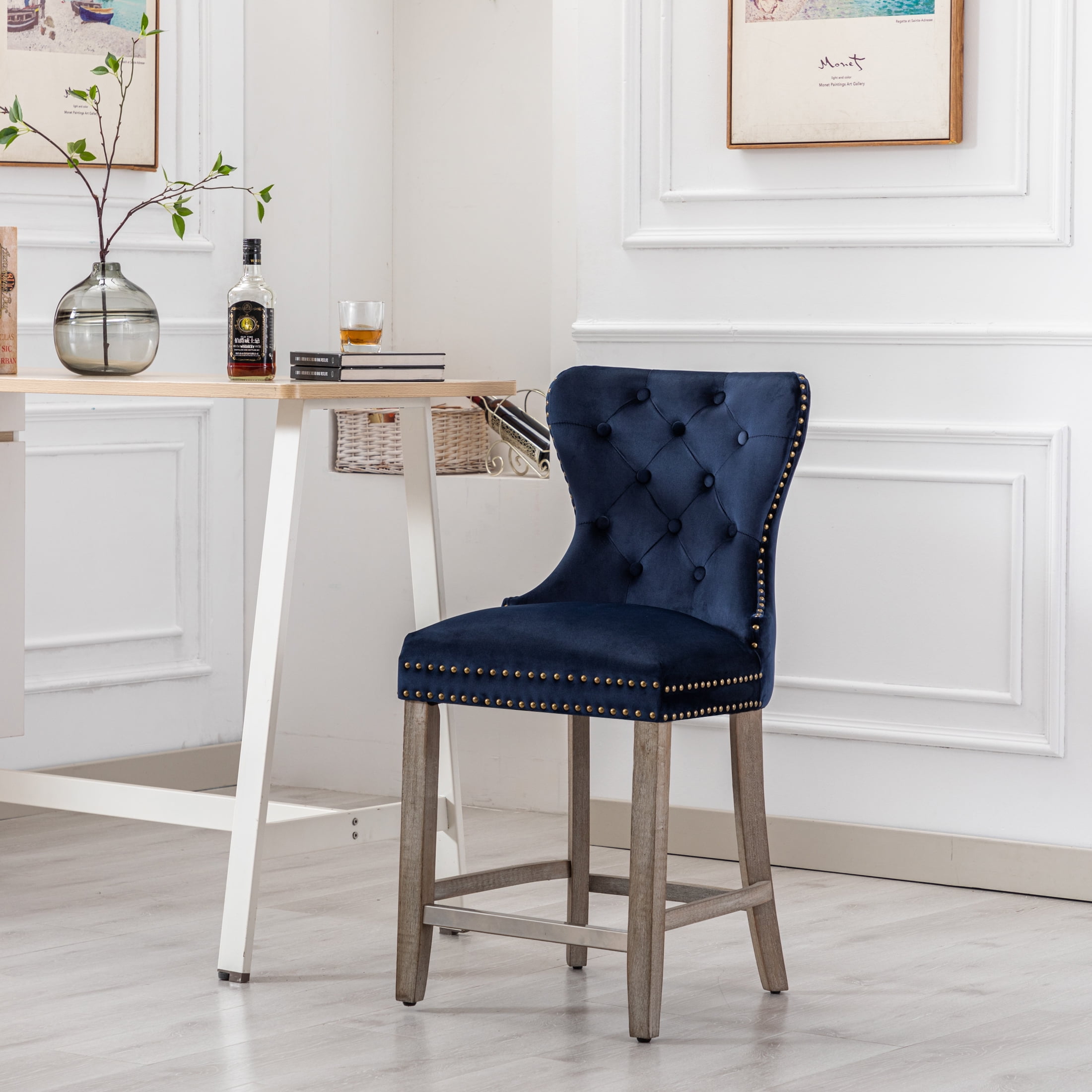 Westin Outdoor 24″ Tufted Velvet Bar Stool, Antique Gray/Velvet Navy Blue