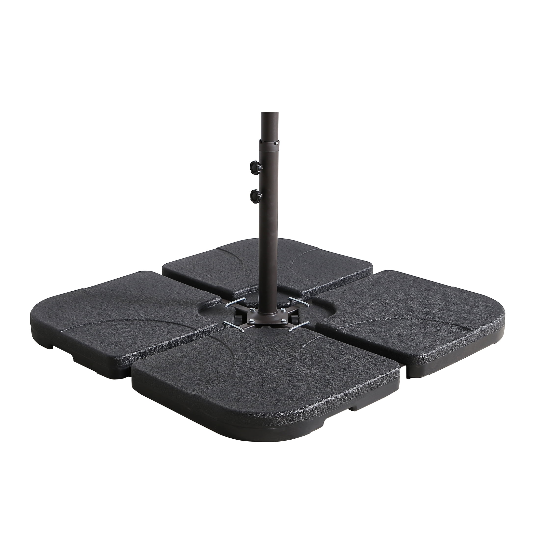 Give your guest a comfortable outdoor shade with this UV & weather resistant solar powered led cantilever patio umbrella. A perfect option because it includes a heavy duty 4-piece weighted base to keep the cantilever umbrella in its upright position when in use. The energy efficient solar powered LED lights continue to provide a smooth light at night. Easy to crank open mechanism and rust resistant materials makes it a great option for any outdoor patio. Everything you need for your poolside, patio, or lounge area.