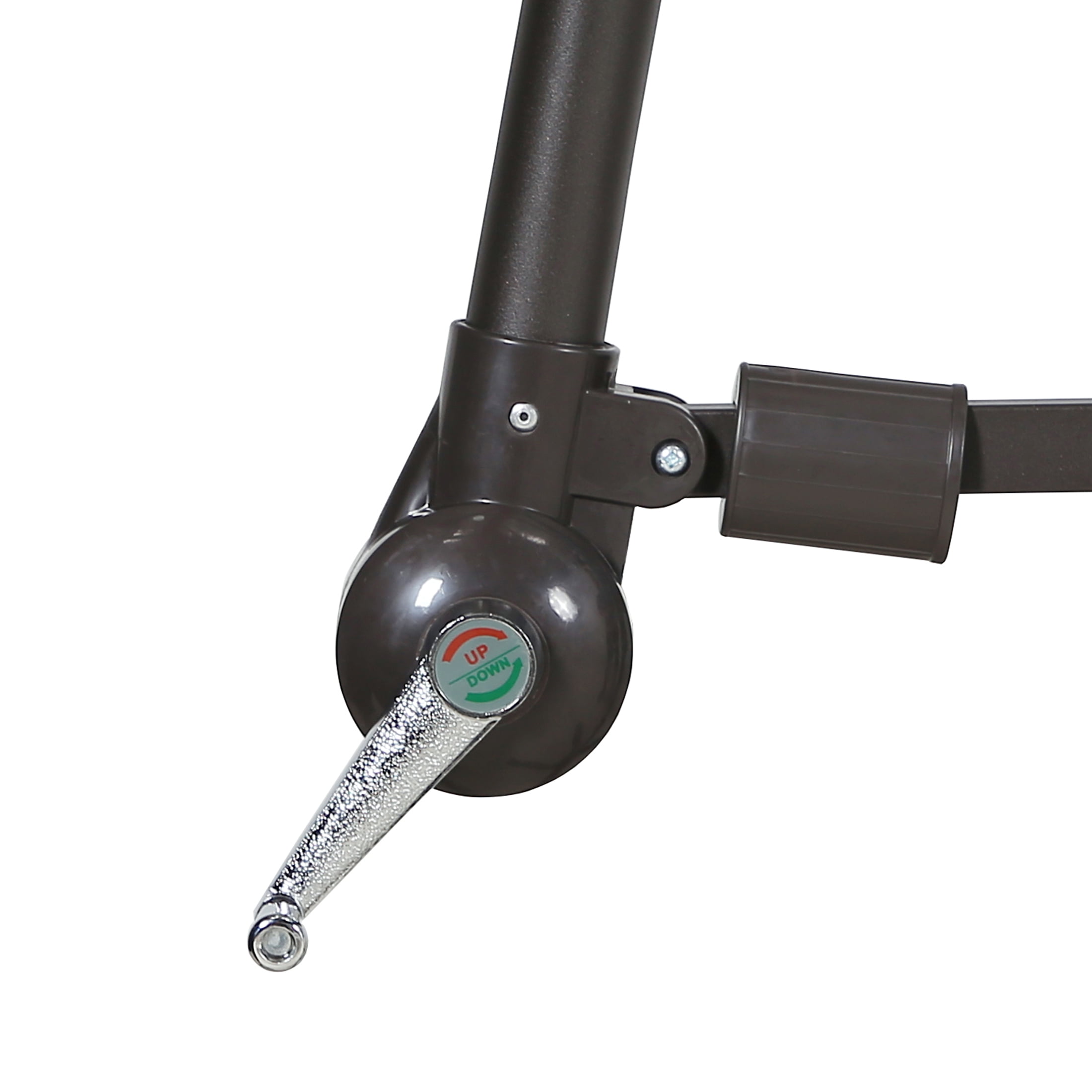 Ideal for outdoor shade and outdoor living. Rust resistant steel ribs and pole. Hanging umbrella with crank. Included for Maximum Support: Heady duty 4-piece umbrella base weights.