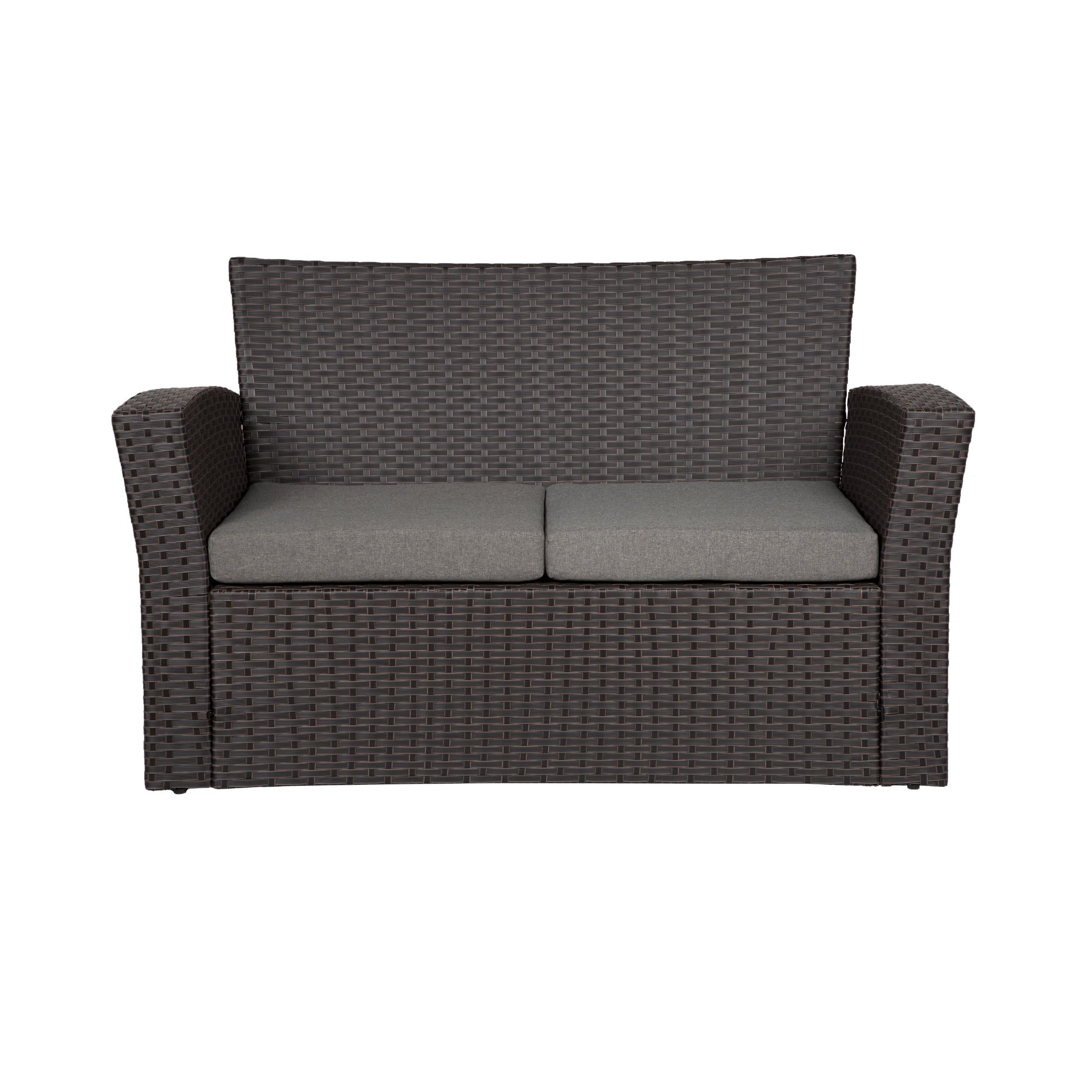 WestinTrends 4pc Outdoor Furniture Conversation Sofa Set with Loveseat, Cofee Table and Cushions, All Weather UV Resistant Rattan Wicker Patio Chairs, Chocolate/Gray
