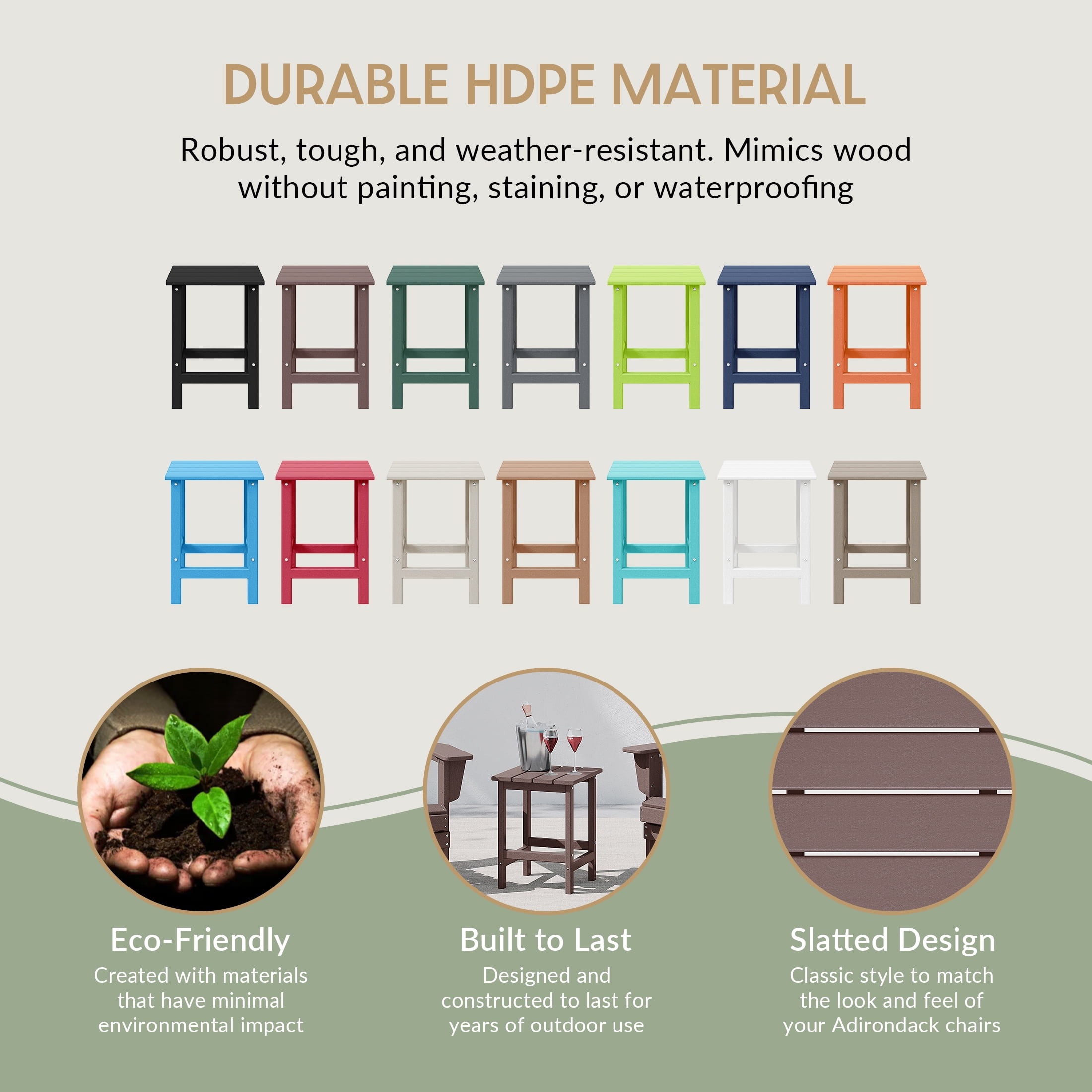 Perfect Size: 14″L x 14″W x 18.3″H, This small outdoor table will not take up too much space. Perfect to put your books, drink, flowers on, you could free your hands and enjoy your time. This outdoor side table is the perfect companion for adirondack chair, chaise lounge and rocking chair. All Weather Resistant: The plastic side table are made of HDPE plastic, its weather resistant and UV fade resistant material can withstand in various enviromental pressure and not easy to dent, crack , peel or rot as wood. Indoor Outdoor Table: Dynamic use in patio, garden, lawn, porch, pool area to complement your adirondack chairs for party and picnic, also suitable in living room, bedroom, kitchens, as an office end table or plant stand, almost applies to everything. Maintenance Free: Requires no painting, staining, waterproofing, or similar maintenance. You can clean easily with soap, water, a soft-bristle brush or sanding sponge included. 90% Pre-Assembled: This adirondack end table will come with 4 parts, clear instructions and necessary hardware provided. Only need 3 steps according to the manual included, and you will get a outdoor side table. Recommended Use: Indoor & Outdoor