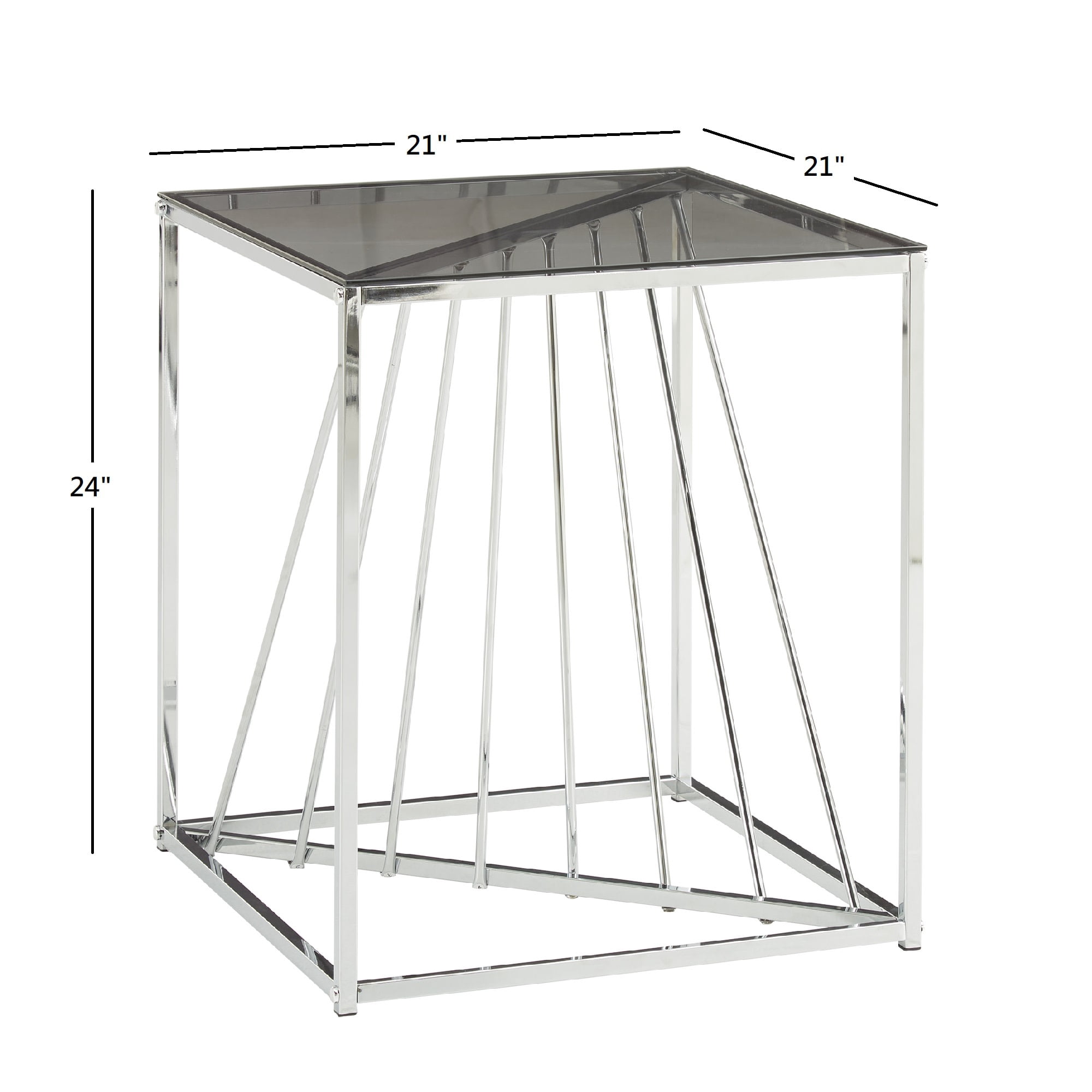 Includes one (1) end table Dimensions: 21 in. x 21 in. x 24 in. Comes in multiple finishes Extraordinary lined detailing on the base Made with metal tube and glass Assembly required Ships in one (1) box
