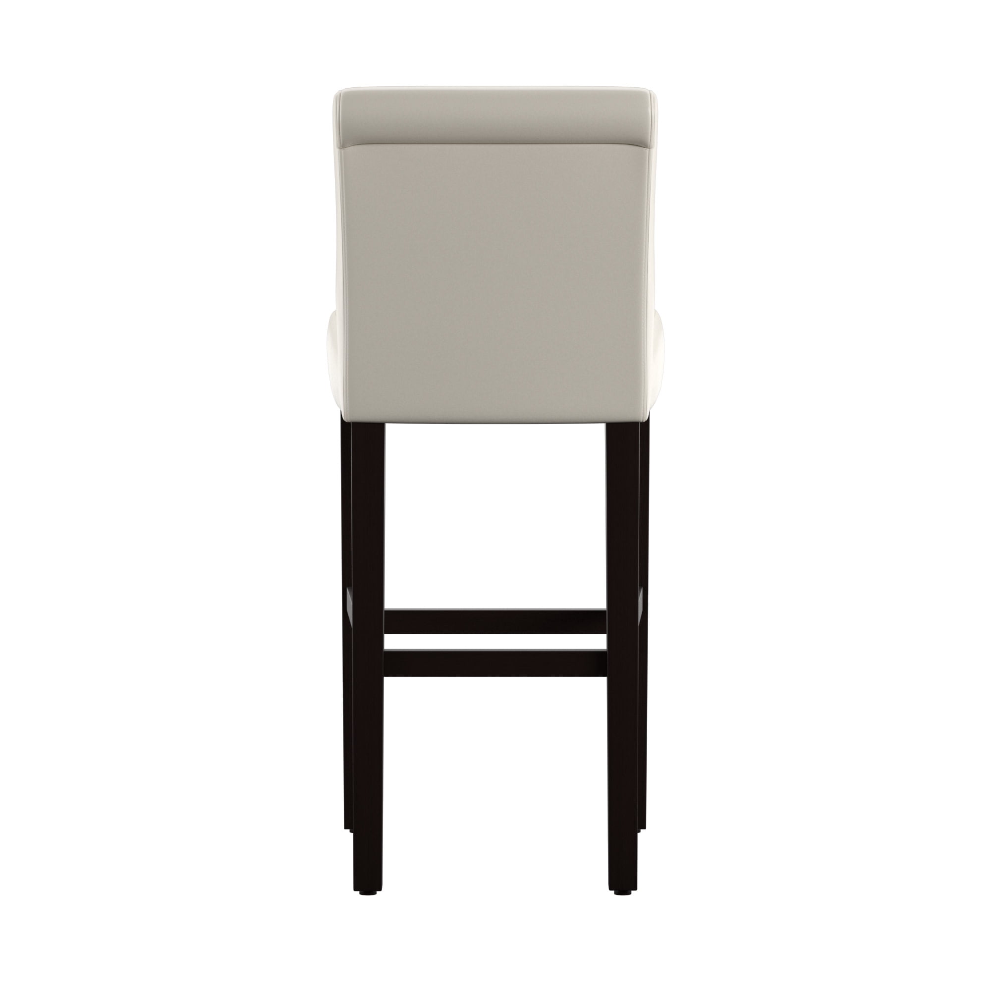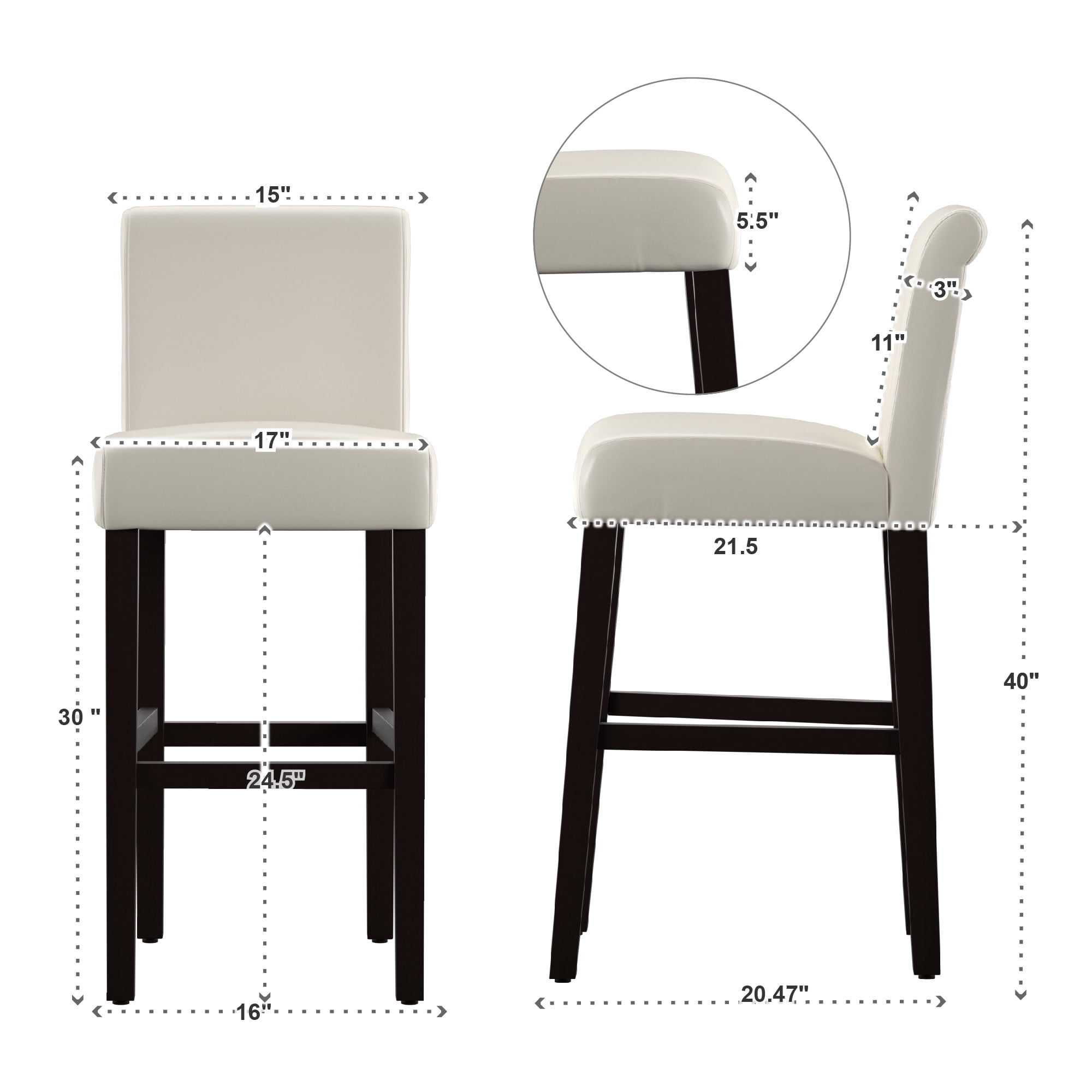 Set Includes: Two (2) bar height stools Overall Dimensions: 20 inches deep x 16.5 inches wide x 40 inches high Seat height: 29 inches Asian wood construction, known for sturdiness and longevity Polyester and spring fill White PU upholstery material Faux leather seats Black legs Assembly required Ships in one (1) box