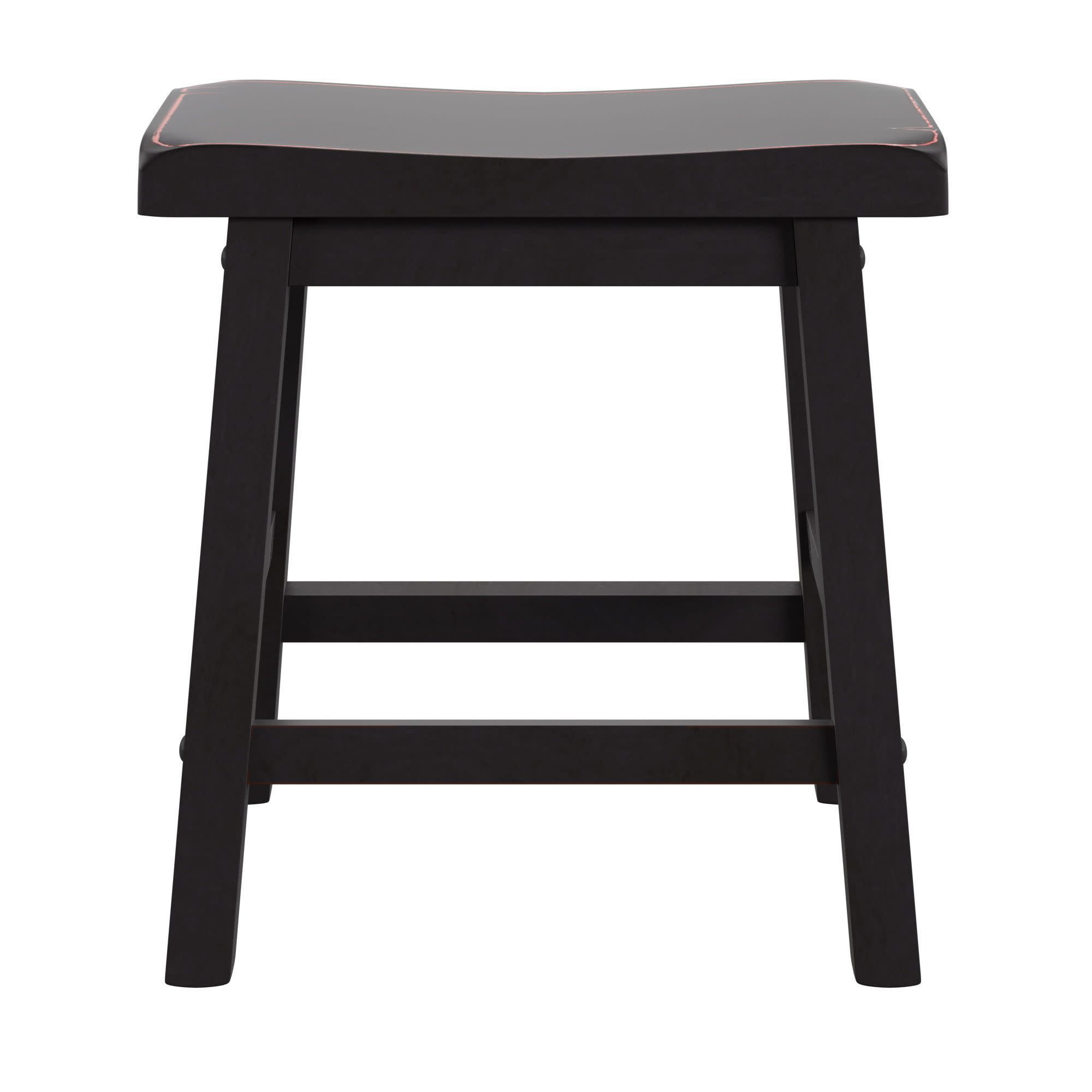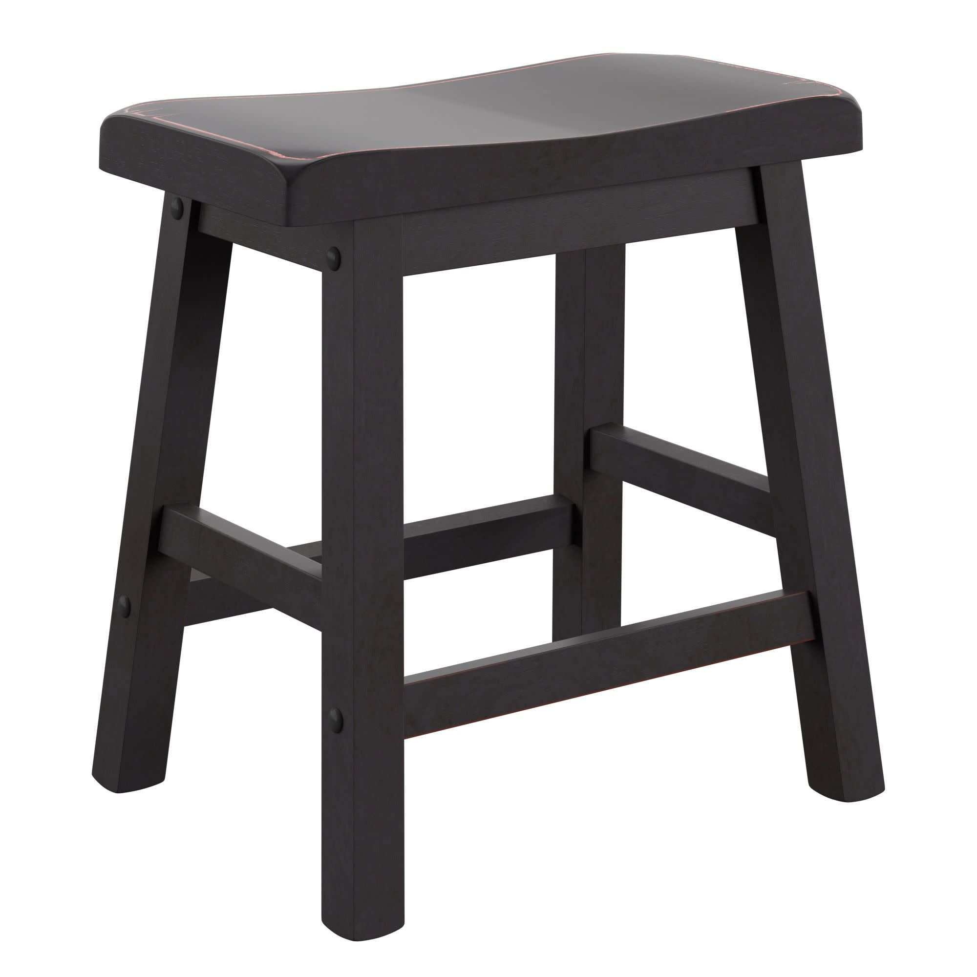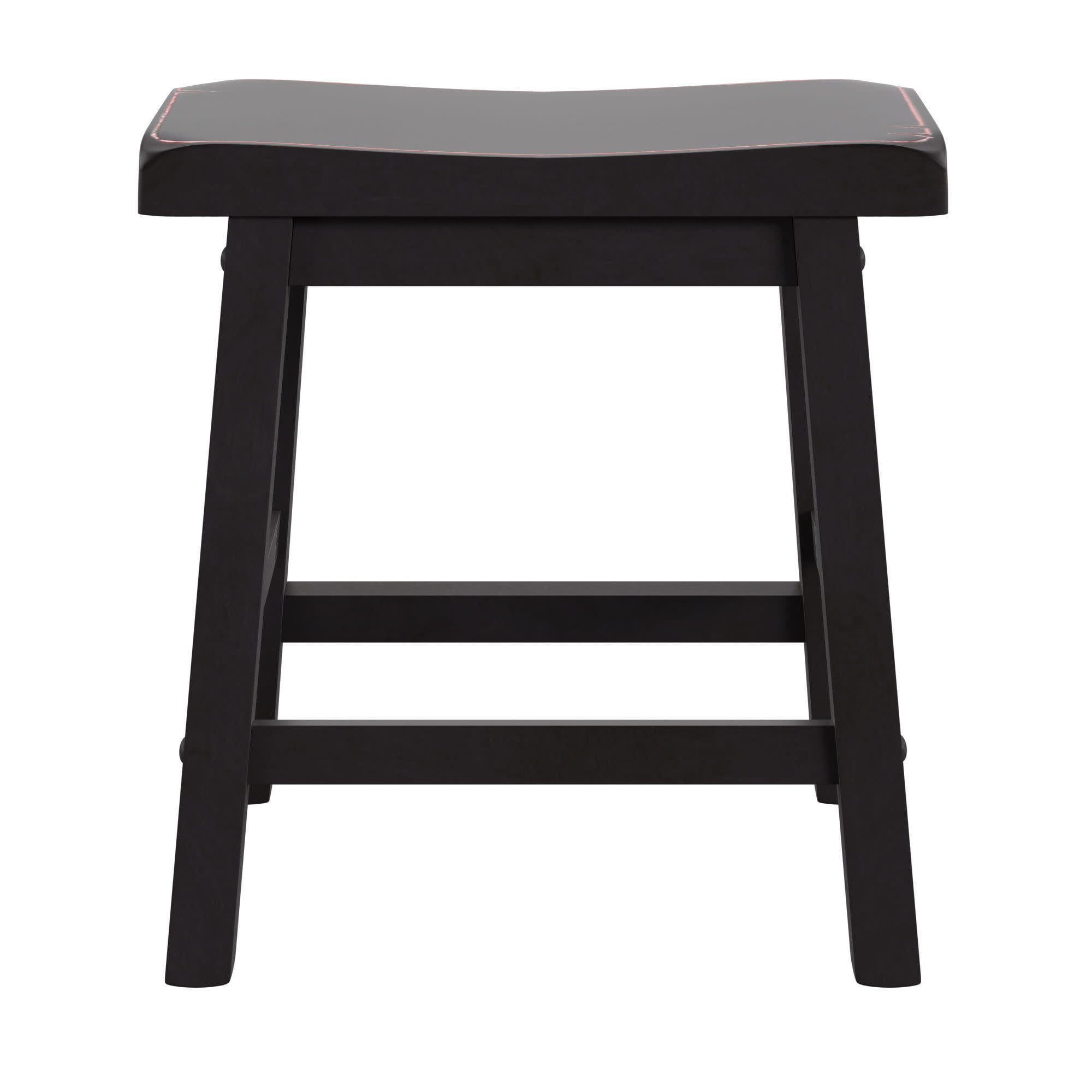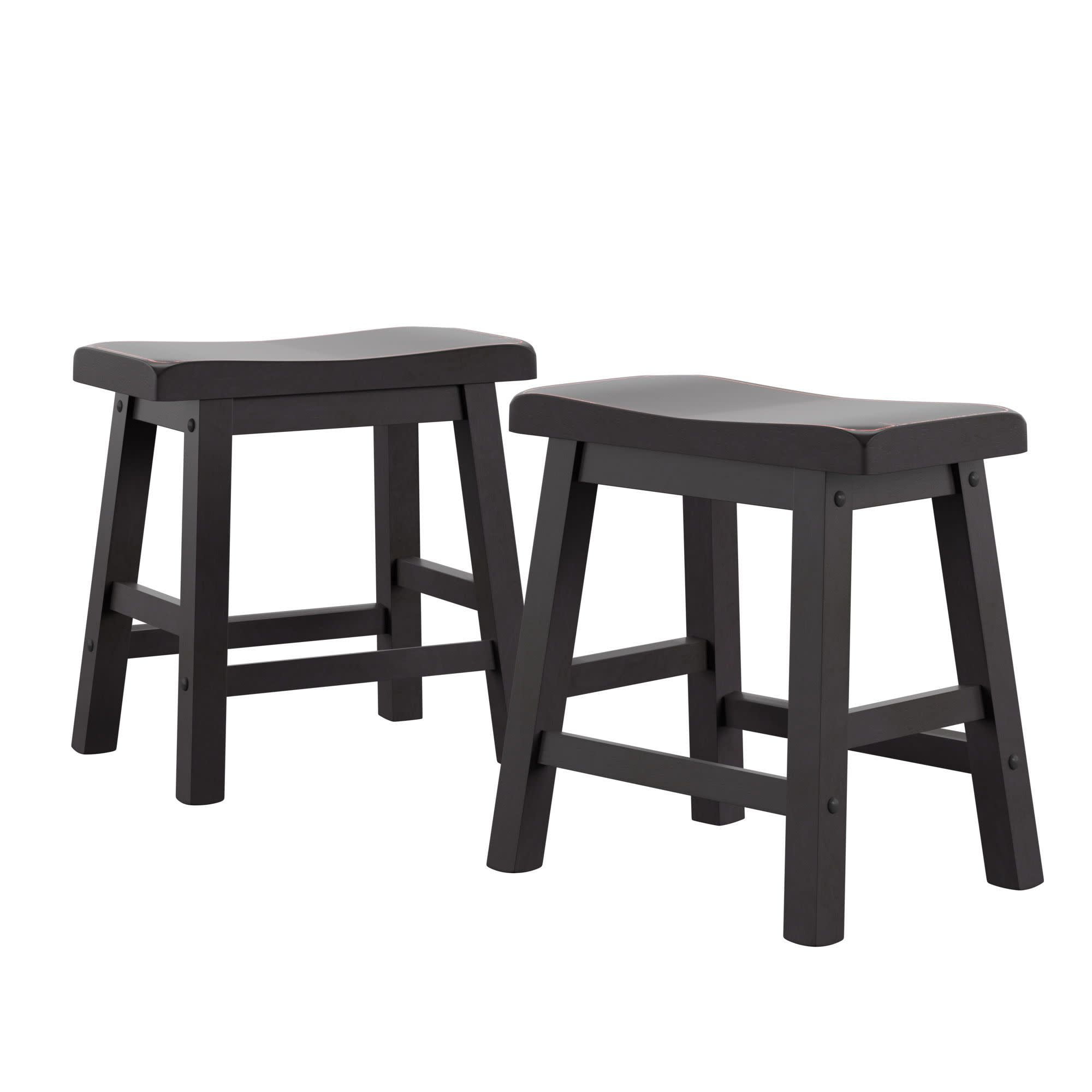 Set includes two (2) stools Overall dimensions: 17.72 in. width x 9.25 in. depth x 17.72 in. height Individually hand distressed for a unique look no two pieces are identical Ideal for 28–30-inch table heights Crafted with solid rubberwood Backless Black finish Ships in one (1) box Assembly required