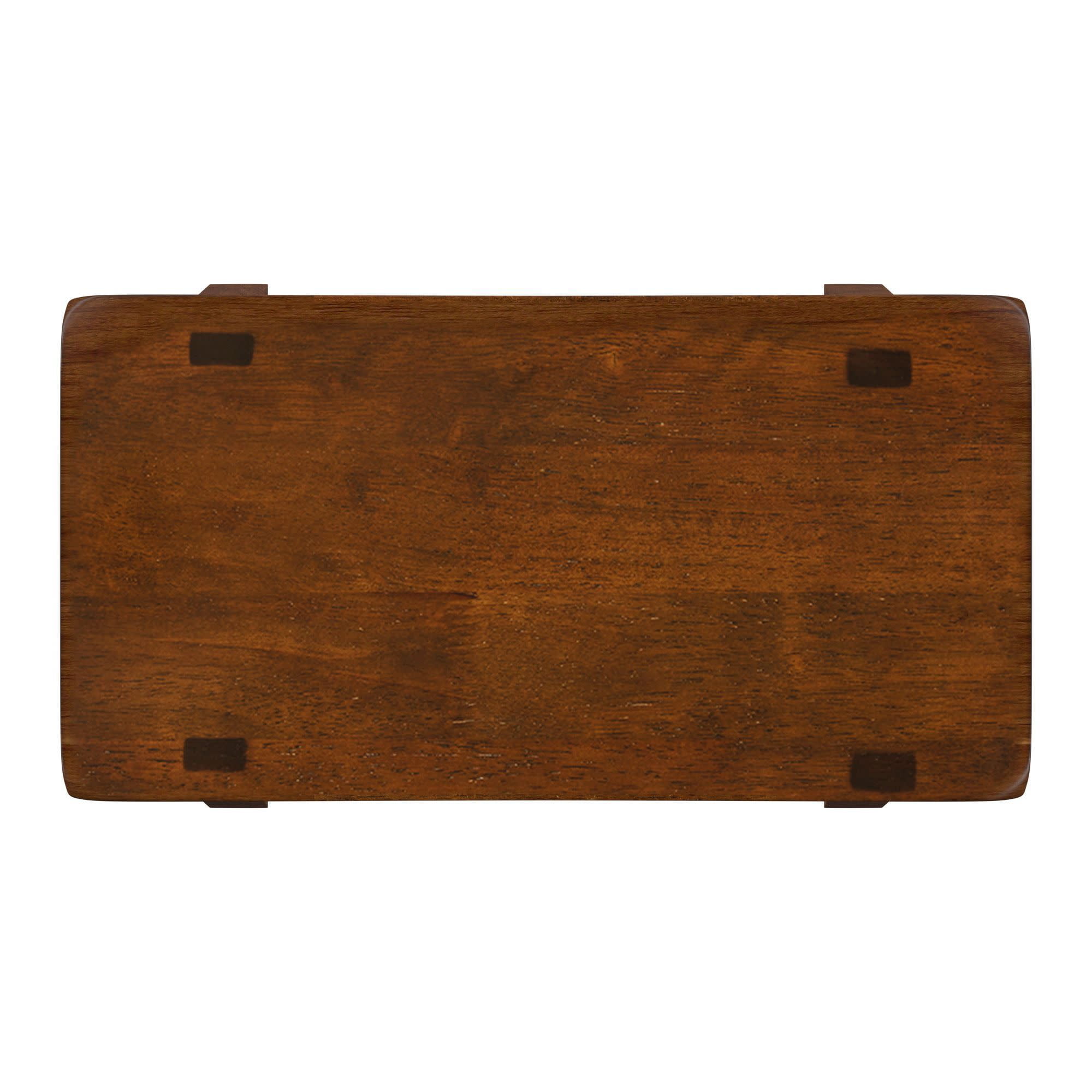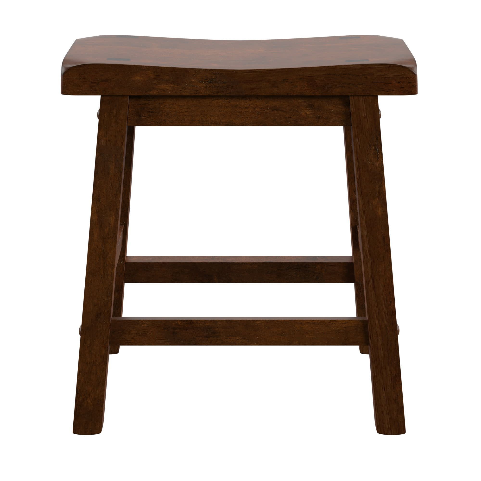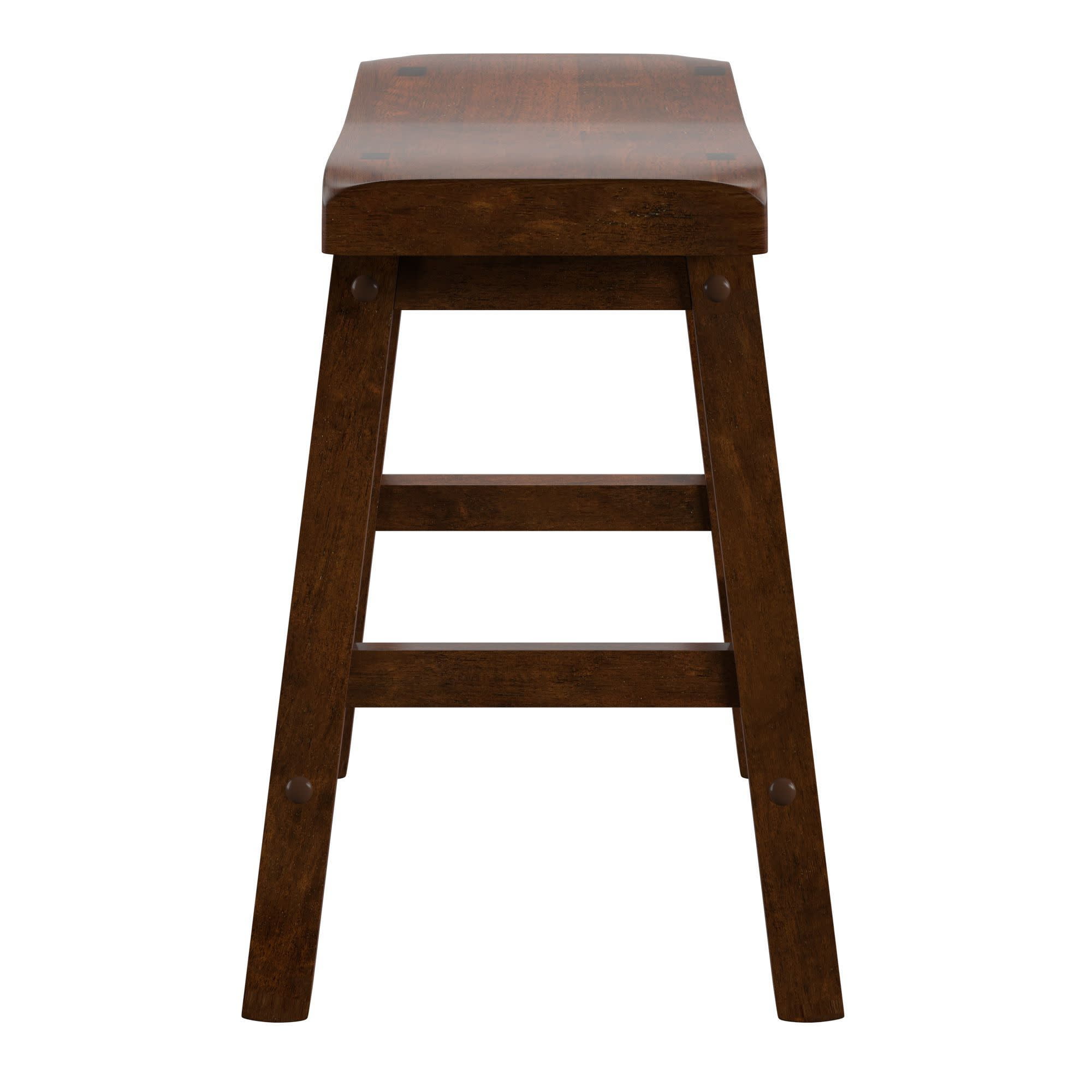 Set includes two (2) stools Overall dimensions: 17.72 in. width x 9.25 in. depth x 17.72 in. height Individually hand distressed for a unique look no two pieces are identical Ideal for 28–30-inch table heights Crafted with solid rubberwood Cherry finish Ships in one (1) box Assembly required Backless