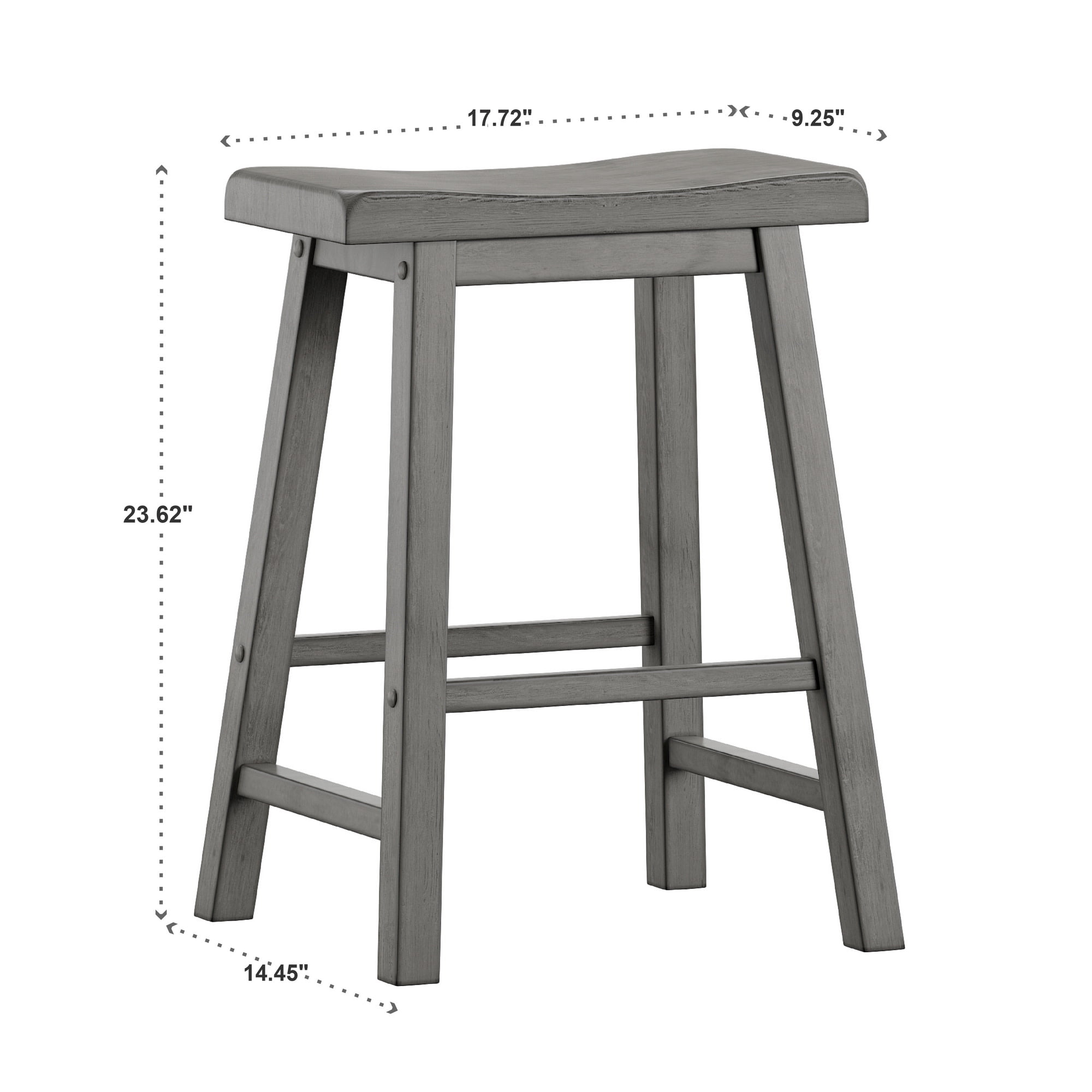 Set includes two counter height (2) stools Overall dimensions: 17.72 in. width x 14.45 in. depth x 23.62 in. height Individually hand distressed for a unique look so no two pieces are identical Traditional saddleback style Ideal for 34-66 inch table heights Antique grey finish Solid rubberwood construction Ships in one (1) box Assembly required