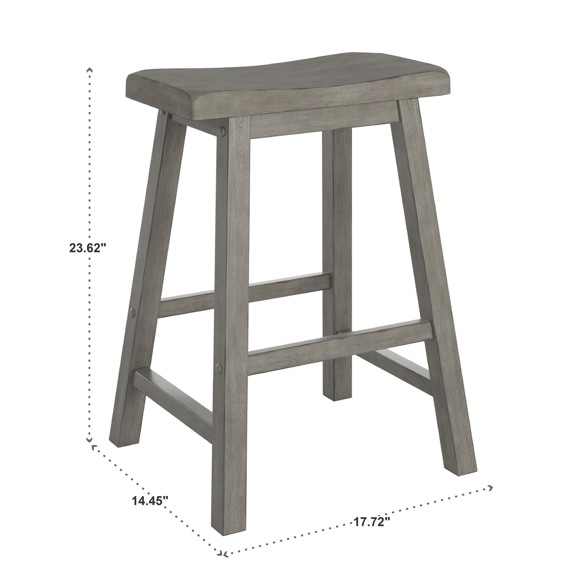 Includes two (2) counter height stools Oak, antique sage green, antique black, antique dark denim, antique grey, antique berry red, or antique white finish options Traditional saddleback style Durable and eco-friendly rubberwood construction Seat: 17.7 inches wide x 9.3 inches deep x 23.6 inches high Base: 17.3 inches wide x 14.5 inches deep Overall: 17.7 inches wide x 14.5 inches deep x 23.6 inches high