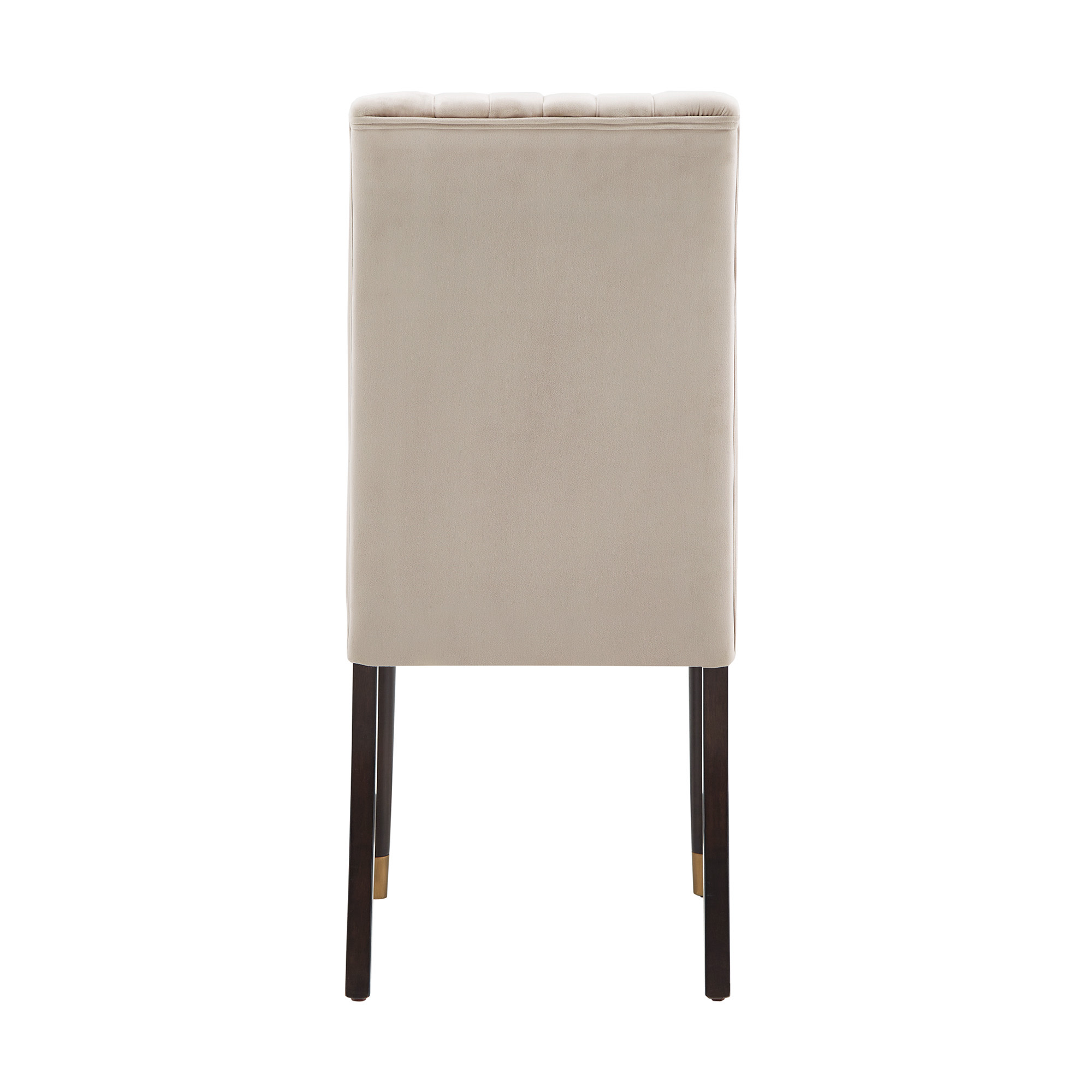 Overall chair dimensions: 19 in. width x 23 in. depth x 38 in. height Seat height: 18.62 in. Set includes two (2) dining chairs Warm, espresso wood finish on legs Decorative gold caps on front two legs add a pop of glamour Soft velvet upholstery Channel tufted backrests Made with rubberwood, MDF, foam, and velvet