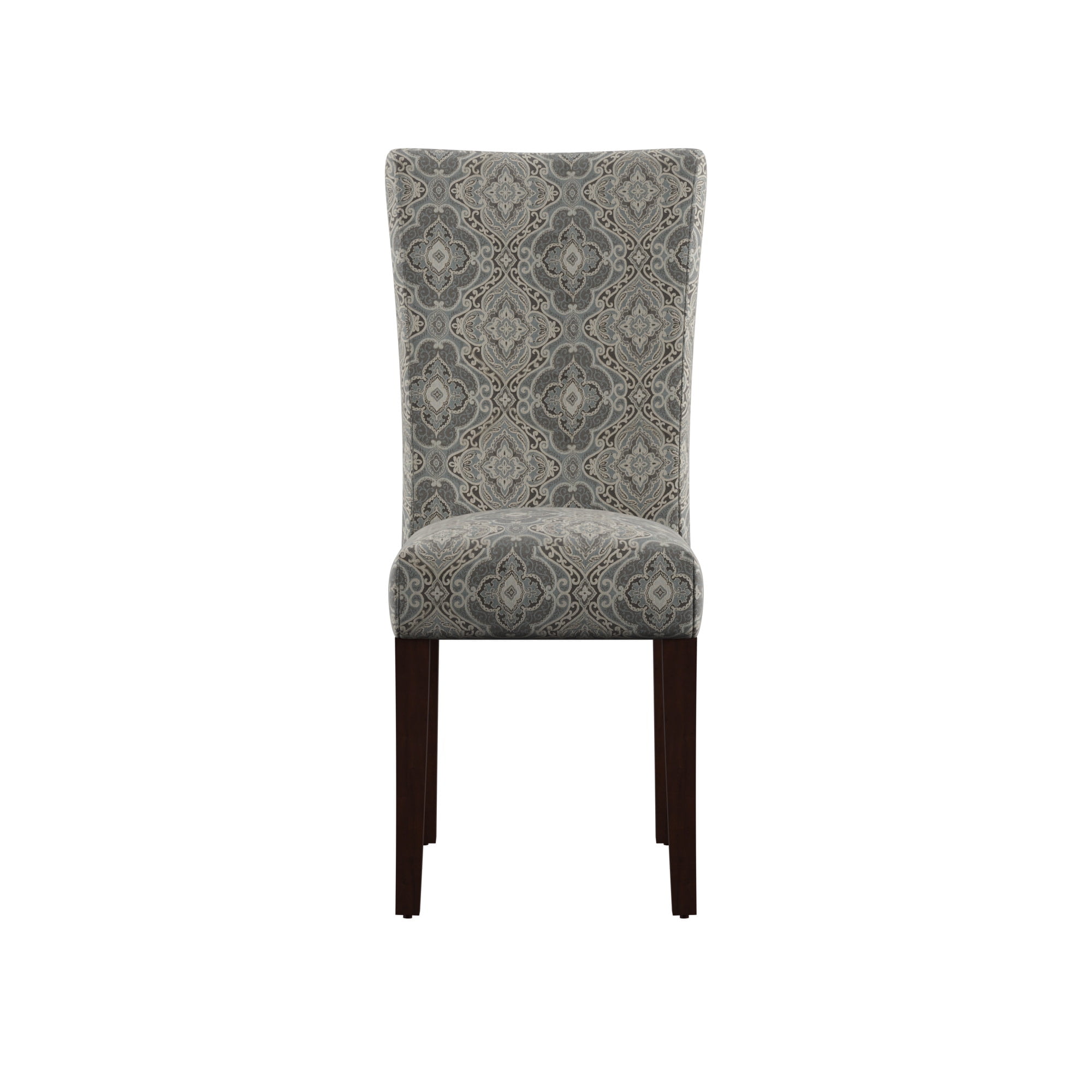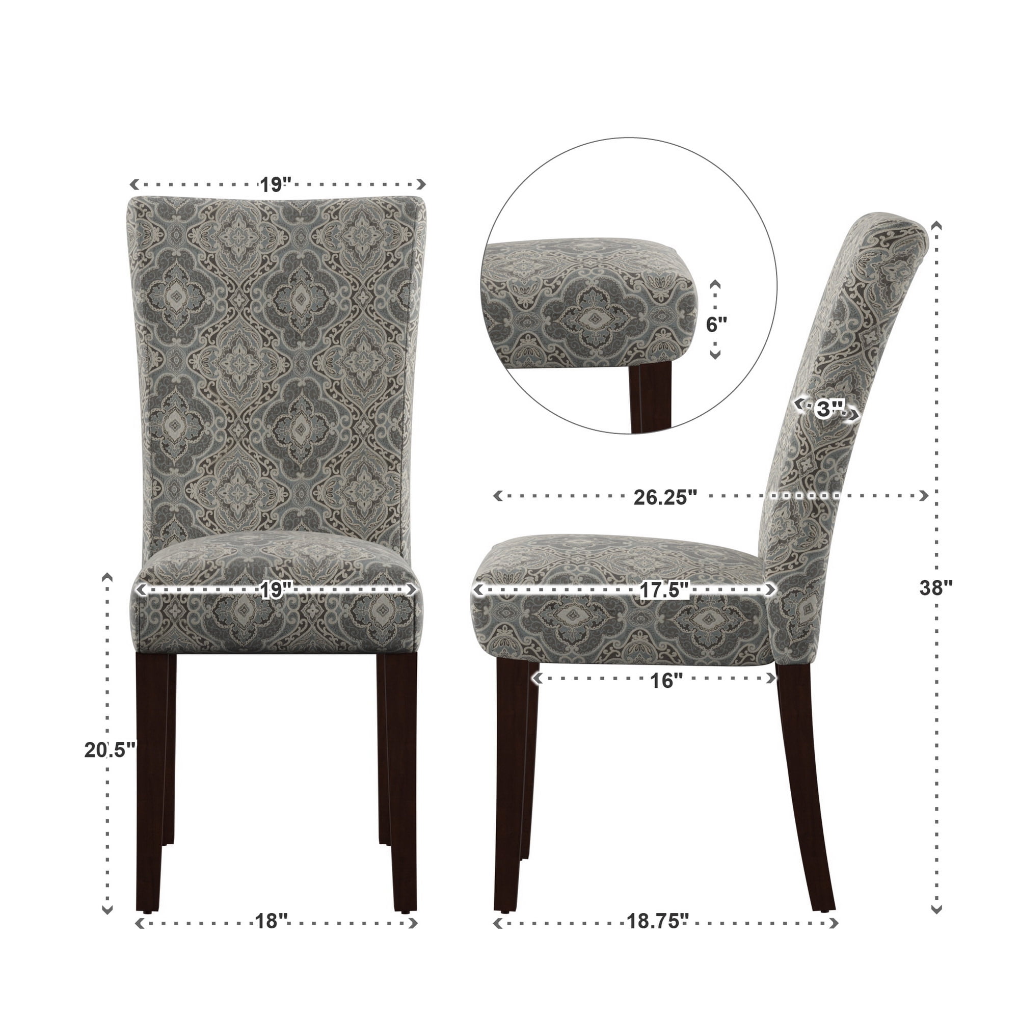 Set includes two (2) dining chairs Overall dimensions: 19 in. width x 26.25 in. depth x 38 in. height Seat dimensions: 19 in. width x 17 in. depth x 20.5 in. height Soft, printed fabric upholstery Espresso-finished legs Innerspring and foam fill cushion provide supportive comfort Assembly required Ships in one (1) box