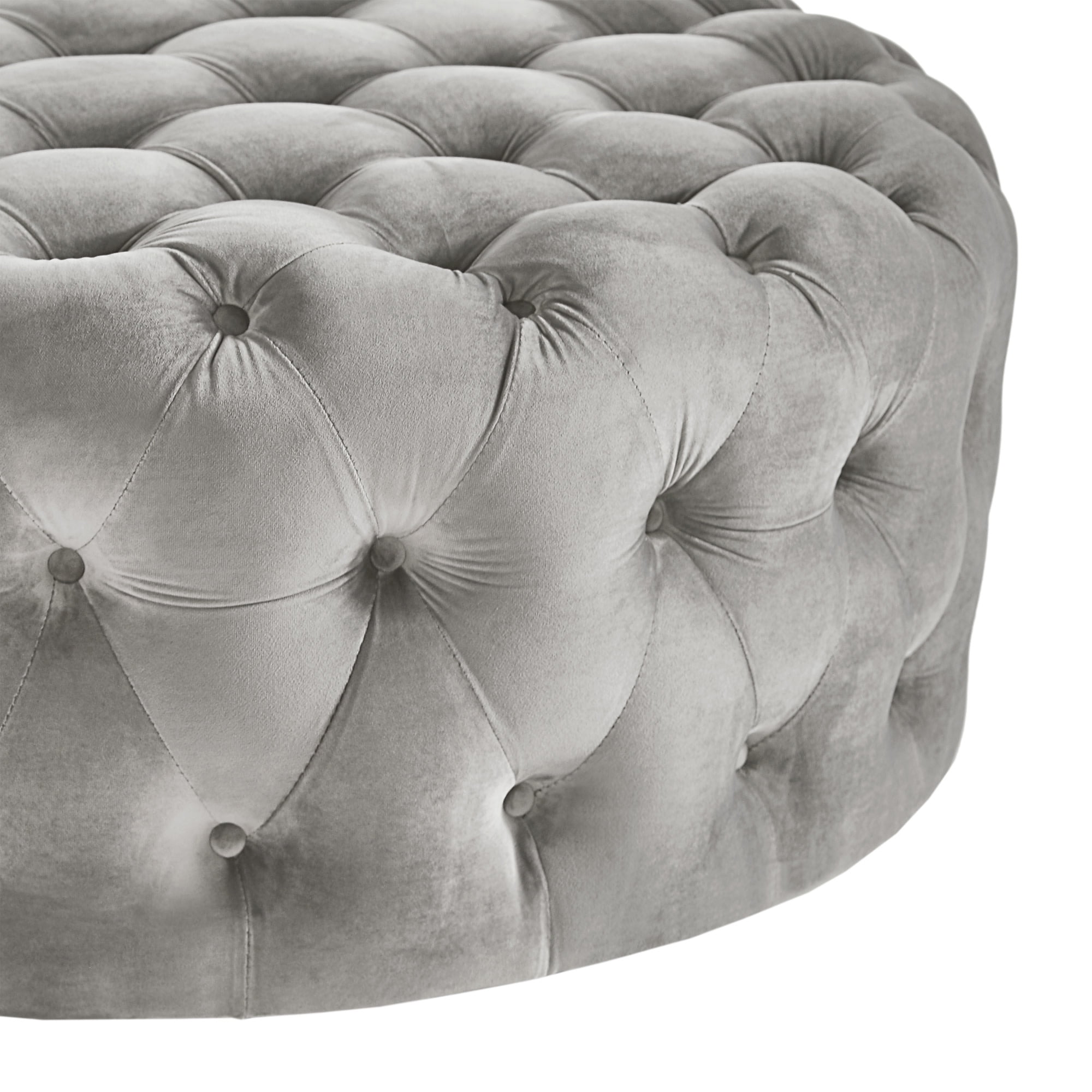 Includes one grey (1) round ottoman Overall dimensions: 41.75 in. diameter x 16 in. height All-over button tufting Soft fabric upholstery Five (5) non-locking casters Crafted with plywood, fabric, and foam Ships in one (1) box