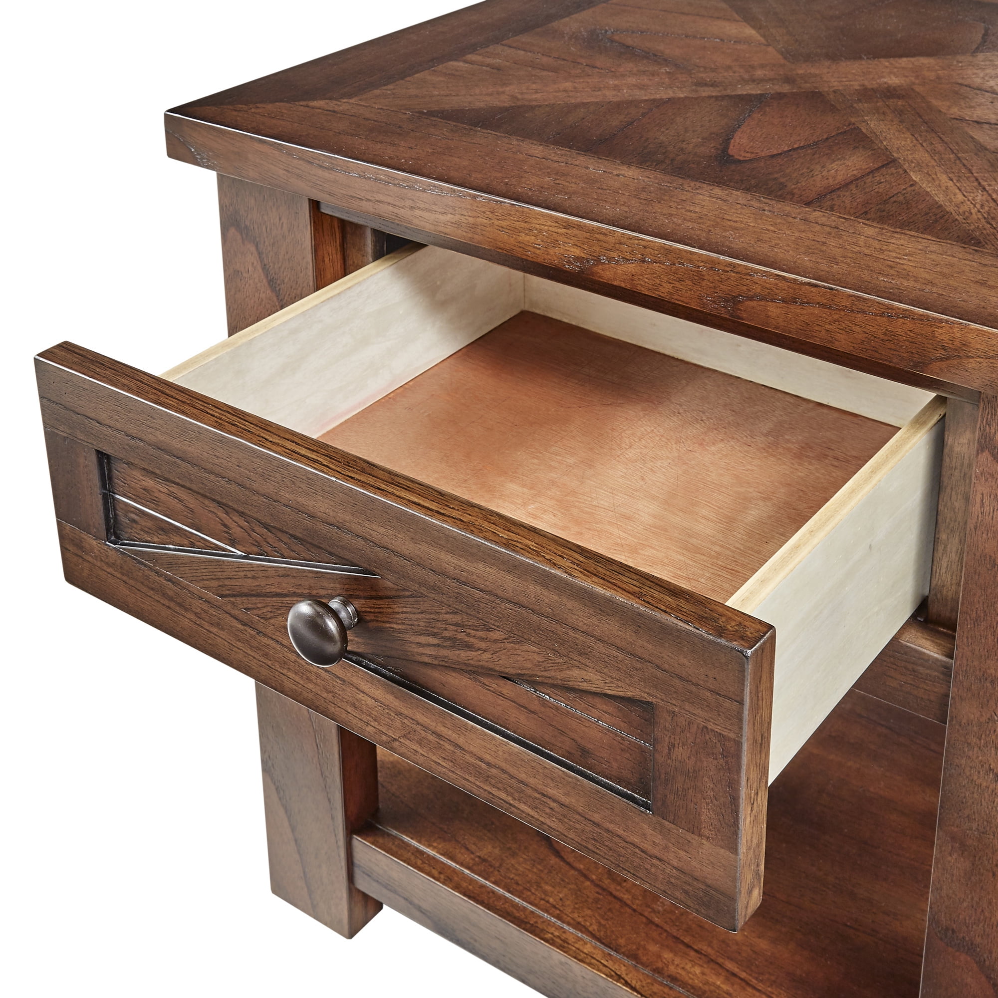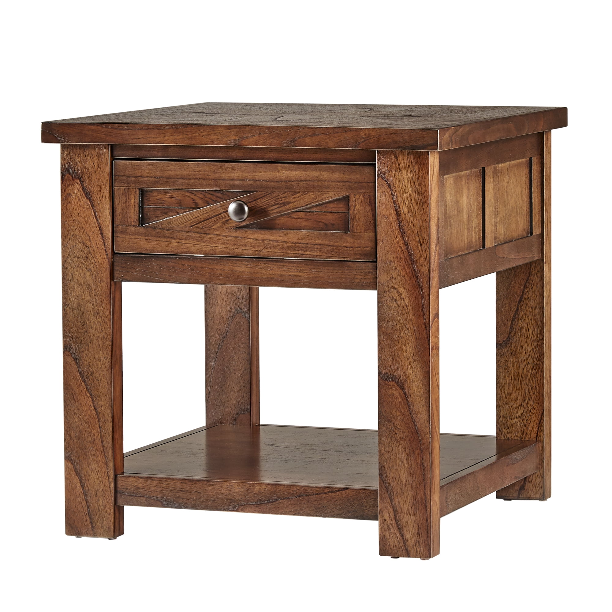 Barn door-like front wood design One (1) drawer provides storage for small essentials One (1) bottom shelf for additional display space Brown cherry finish for classic style Drawer features a safety stop and self-close design Dimensions: 24L x 24W x 24H x in. Ships in 1 box
