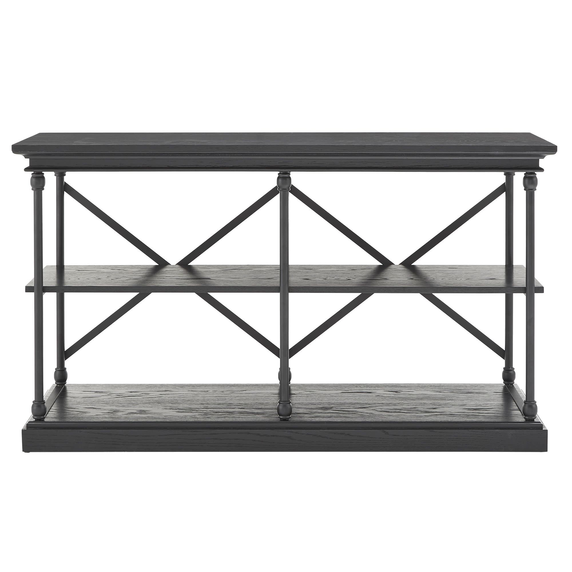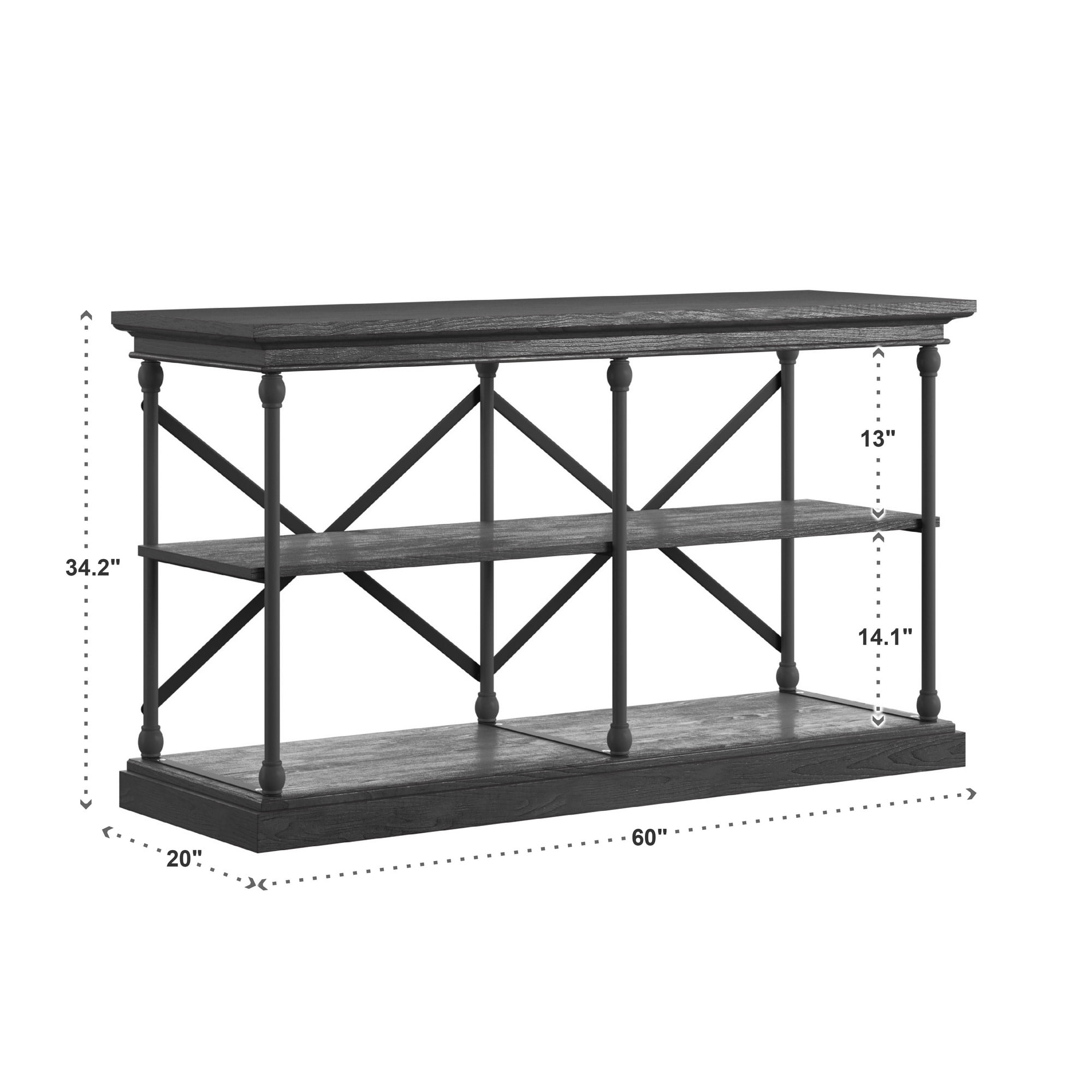 Includes one (1) black finish console table with two (2) shelves Can hold Tv’s up to 65″ Features an X-Back Overall dimensions: 60 in. width x 19.4 in. depth x 34 in. height Bottom shelf: 55 in. width x 15.9 in. depth x 13.5 in. height Middle shelf: 58.1 in. width x 15.9 in. depth x 13.5 in. height Height from inner bottom shelf to bottom of the top shelf: 27.7 in. Powder-coated black metal finish Visible wood grain finish shelves The underside of the shelves is not finished Constructed with wood, veneer, and iron tube Assembly required Ships in one (1) box Available in black, brown, grey and ivory white finishes