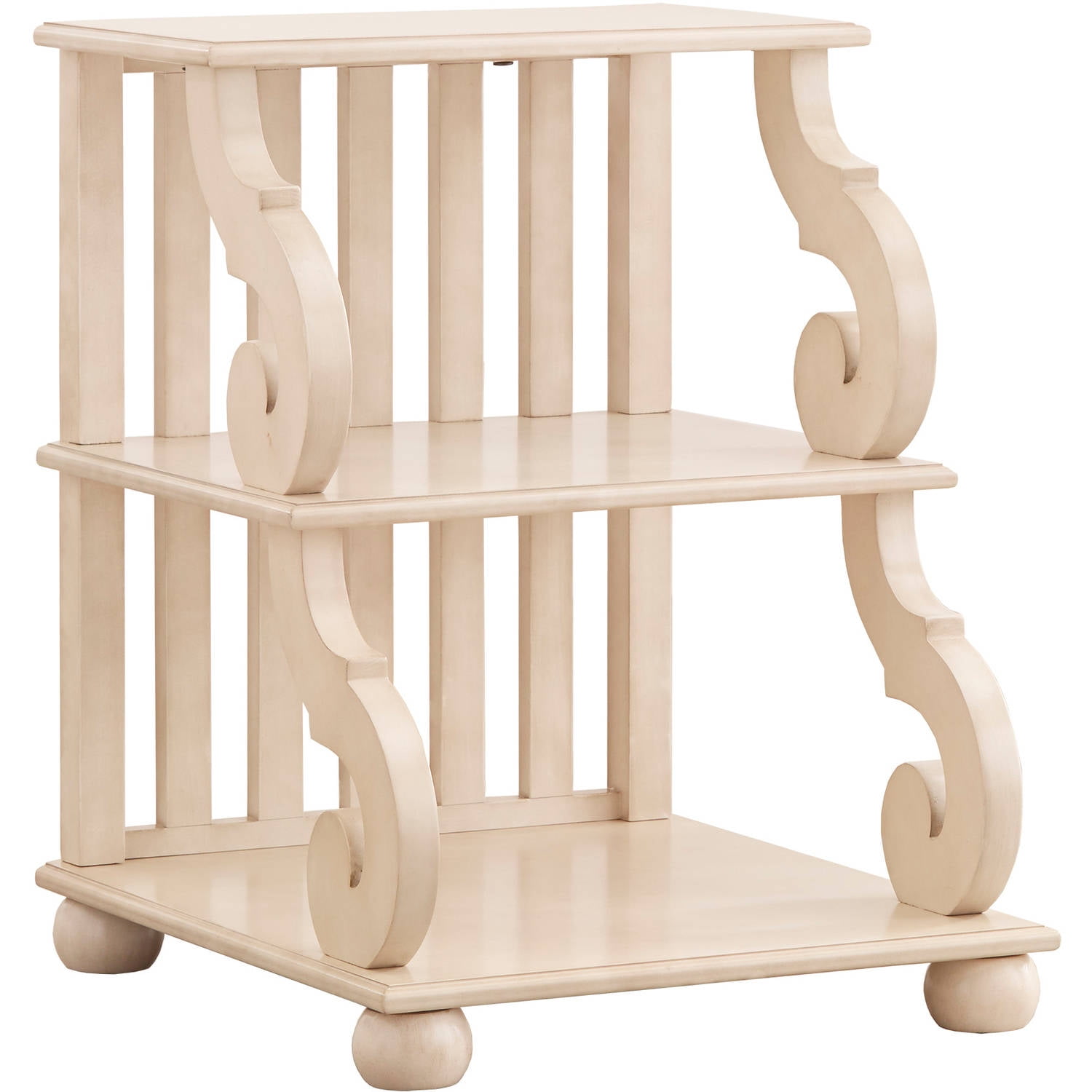 Add a traditional touch to your home with this unique and charming end table! The antique white finish showcases a natural wood grain, creating a refined rustic flair. Graceful wood scrollwork imbues the pieces with an vintage feel while the three tiered design offers extra storage and display space for books, magazines, picture frames, decorative items and more. Give your family room or living room a fresh style with this beautiful end table.