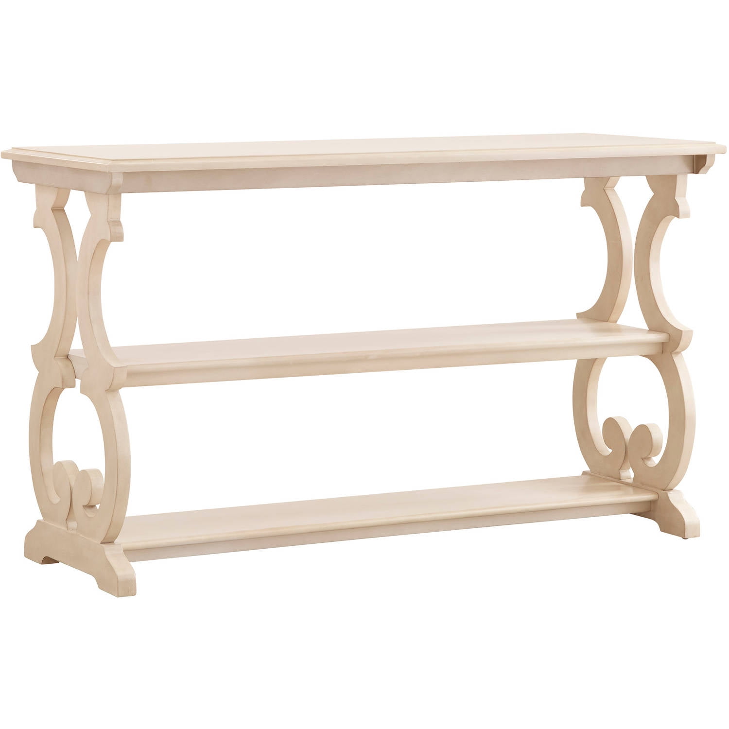 Add a traditional touch to your home with this unique and charming sofa table! The antique white finish showcases a natural wood grain, creating a refined rustic flair. Graceful wood scrollwork imbues the pieces with a vintage feel while three spacious shelves offer extra storage and display space for books, magazines, picture frames, decorative items and more. Give your living room, foyer, entryway or hallway a fresh style with this beautiful sofa table.
