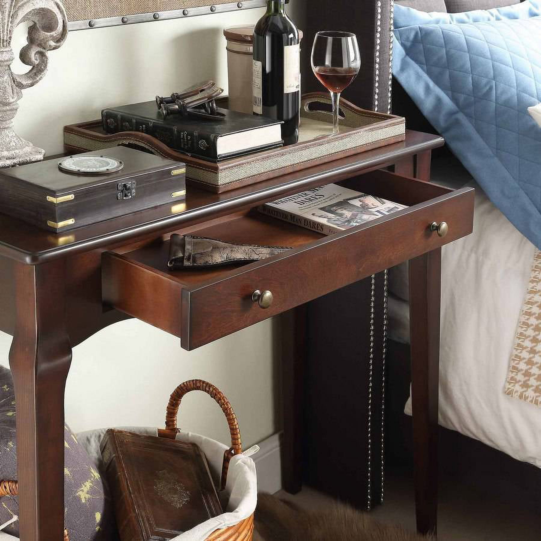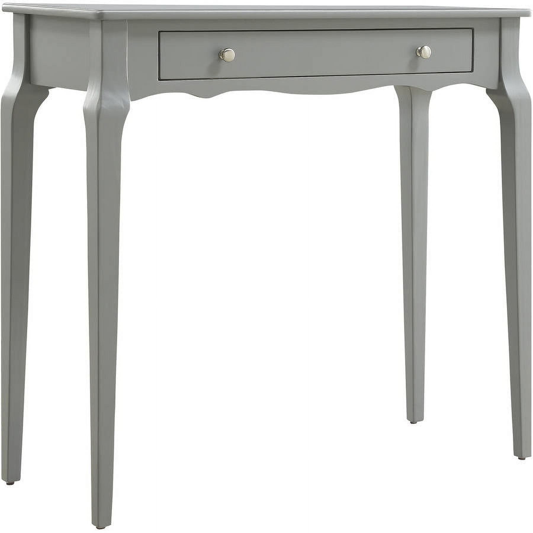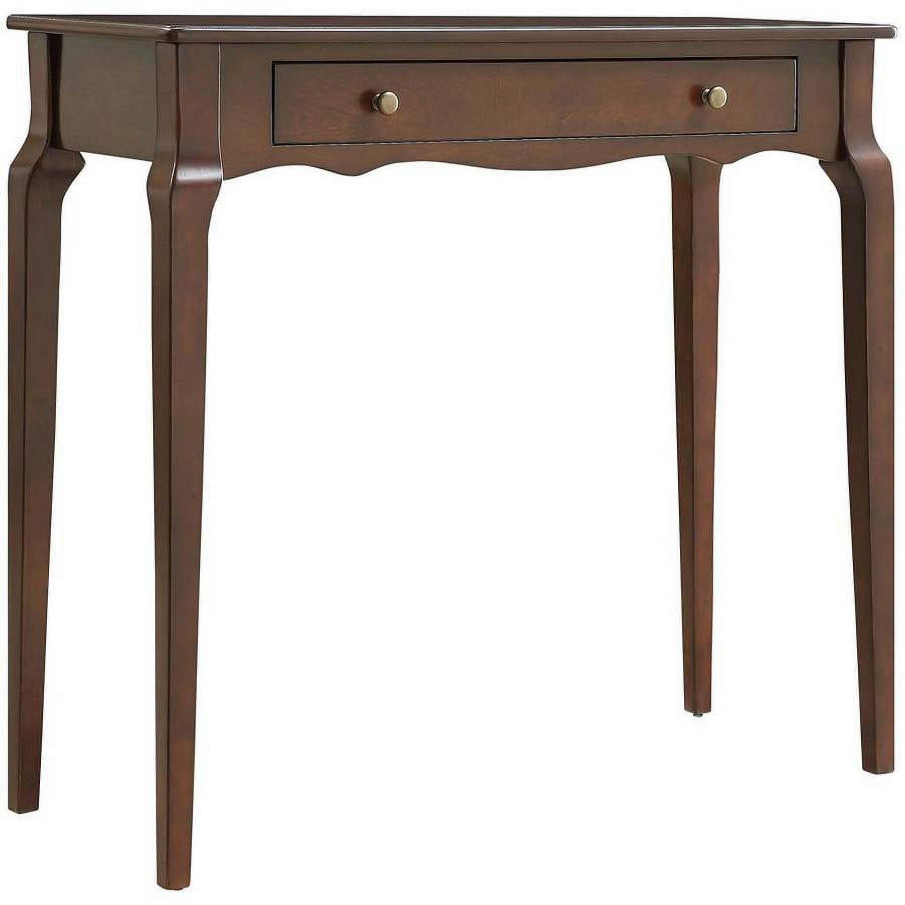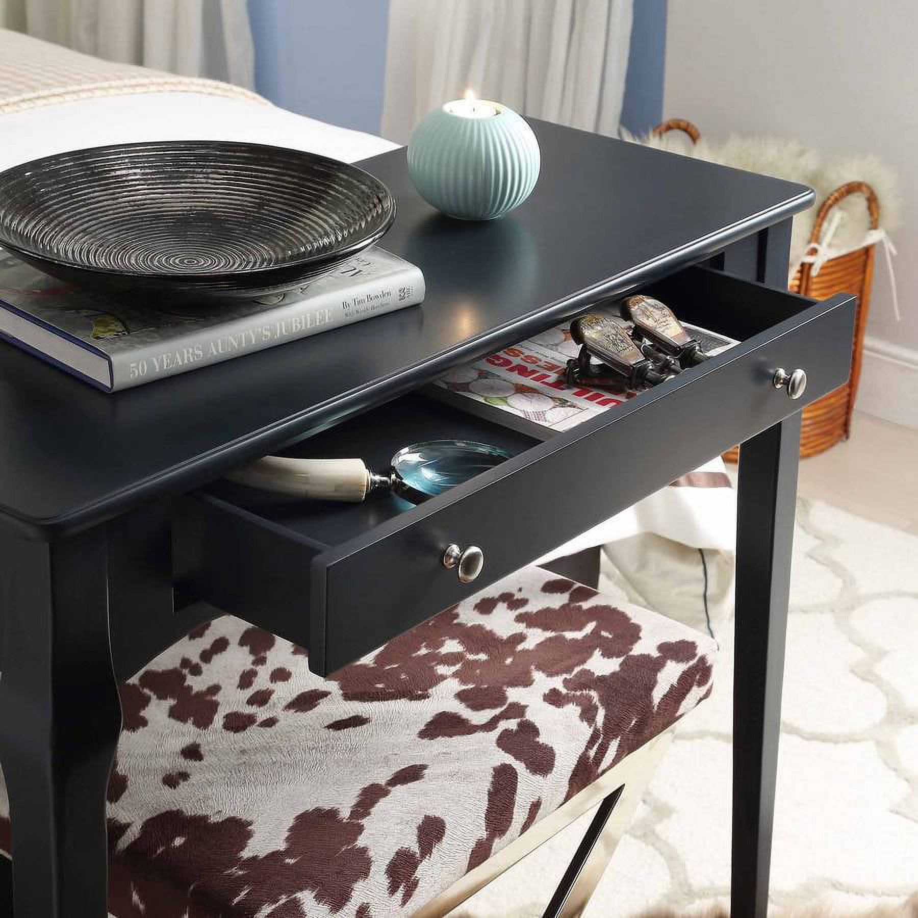 Materials: Rubberwood, birch veneer Bright nickel finish on drawer pull Under table clearance: 26.75″ Drawer interior dimensions: 23.5″ W x 9.25″ D x 2″ H Dimensions: 36″ W x 14″ D x 32.75″ H