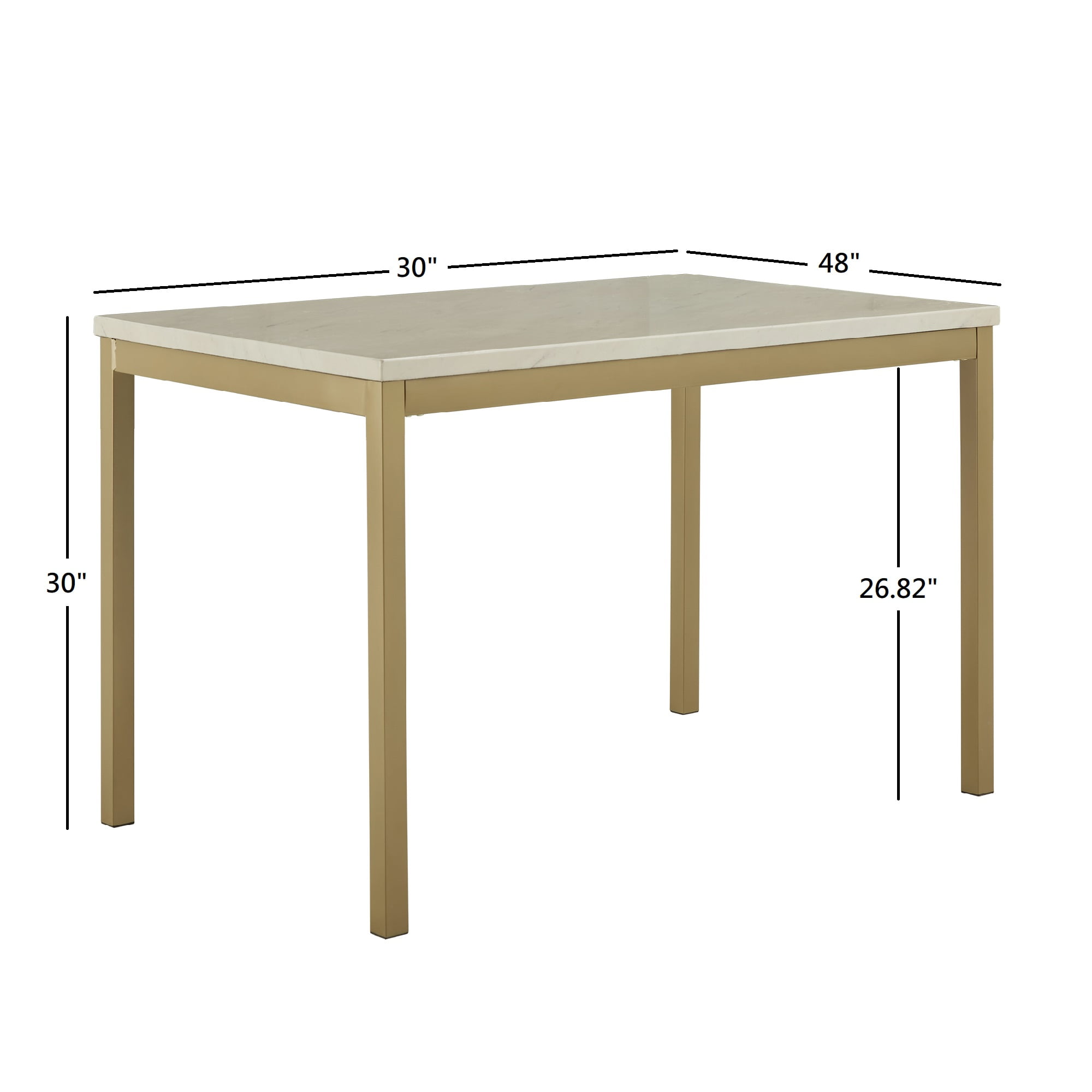 Includes one (1) 48-inch Dining table Gold metal finish The white faux marble tabletop Crafted with metal, MDF, and paper Dimensions: 30 in. D x 48 in. W x 30 in. H Under table clearance: 26.82 in Product Weight: 39.6 lb Assembly required Ships in one (1) box