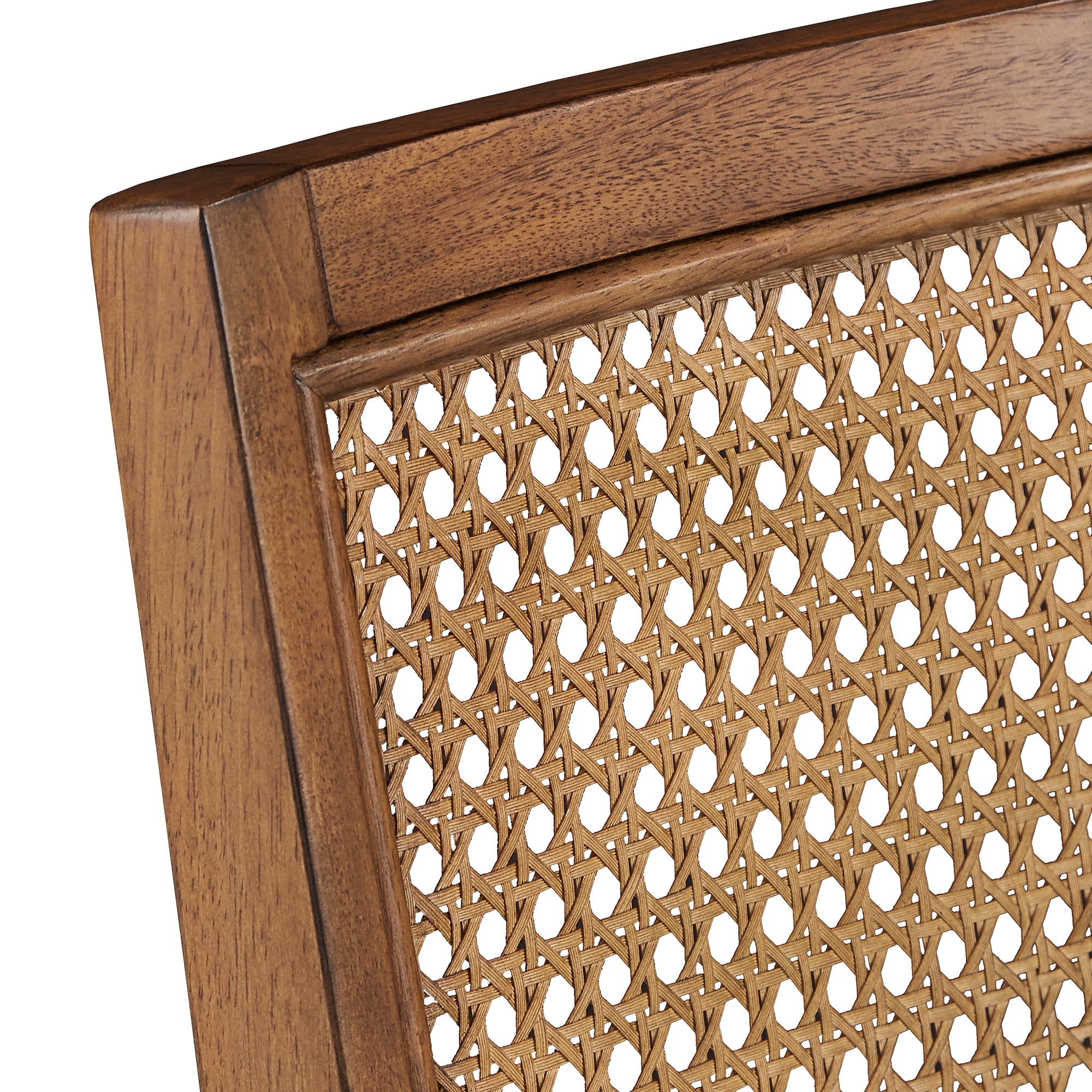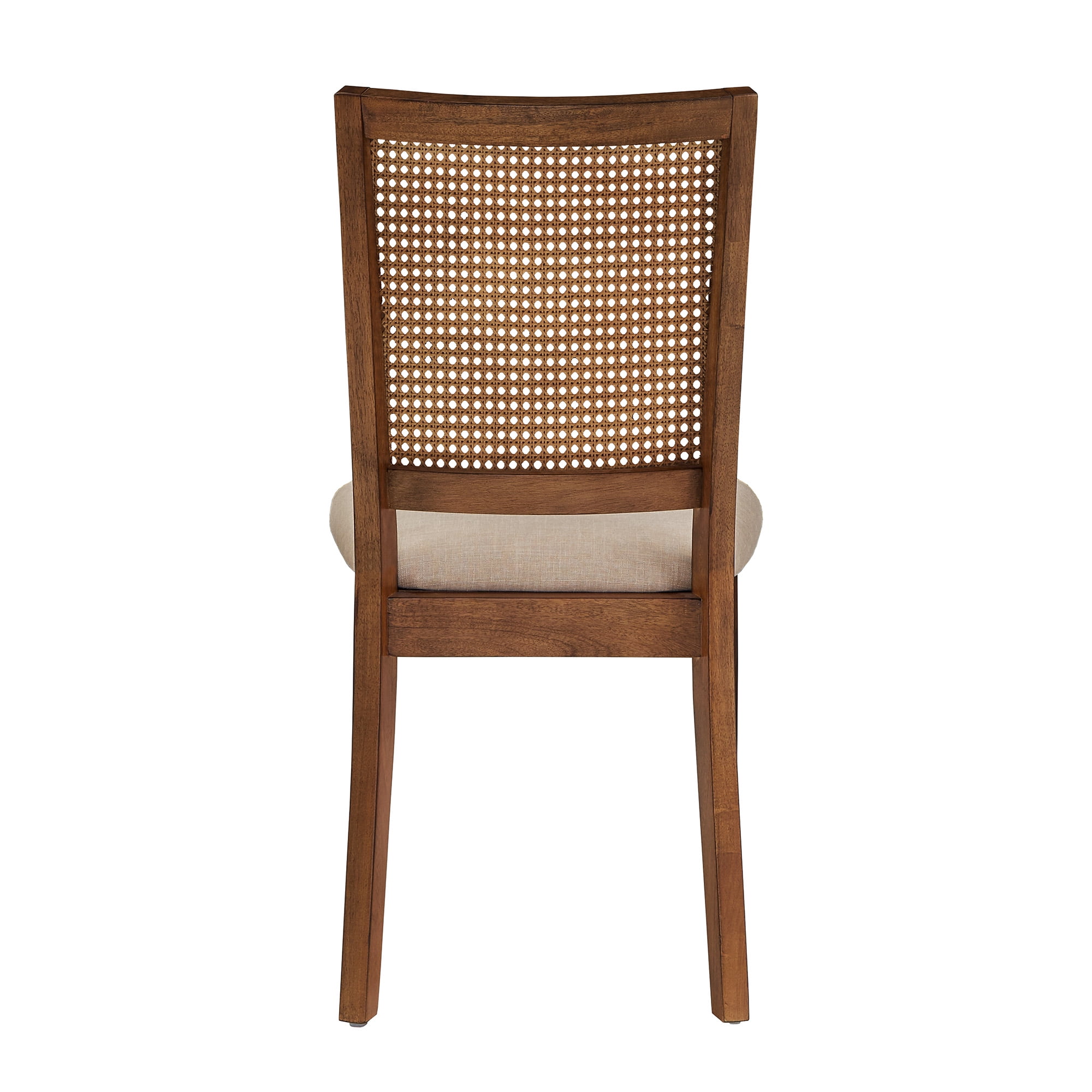 Features: Set includes two (2) dining chairs Overall dimensions: 18 in. width x 22 in. depth x 36.5 in. height Beige linen-upholstered seats Synthetic rattan chair backs Distressed wood finish Multiple antique finishes for the frame Assembly required Ships in one (1) box
