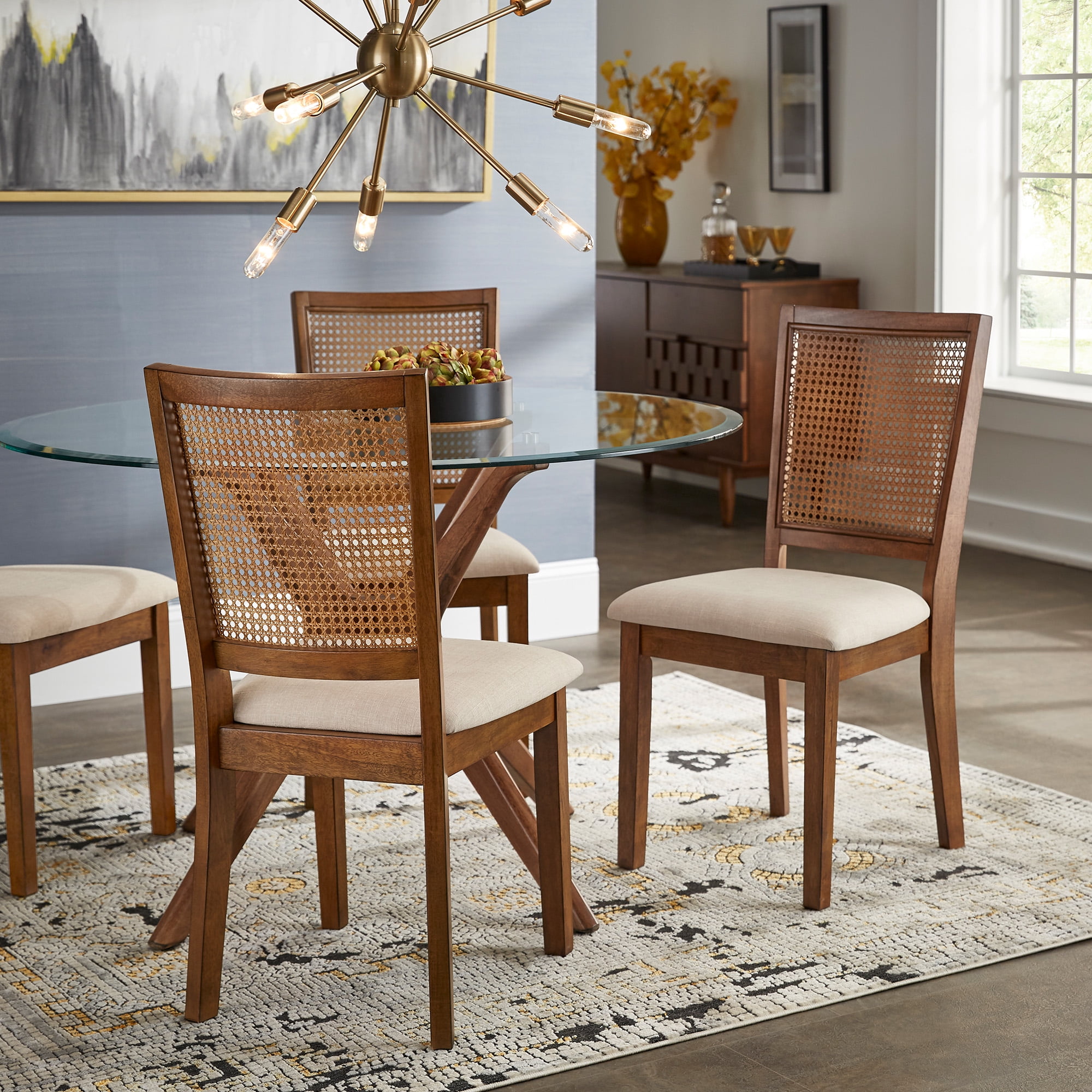Add a timeless classic to your dining ensemble with the Farmhouse Beige Linen Rattan Back Dining Chairs (Set of 2) from Weston Home. The perfect farmhouse aesthetic is created, thanks to the exposure. The seats are also padded with foam to provide plush comfort every time you dine. Several antique finishes are available to choose from for the frame, both to enhance the vintage-inspired look and to let you show off your unique tastes. Constructed from durable rubberwood, this set of two chairs works great in casual dining settings. Weston Home Farmhouse encompasses traditional and transitional designs. Taking cues from time-honored craftsmanship, these pieces simultaneously draw from tried and true roots and contemporary elements.