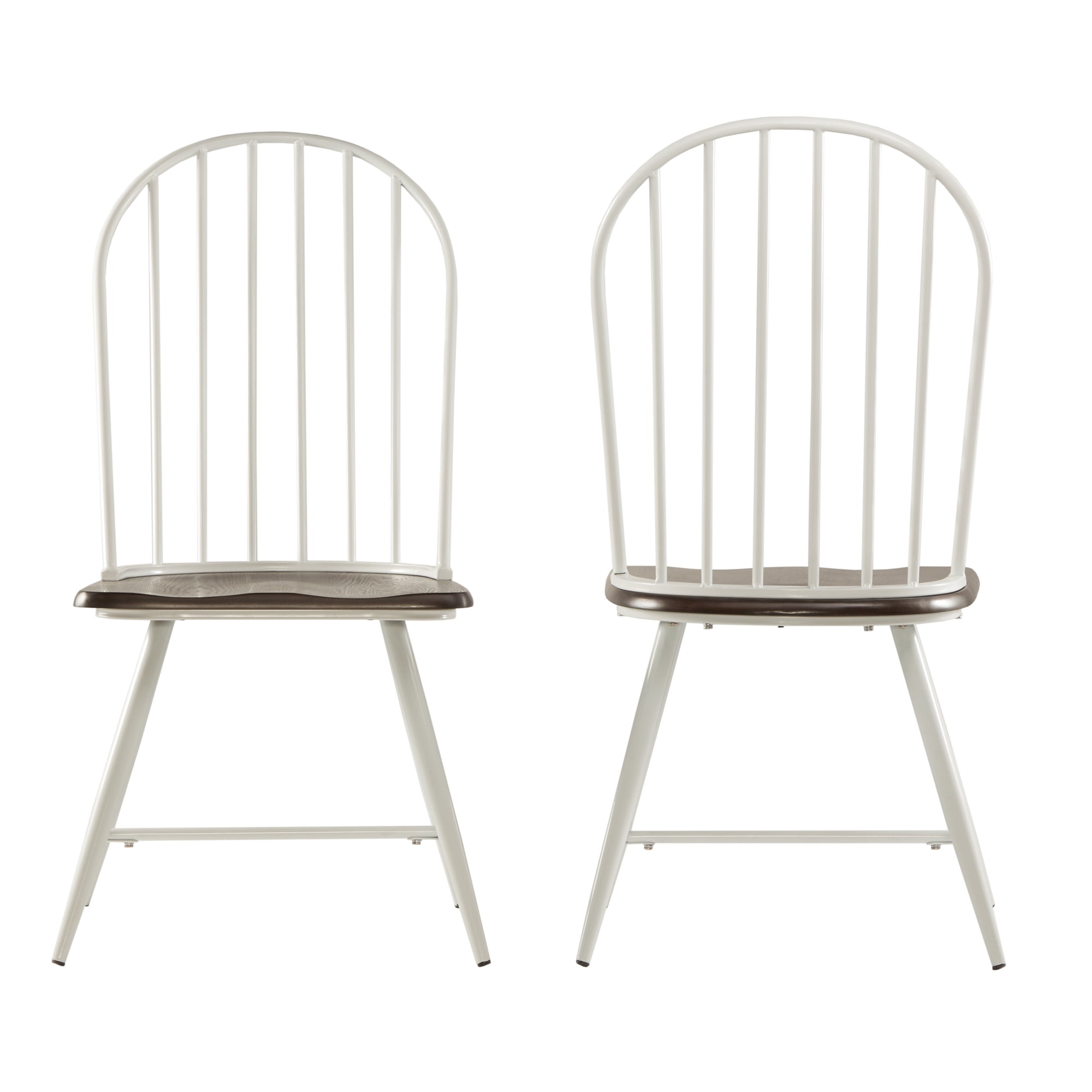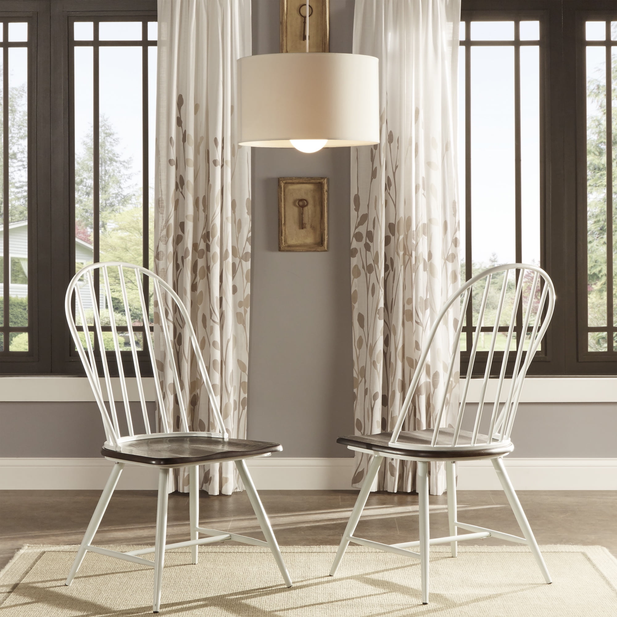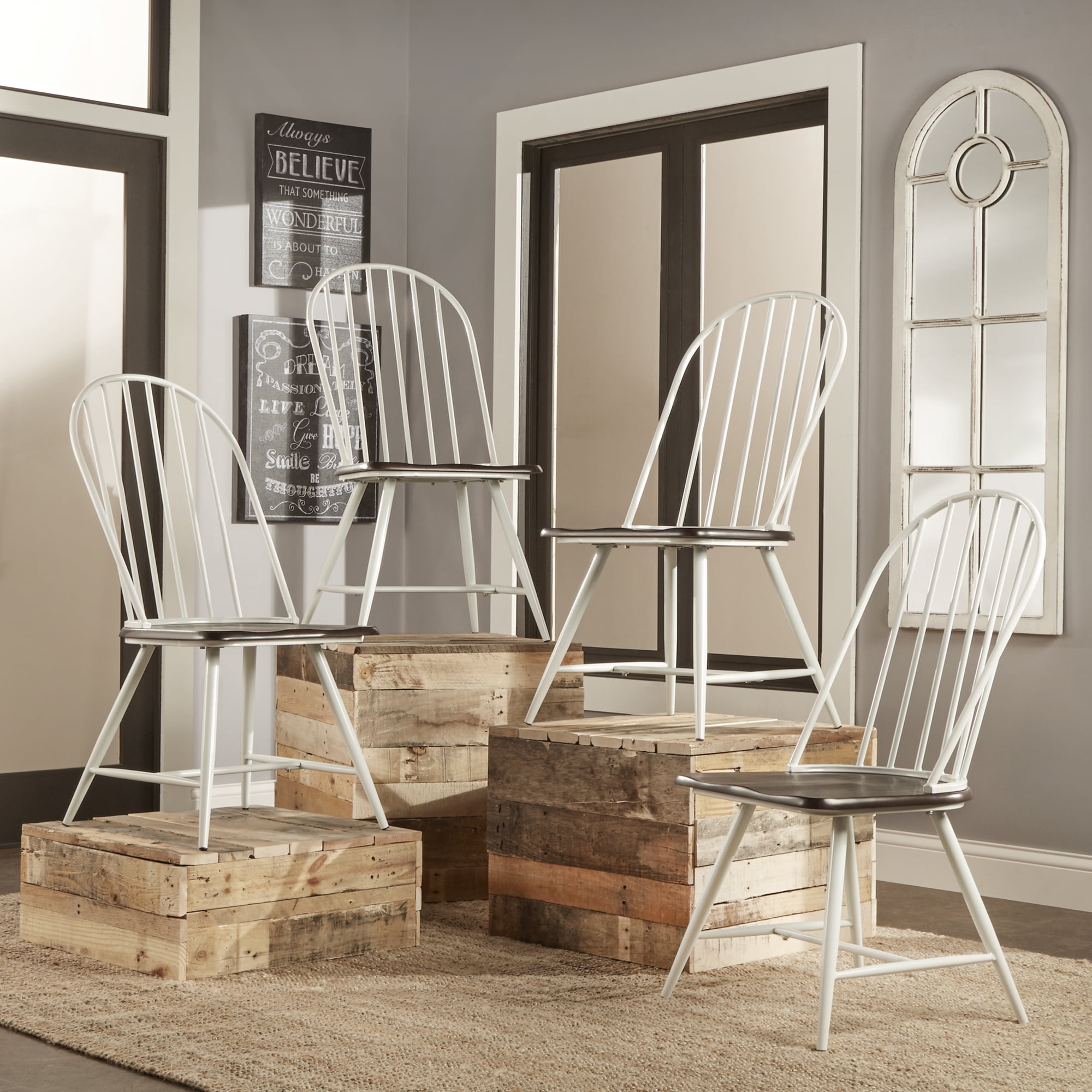Indulge in a style that is both modern and minimalist with the Weston Home Jameson Set of 4 (four) Two-tone Windsor chairs. A classic design finished in a dark oak molded wood seat and contrasted by either black or white metal frame with angled legs will fit right at home with your existing decor. Arrange them around matching dining table or add more seating in the living room. The possibilities are endless when you have four chairs to spread.
